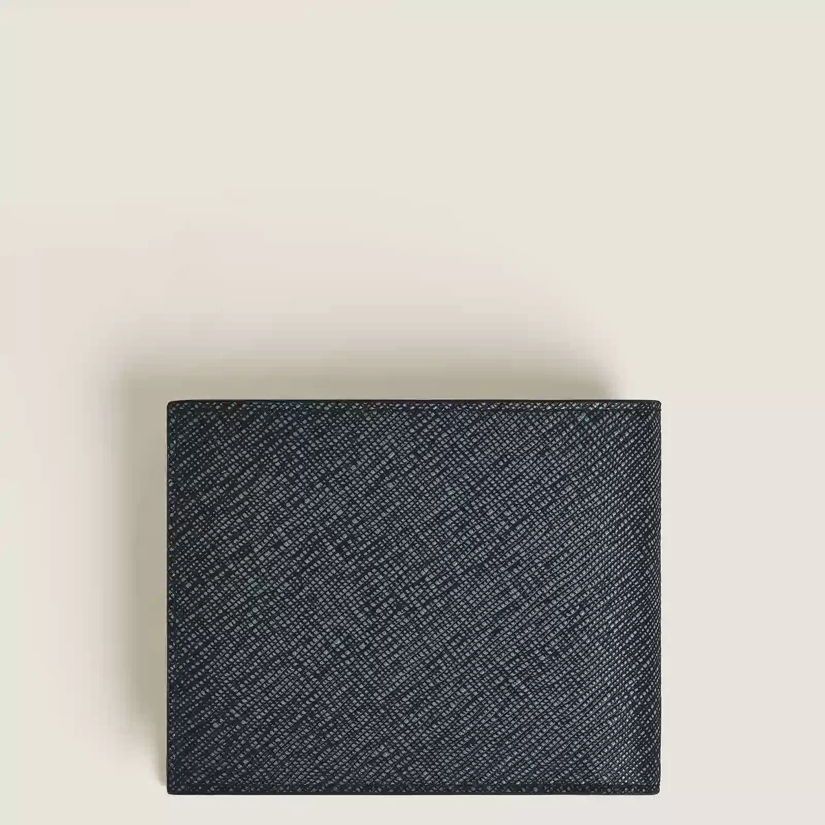 Diese Brieftasche ist ein unverzichtbares Accessoire für die Hosentasche und besteht aus zweifarbig geprägtem Leder in einer klassischen Kombination aus Blau und Schwarz. Sie wurde für eine mühelose Organisation entwickelt und verfügt über Fächer für bis zu sechs Kreditkarten, zwei Fächer für Banknoten und zwei zusätzliche Fächer für kleinere Gegenstände, wodurch sie praktisch und gleichzeitig raffiniert ist.