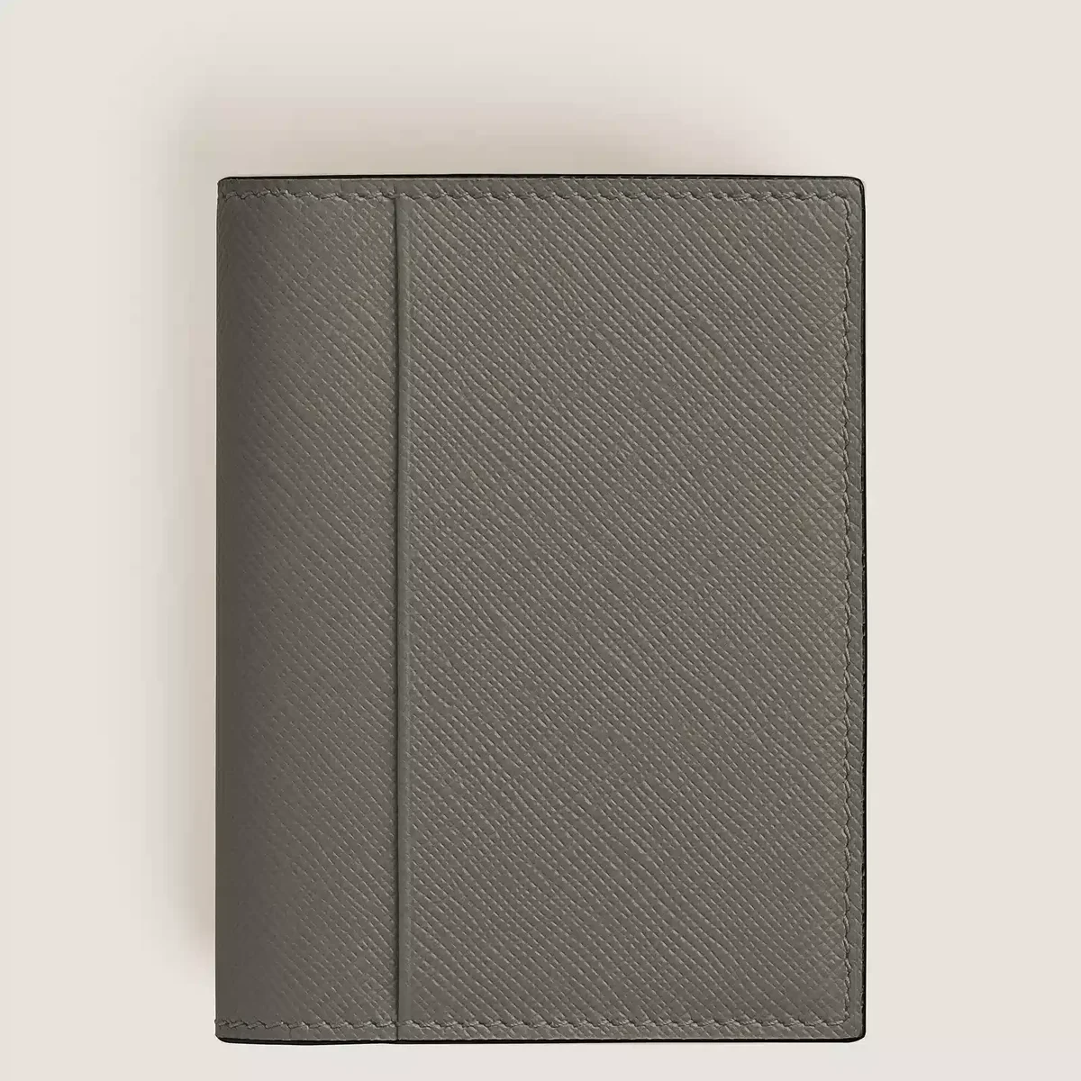 Obwohl dieser Lederkartenhalter kompakt ist, erweist er sich mit seinen funktionalen Details sowohl außen als auch innen als wahrhaft vielseitiger Begleiter. Im Inneren befinden sich drei Kreditkartenfächer und ein Visitenkartenfach sowie eine zusätzliche Tasche. Er ist aus mittelgrauem Saffiano-Leder gefertigt und verfügt außen über ein zusätzliches Fach für eine vierte Kreditkarte.