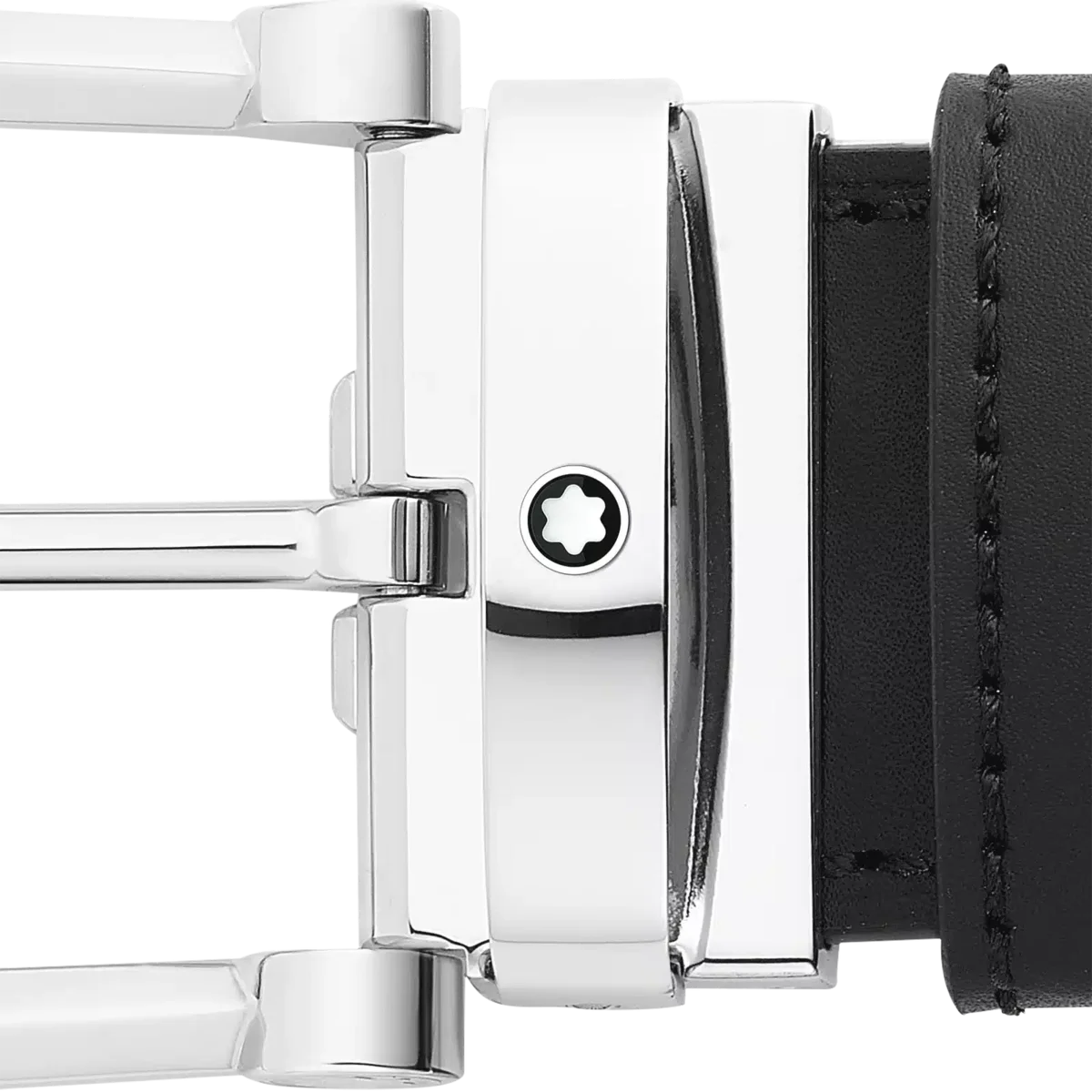 Glänzende Edelstahl-Schnalle in Hufeisenform. Selbstverstellbarer, 3,5 cm x 120 cm großer, wendbarer Lederriemen in Schwarz und Blau. Lässig und raffiniert.