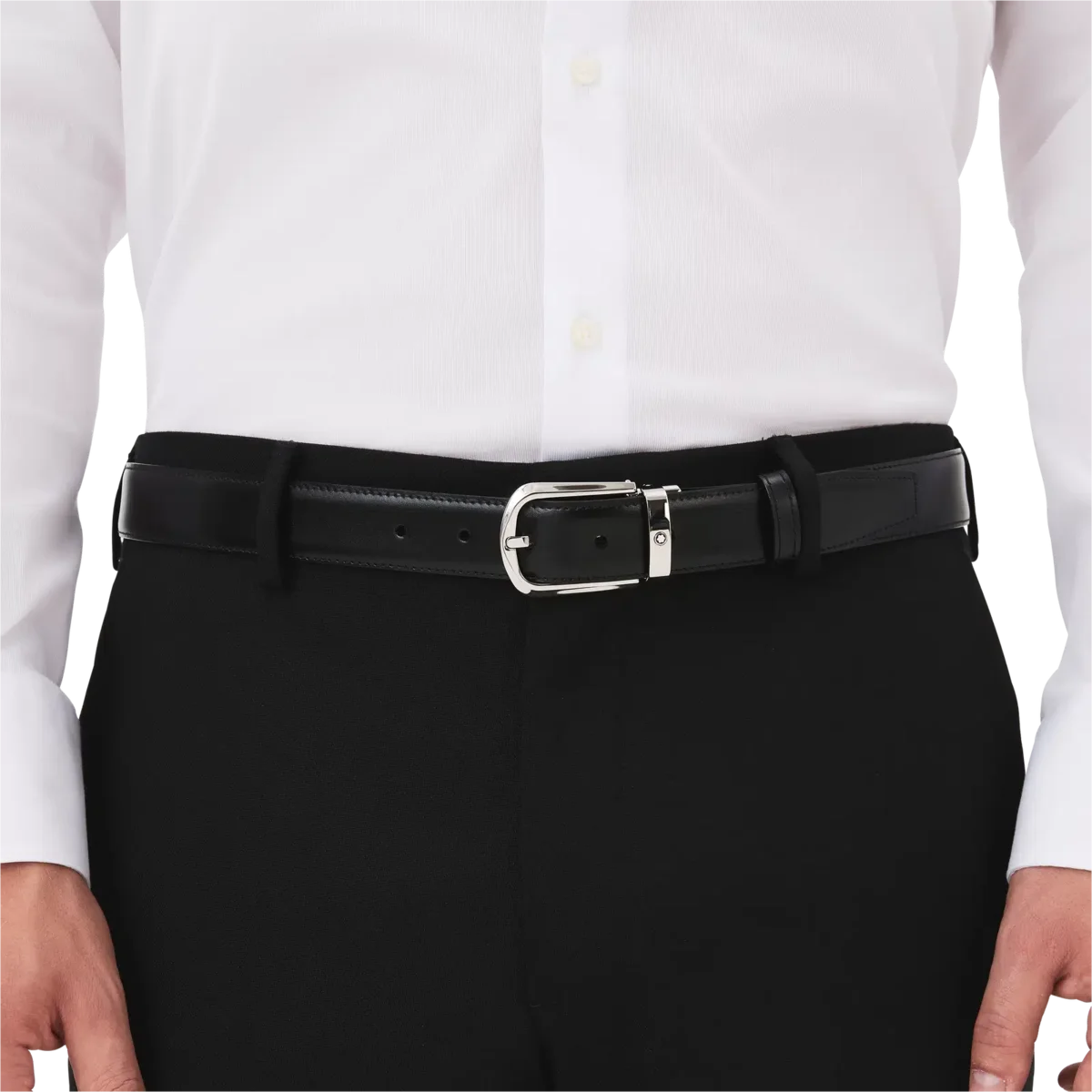 Gebogene Hufeisen-Schnalle aus glänzendem Edelstahl. Selbstverstellbares, 3 cm x 120 cm großes, wendbares Lederarmband in Schwarz und Braun
