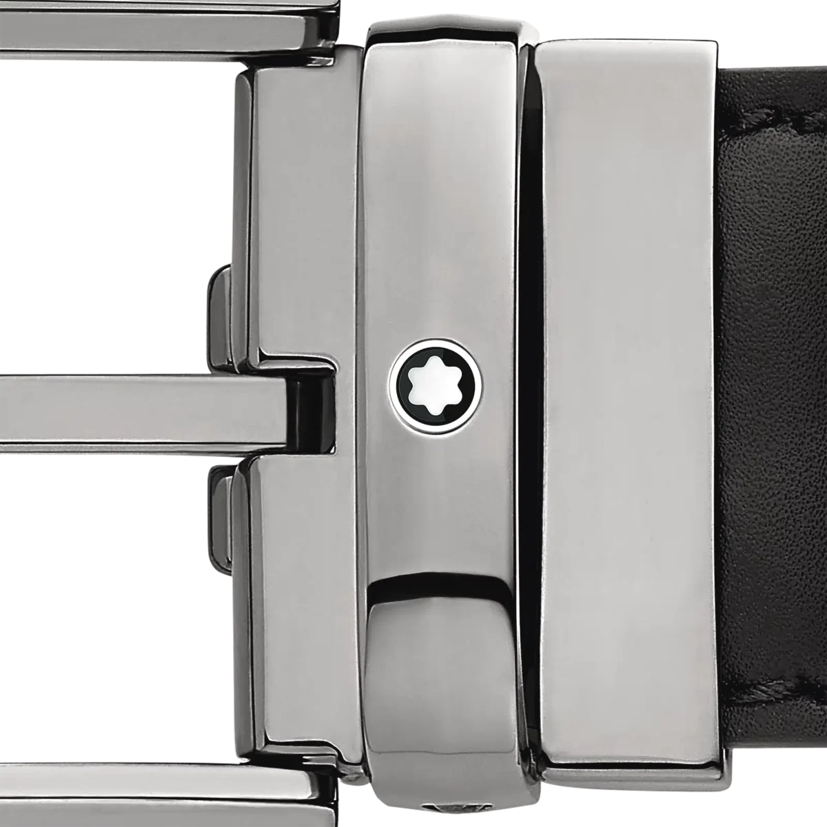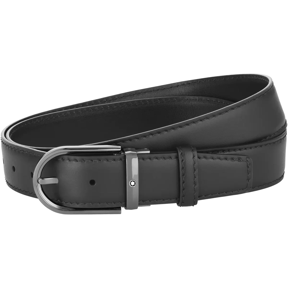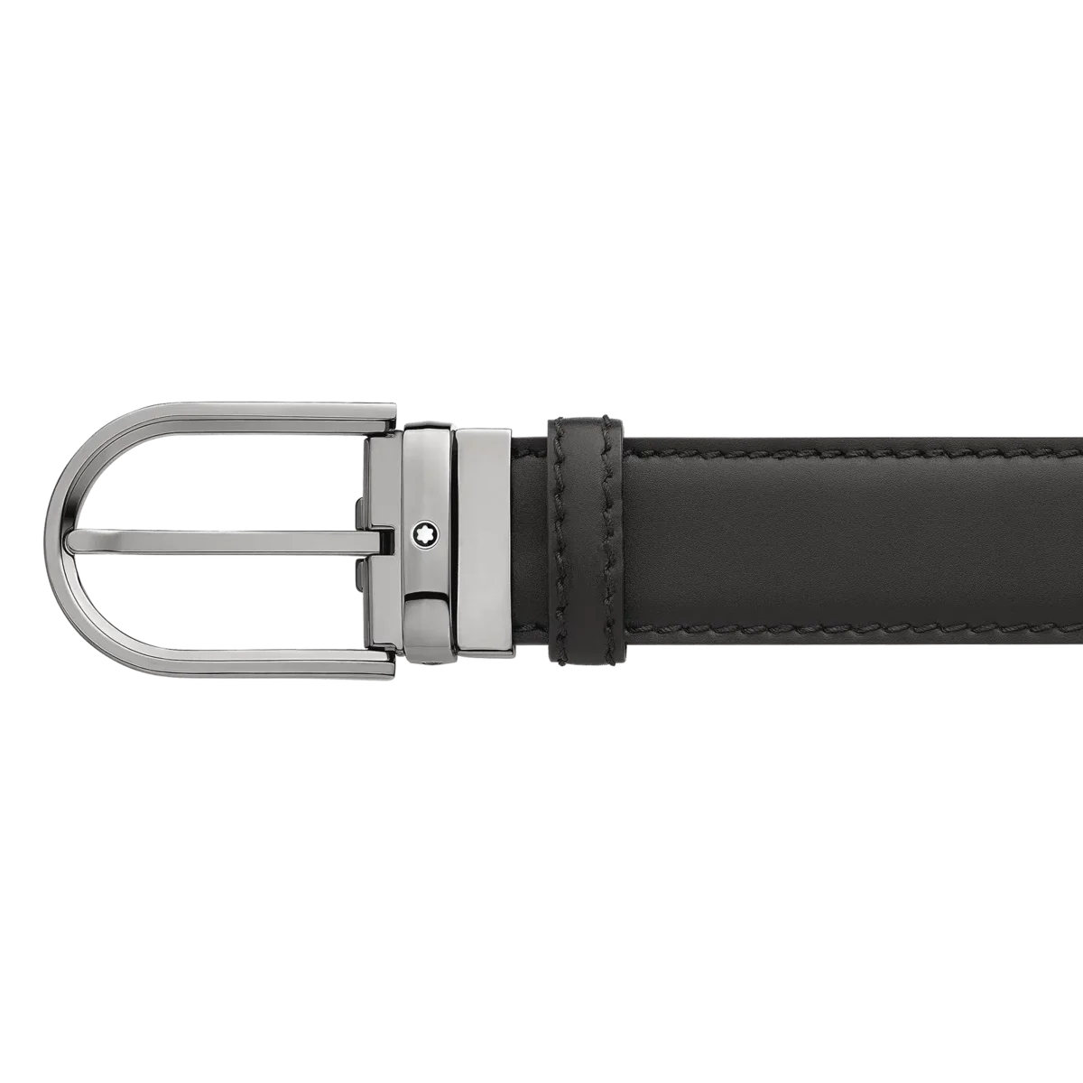 Glänzende Schnalle mit Hufeisen-Finish aus Ruthenium. Selbstverstellbar, 3,5 cm x 120 cm, mit schwarzem Lederriemen und Ziernähten. Entworfen für einen klassischen Look mit dem gewissen Etwas.