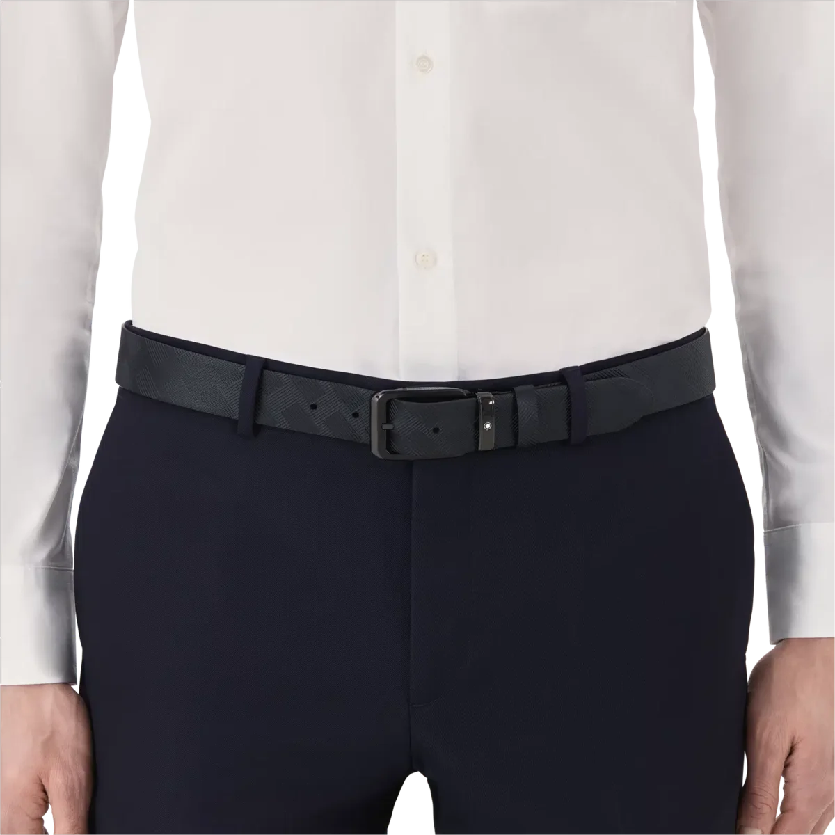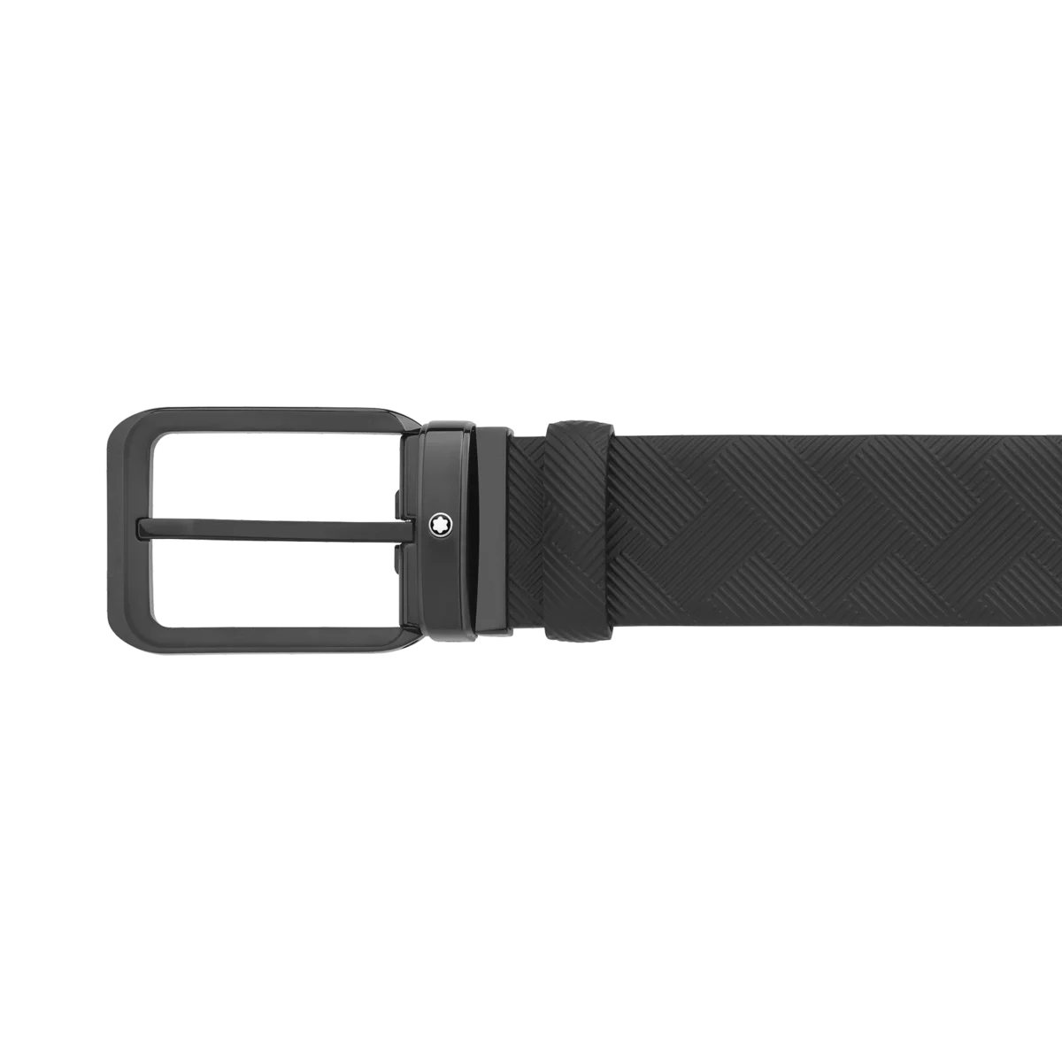 Rechteckige, abgerundete, glänzende Dornschließe aus Edelstahl mit mattschwarzer PVD-Beschichtung. Selbstverstellbarer, 3,5 cm x 120 cm großer, wendbarer Riemen aus schwarzem bedrucktem Leder mit Montblanc Extreme 3.0-Motiv auf der einen Seite und schwarzem Glattleder auf der anderen Seite. Entworfen für einen sportlichen Look.
