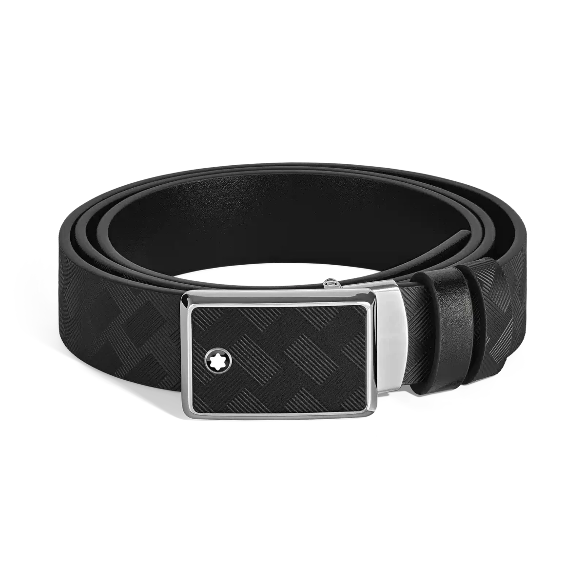 Der wendbare 35-mm-Gürtel kombiniert das schlanke Design einer rechteckigen Schnalle mit der Vielseitigkeit von zwei unterschiedlichen Lederriemen. Die Schnalle mit glänzender Palladium-Oberfläche und schwarzen Lederdetails mit Extreme 3.0-Prägung verleiht Ihrem Stil einen Hauch von zurückhaltender Eleganz. Der Gürtelriemen bietet Vielseitigkeit und Raffinesse und vereint zwei unterschiedliche Looks in einem Accessoire. Eine Seite präsentiert sich in schwarzem Extreme 3.0-bedrucktem Leder mit einem auffälligen, strukturierten Design, während die Rückseite aus glattem, schwarzem Weichleder für ein zeitloses, elegantes Finish sorgt.