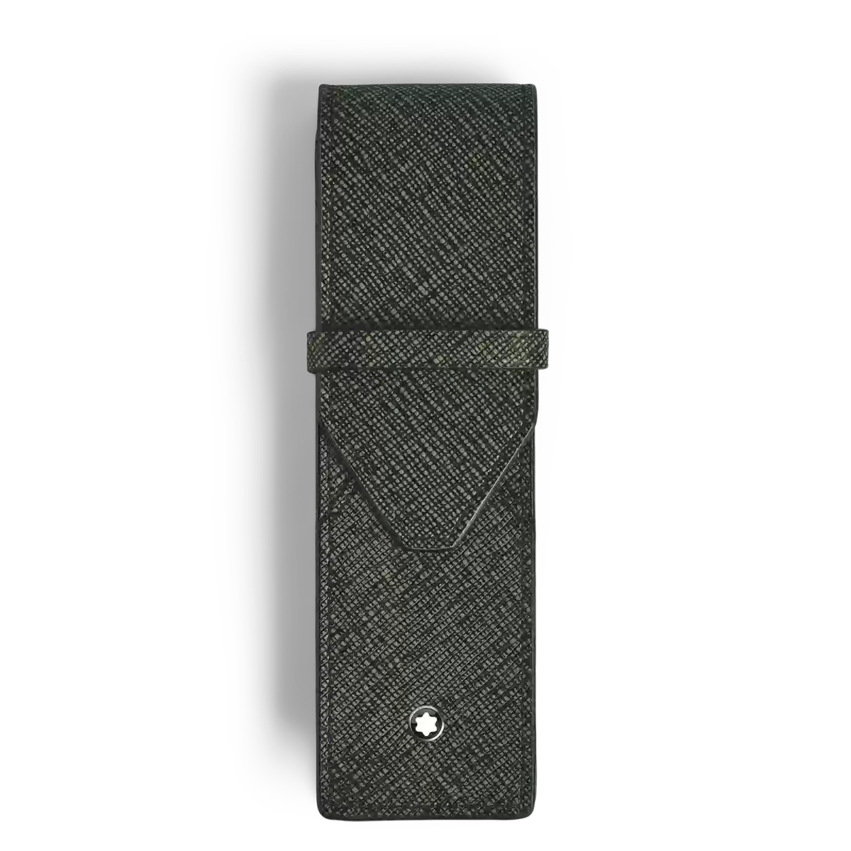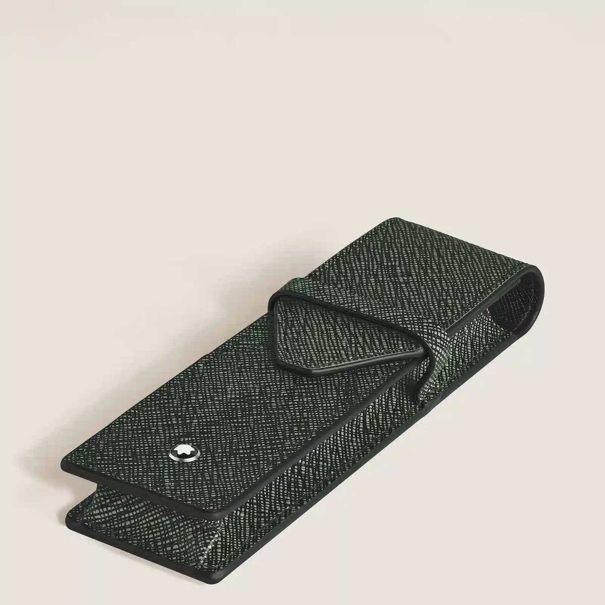 Dieses elegante und raffinierte Accessoire ist für die Aufbewahrung von bis zu zwei Schreibgeräten konzipiert. Es ist aus geprägtem Sartorial-Leder in einer eleganten zweifarbigen Kombination aus klassischem Khaki und Schwarz gefertigt. Seine überlappende Silhouette ist von der Form eines Umschlags inspiriert und eine Hommage an die Kultur des Schreibens.