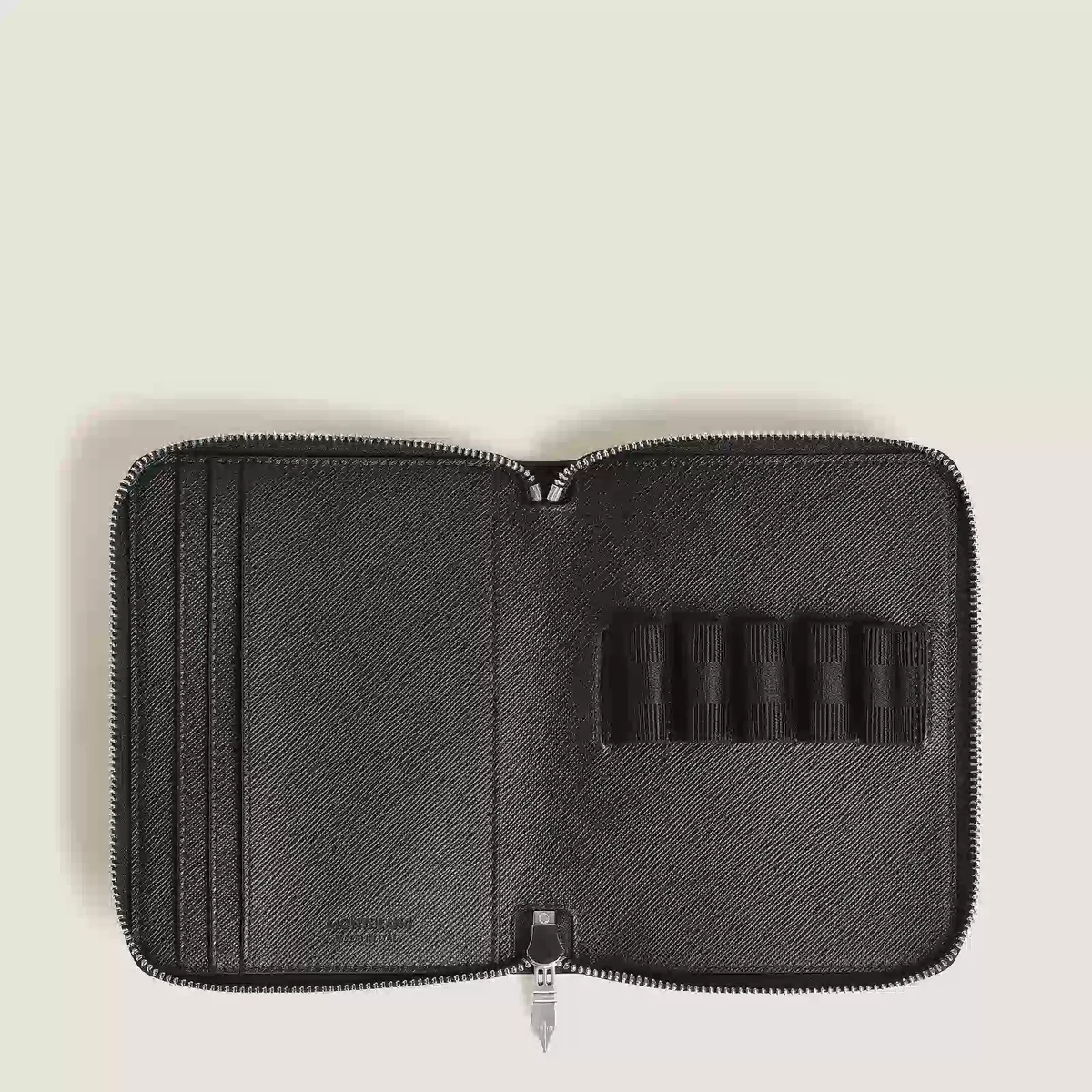 Dieses Federmäppchen bietet Platz für bis zu fünf Schreibgeräte in der Größe des Meisterstück Classique oder LeGrand und ist sowohl praktisch als auch raffiniert. Es ist aus geprägtem Sartorial-Leder in klassischem Schwarz gefertigt und verfügt über einen markanten Reißverschlusszieher in Form einer Feder, eine subtile Hommage an die Schreibkunst von Montblanc. Stilvoll und sicher – eine elegante Möglichkeit, Ihre wertvollsten Stifte aufzubewahren und zu transportieren.