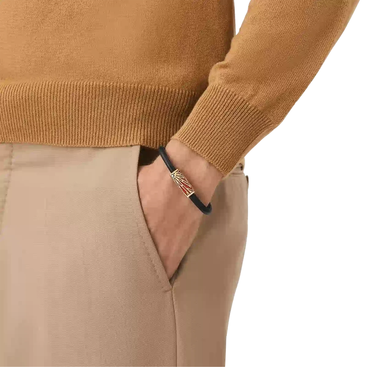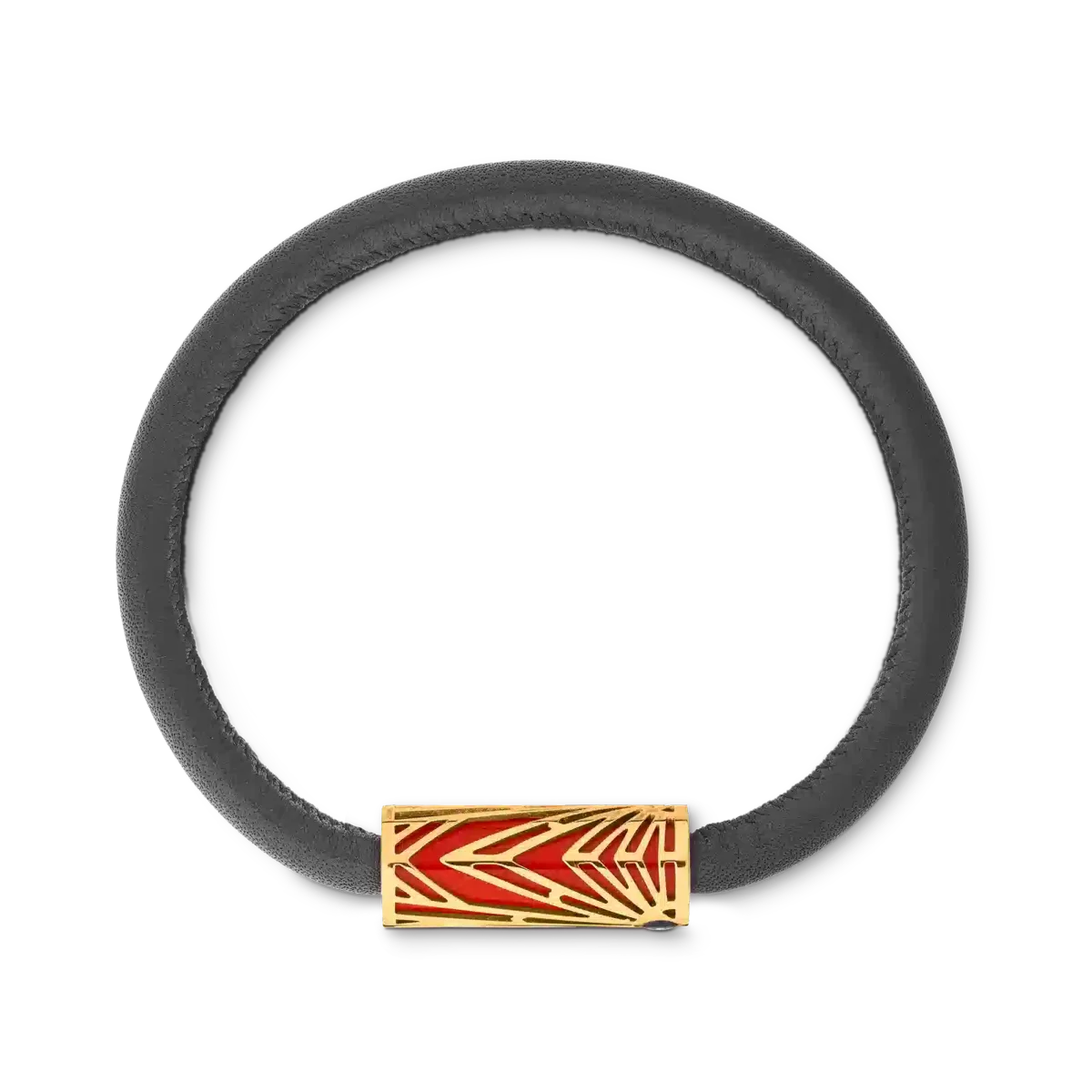 Das Schmuckstück hat ein schwarzes Lederarmband und ein Rohr aus Edelstahl mit PVD-Beschichtung und Korallenlack (Größe 60). Es ist vom Archivmuster Solitaire inspiriert.