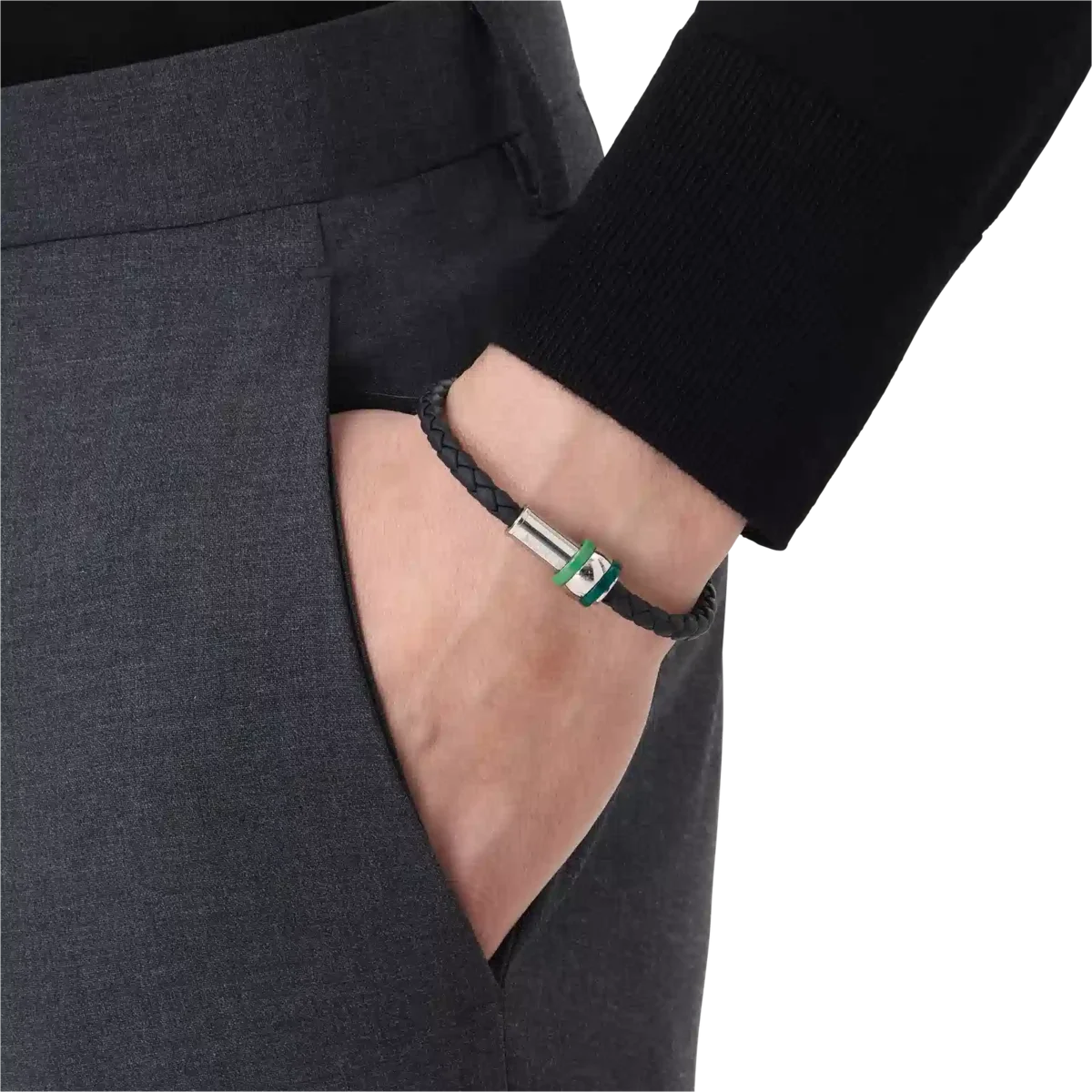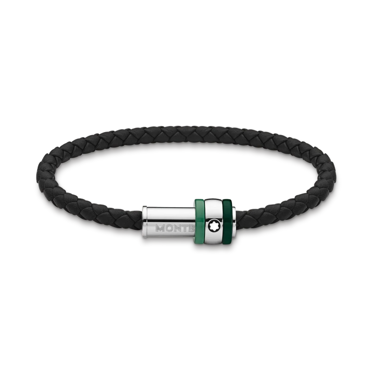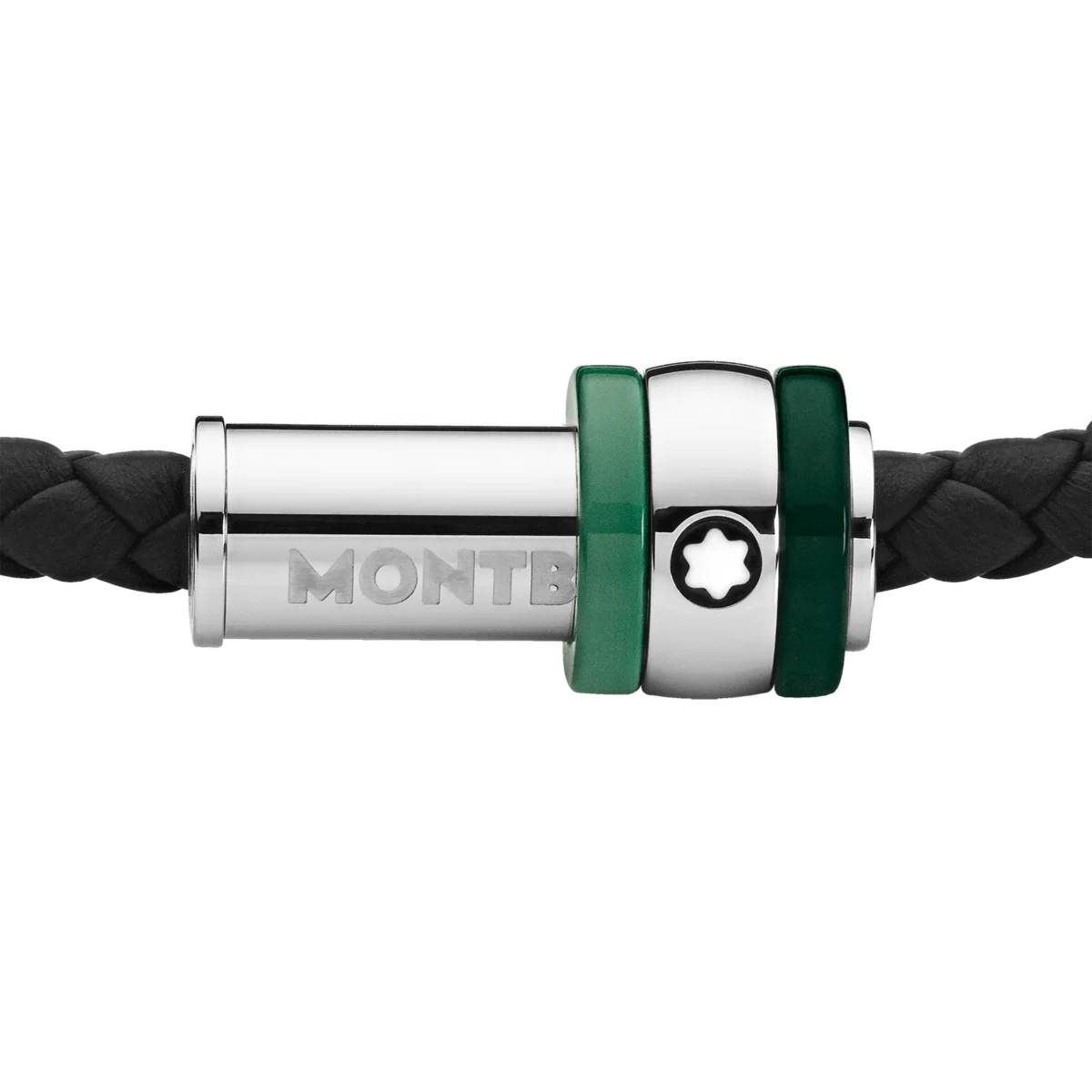 Das aus schwarzem Leder geflochtene Schmuckstück hat einen Verschluss aus poliertem Edelstahl mit einem Ring aus Stahl mit Montblanc-Emblem und zwei Ringen aus grünem Harz.