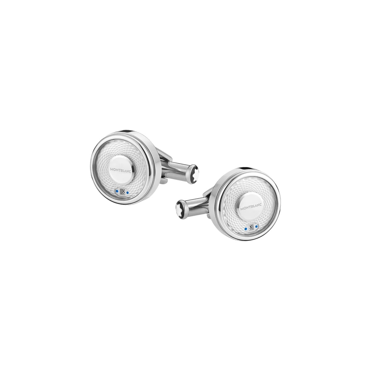 Diese Manschettenknöpfe sind eine Hommage an das Design der Montblanc Star Legacy Nicolas Rieussec Chronograph Uhr. Die zentrale Platte aus Edelstahl ist mit einem gravierten Guilloche-Muster und dem Montblanc Markennamen verziert, während die Datumsfunktion durch Drehen des Außenrings um die zentrale Platte angezeigt wird.
