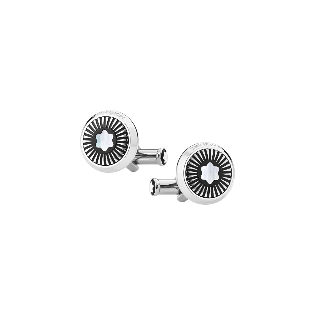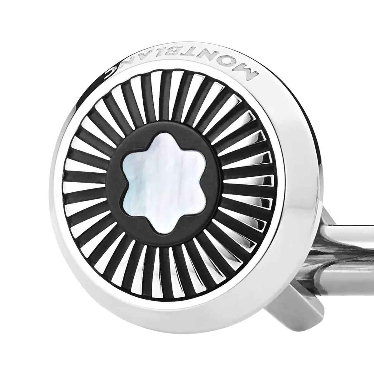 Die runden Montblanc Star Manschettenknöpfe aus Edelstahl mit Strahlenmuster und Emblem aus Perlmutt mit Schneekappe sind von den Codes des Hauses inspiriert. Eine Kollektion, die das Montblanc Emblem in verschiedenen Interpretationen präsentiert.
