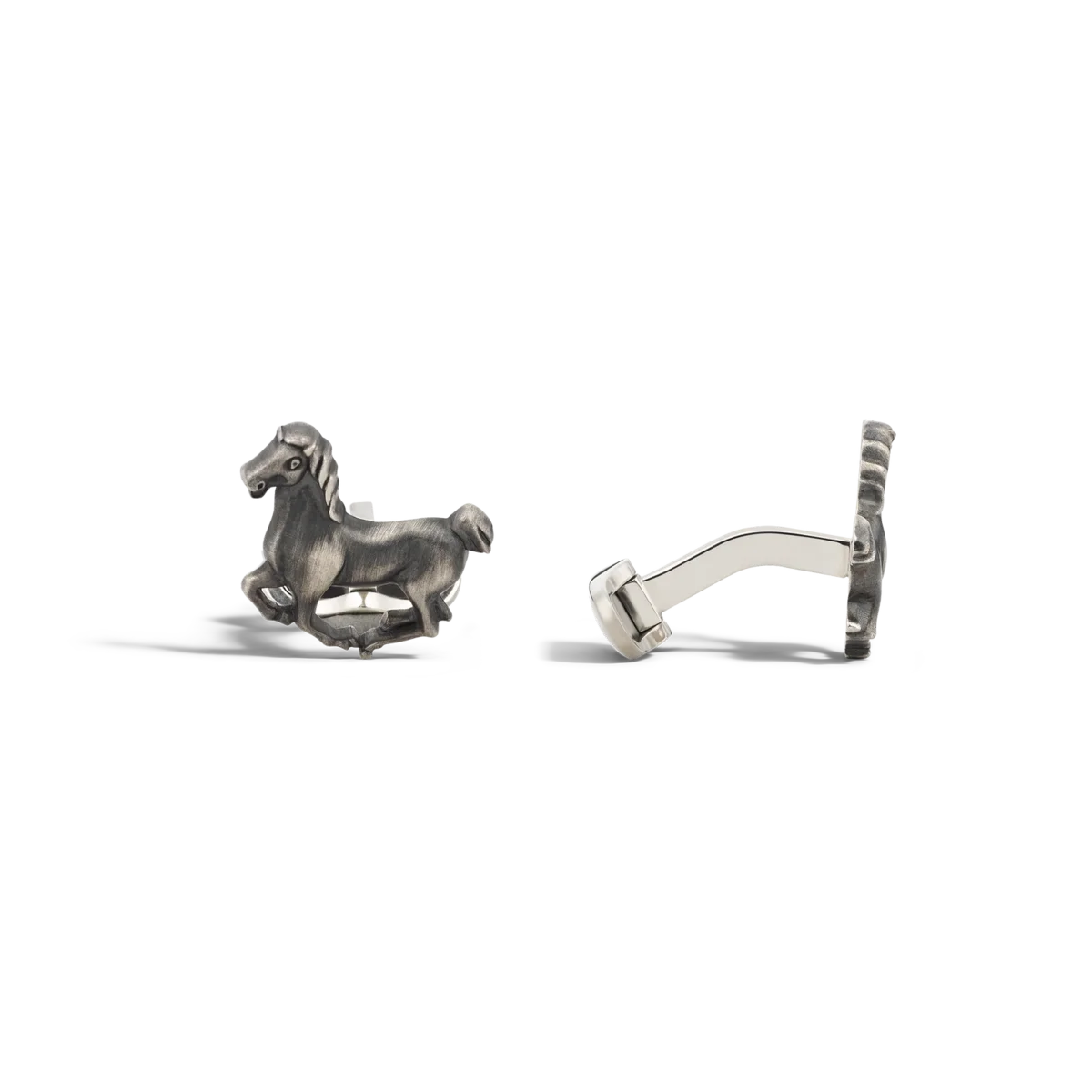 Manschettenknöpfe aus Silber, gewidmet der Kollektion Legend of Zodiacs The Horse. Dieses Schmuckstück ist mit einer kunstvoll handgravierten Pferdefigur verziert, zu Ehren sowohl des Sternzeichens als auch der schnellen, langbeinigen Pferde des alten China. Fußlicht, wohlproportioniert und scheinbar fliegend wie der Wind, wurden sie „Tianma” genannt – himmlische Pferde. Früheste Erwähnungen beschreiben sie als Symbol für Positivität und Verheißung.