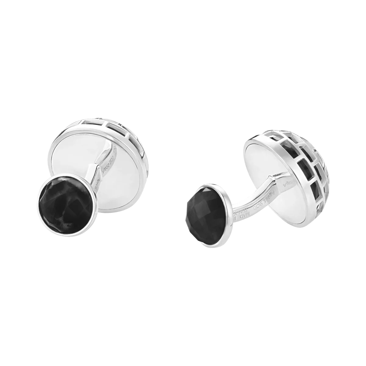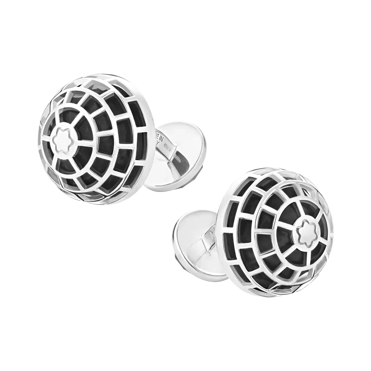 Diese Montblanc Meisterstück Manschettenknöpfe sind aus Silber gefertigt und mit einem schwarzen Onyxstein in einer modernen Kuppelform versehen, ergänzt durch das eingravierte ikonische Montblanc Emblem. Die Rückseite des Stücks ist ebenfalls mit einem runden Onyxstein verziert.
