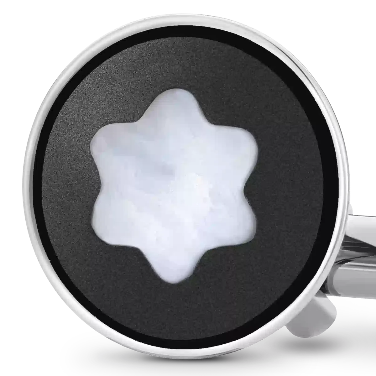Die runden Montblanc Star Manschettenknöpfe aus Edelstahl mit schwarzer PVD-Einlage und Perlmutt-Emblem mit Schneekappe sind von den Codes des Hauses inspiriert. Eine Kollektion, die das Montblanc Emblem in verschiedenen Interpretationen präsentiert.