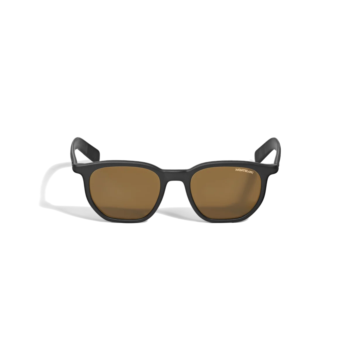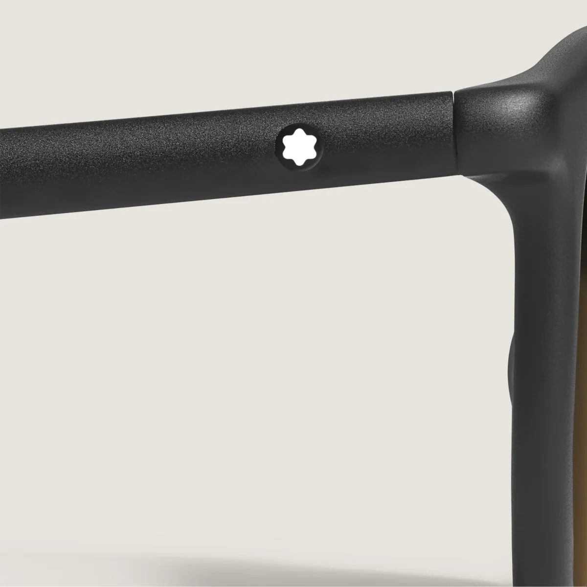 Diese Sonnenbrille im eckigen Stil hat einen schwarzen Acetatrahmen und braune Gläser. Das Montblanc Emblem ist in das Bügeldesign integriert. Das Montblanc Logo ist auf das linke Glas der Sonnenbrille gelasert und das Anti-Rutsch-Muster ist auf die Innenseite der Bügelenden gelasert, um den Tragekomfort zu erhöhen.
