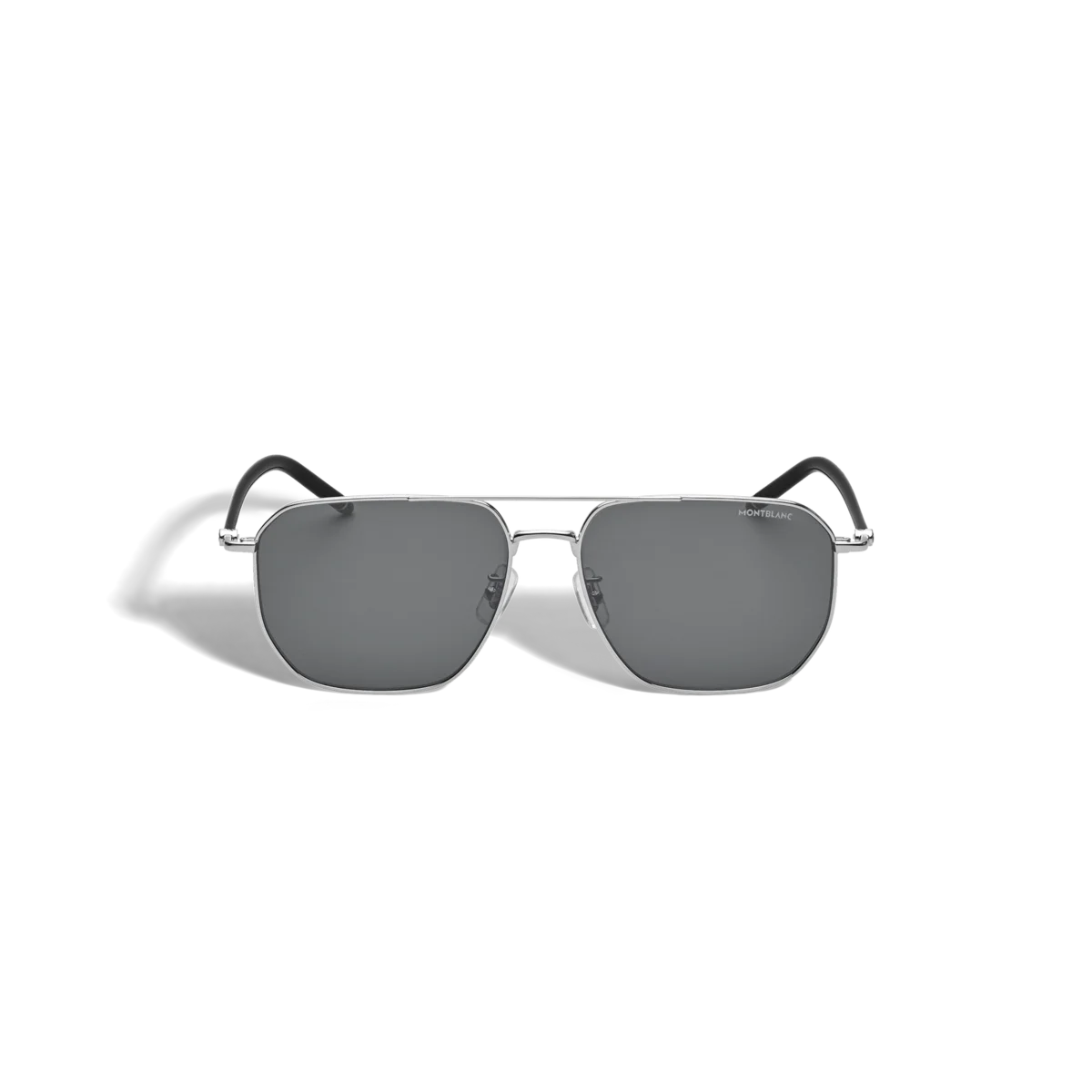 Diese Sonnenbrille im eckigen Stil hat einen silberfarbenen Metallrahmen und graue Gläser. Sie verfügt über einen doppelten Metallsteg auf der Vorderseite. Die von den Meisterstück-Schreibgeräten inspirierten runden Bügel sind mit einem 3-Ring-Detail verziert. Das Montblanc Logo ist auf das linke Glas gelasert und die Bügelenden sind mit einem schwarzen Emaille-Detail verziert.