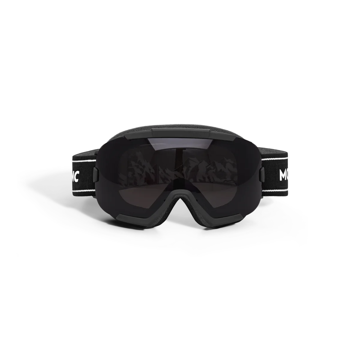 Diese rechteckige Skimaske hat einen schwarzen Acetatrahmen und schwarze Gläser. Sie verfügt über photochrome Gläser, die sich an die Wetterbedingungen anpassen. Das Montblanc-Schriftzuglogo ist auf das Jacquardband gestickt, das auf der Innenseite mit Gummidetails versehen ist, um den Tragekomfort zu erhöhen.