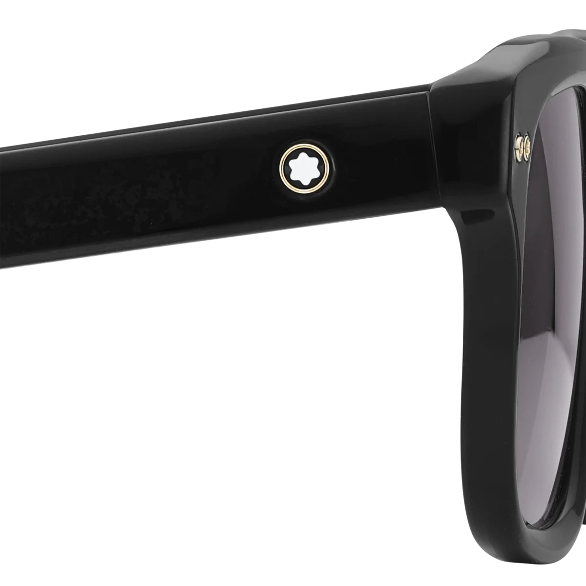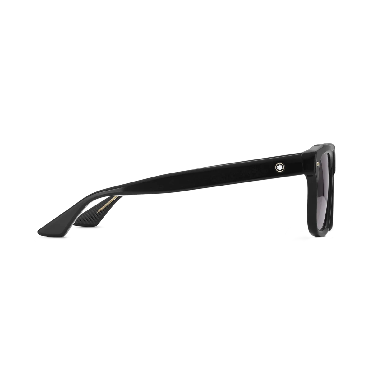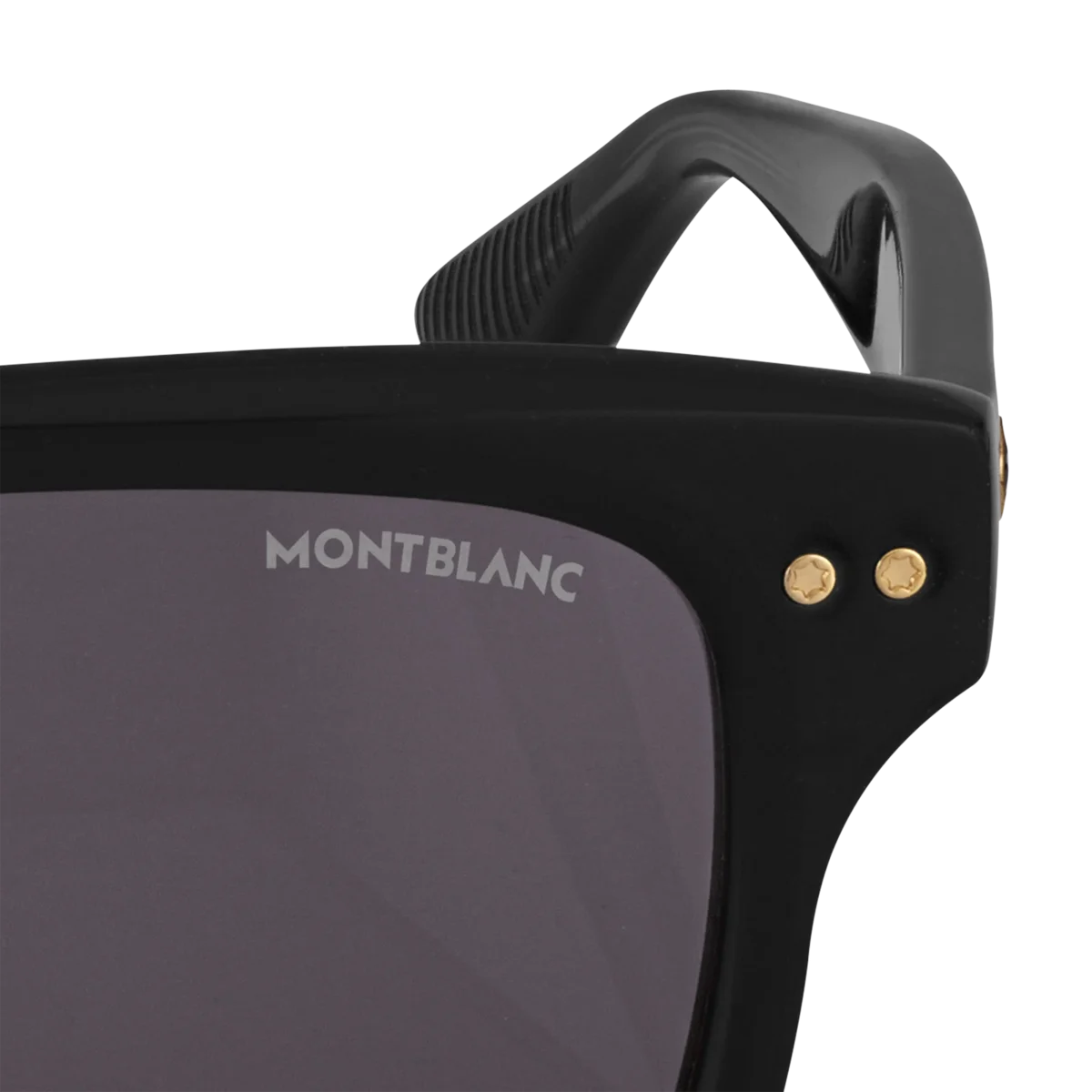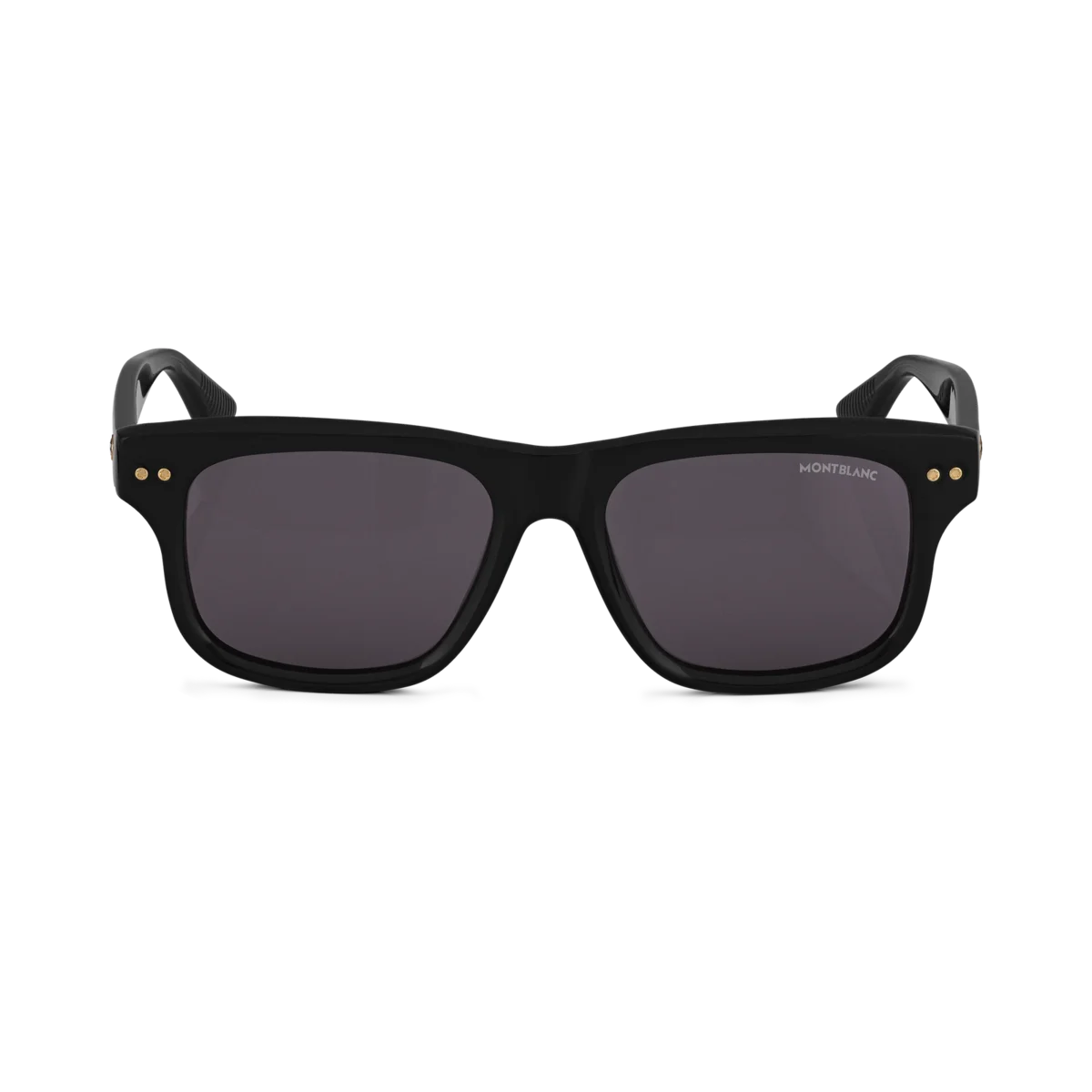 Diese rechteckige Sonnenbrille mit markanter Form verfügt über einen schwarzen Acetatrahmen und Rauchgläser. Die Nieten auf der Vorderseite sind mit einem Schneekappe-Detail versehen, und das Montblanc Extreme 3.0-Muster ist in das Design der Bügelinnenseite integriert. Das Montblanc Emblem ist in das Bügeldesign integriert. Das Montblanc Logo ist auf das linke Glas gelasert und das Anti-Rutsch-Muster ist auf die Innenseite der Bügelenden gelasert, um den Tragekomfort zu erhöhen.