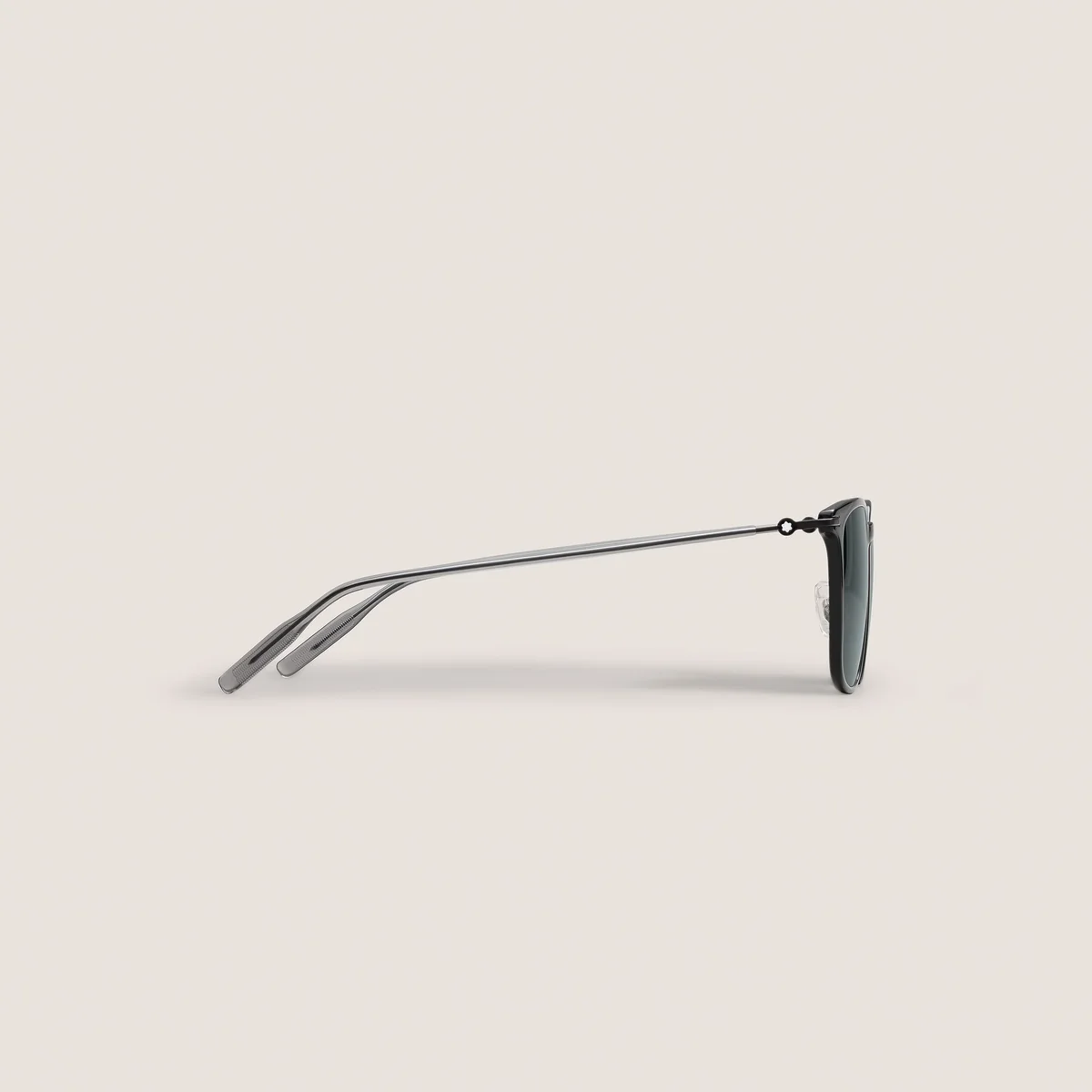 Diese Sonnenbrille im rechteckigen Stil hat einen schwarzen Spritzgussrahmen und graue Gläser. Das Montblanc Emblem mit Schneekappe ist in das Metallbügel-Design eingearbeitet. Das Montblanc Logo ist auf die linke Linse gelasert und die Innenseite der transparenten Bügelenden ist mit einem rutschfesten Muster versehen, um den Tragekomfort zu erhöhen.