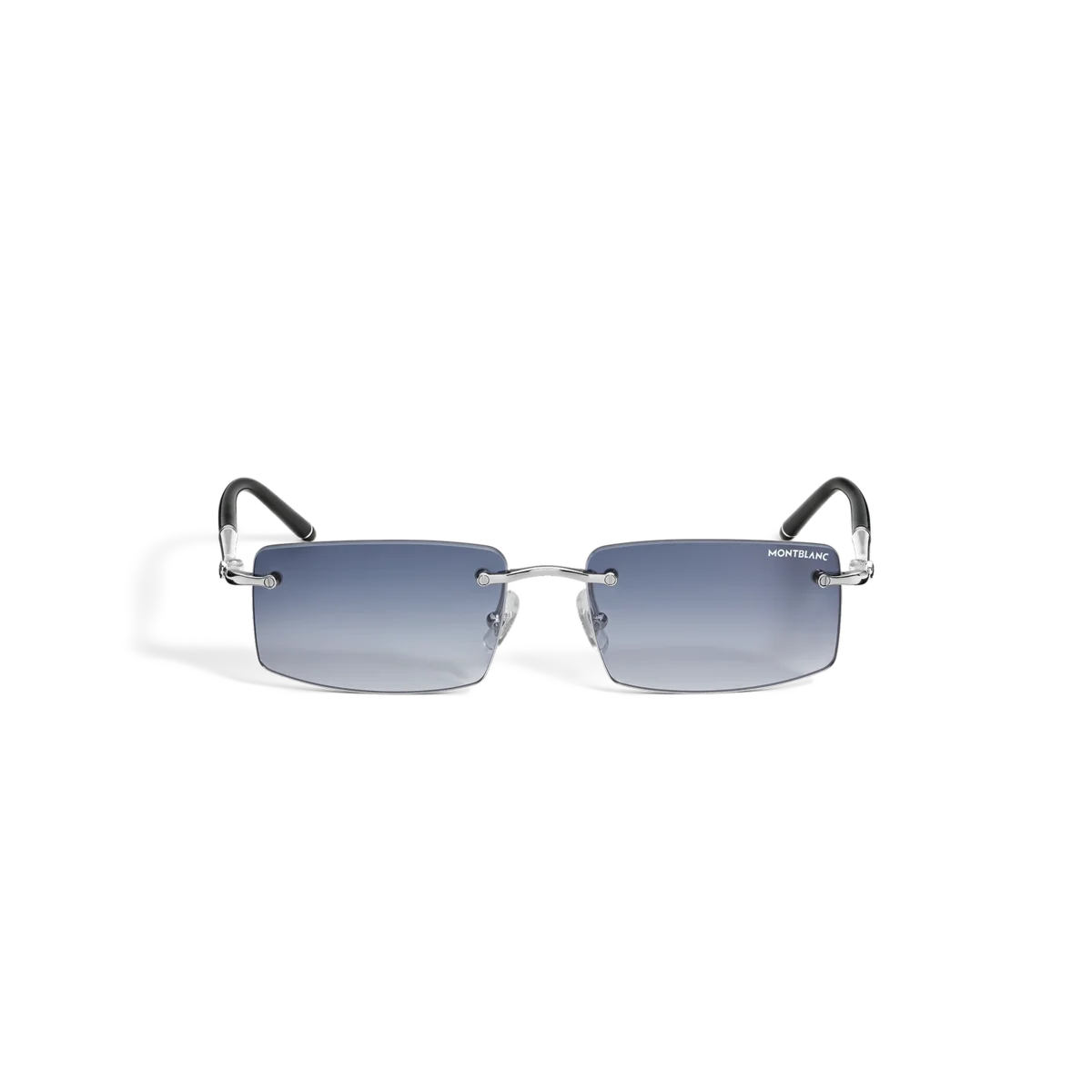 Diese Sonnenbrille im quadratischen Stil hat einen silberfarbenen Metallrahmen und blaue Gläser. Die von den Meisterstück-Schreibgeräten inspirierten runden Bügel sind mit einem 3-Ringe-Detail verziert. Das Montblanc Logo ist auf das linke Glas gelasert und die Bügelenden sind mit einem schwarzen Emaille-Detail verziert.