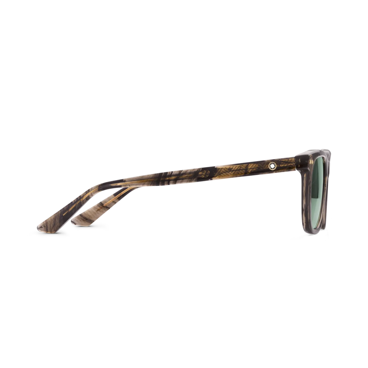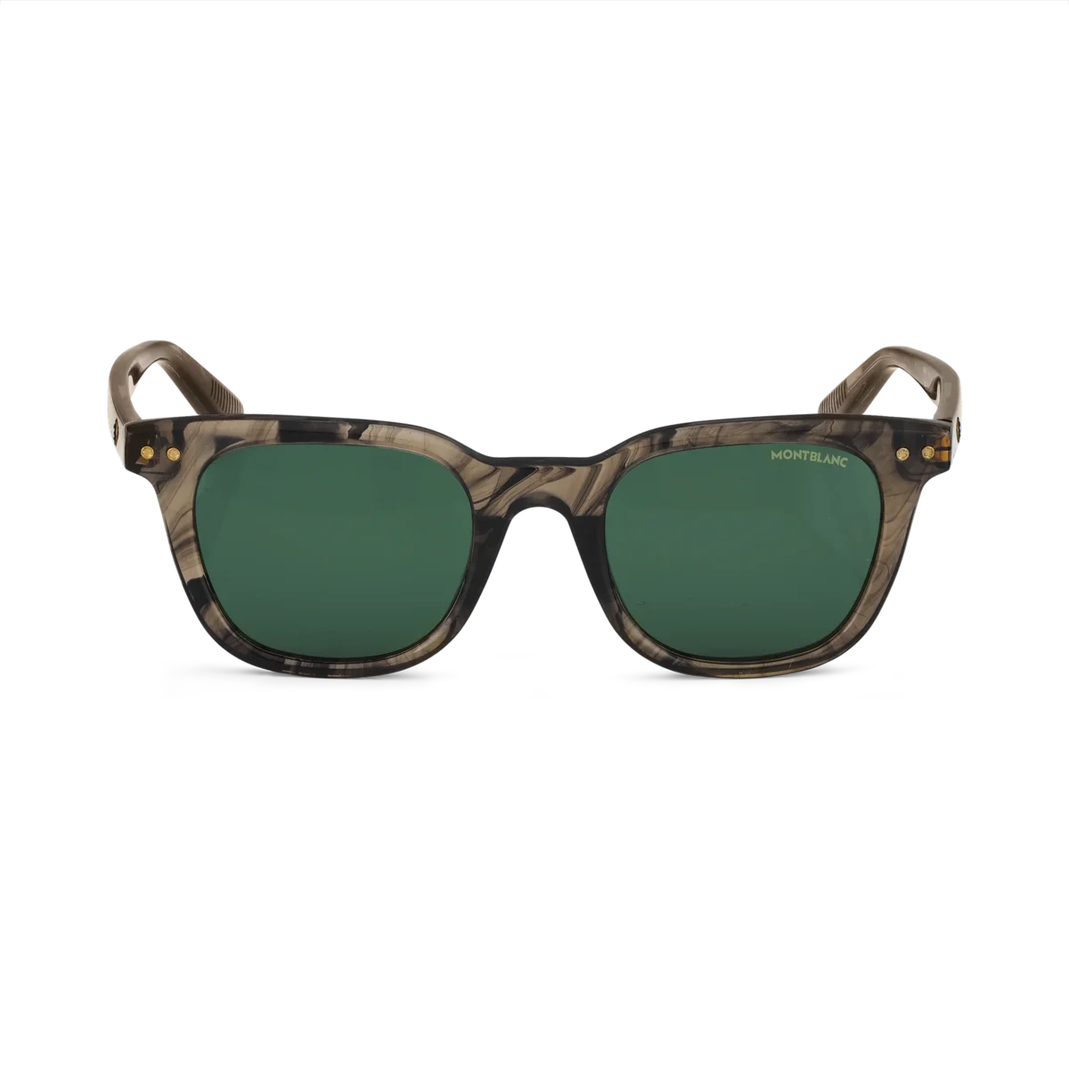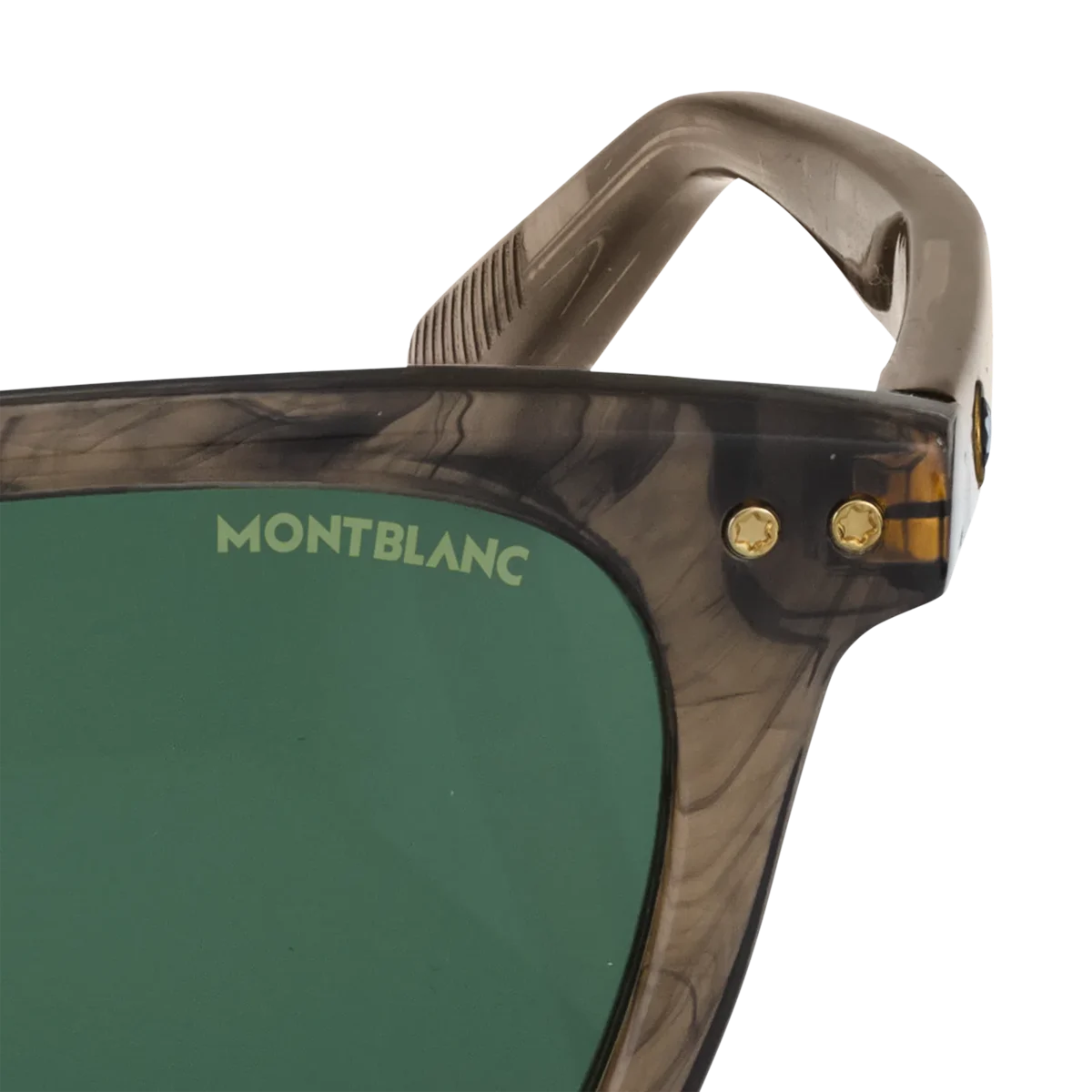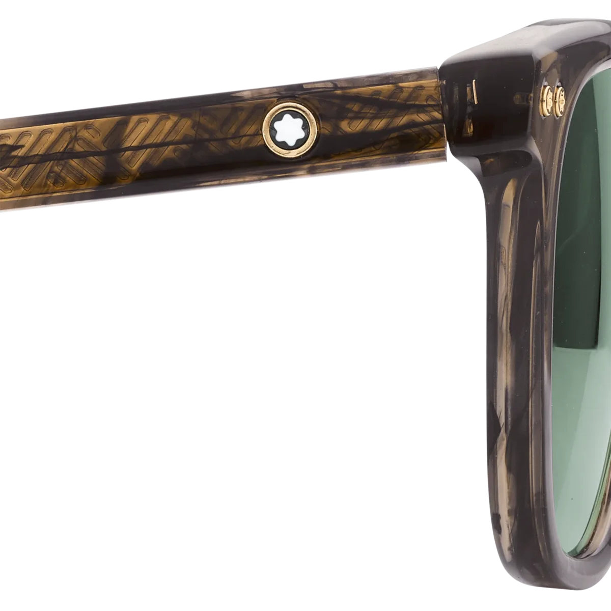 Diese runde Sonnenbrille verfügt über einen braunen Acetatrahmen und grüne Gläser. Die Nieten auf der Vorderseite sind mit schneebedeckten Details verziert und das Montblanc 3.0-Muster ist in das Design der Innenseite der Bügel integriert. Das Montblanc Logo ist auf das linke Glas gelasert, und das Anti-Rutsch-Muster ist auf die Innenseite der Bügelenden gelasert, um den Tragekomfort zu erhöhen.