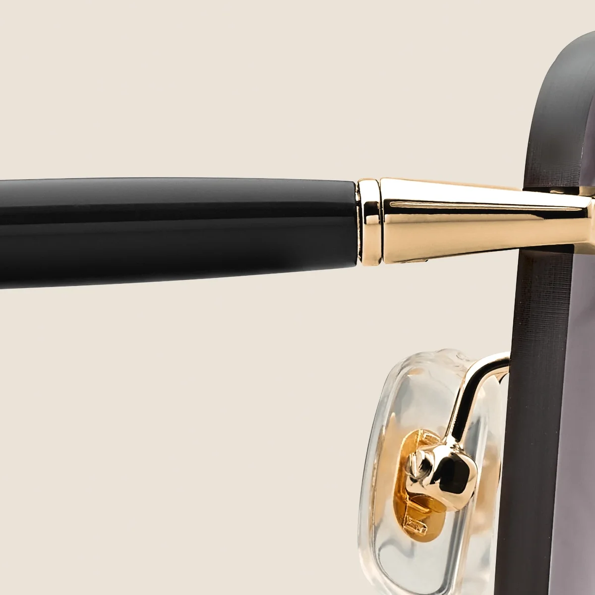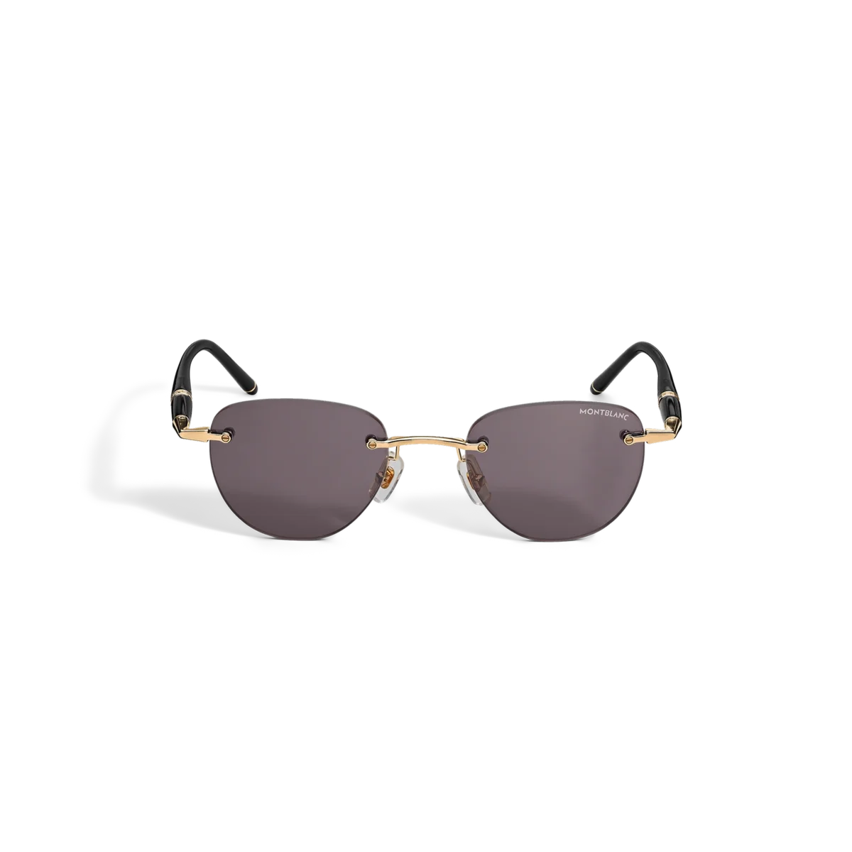 Diese randlose Sonnenbrille im runden Stil hat einen goldfarbenen Metallrahmen und graue Gläser. Die von den Meisterstück-Schreibgeräten inspirierten röhrenförmigen Bügel sind mit dem Montblanc-Schriftzug verziert. Das Montblanc-Logo ist auf das linke Glas gelasert.