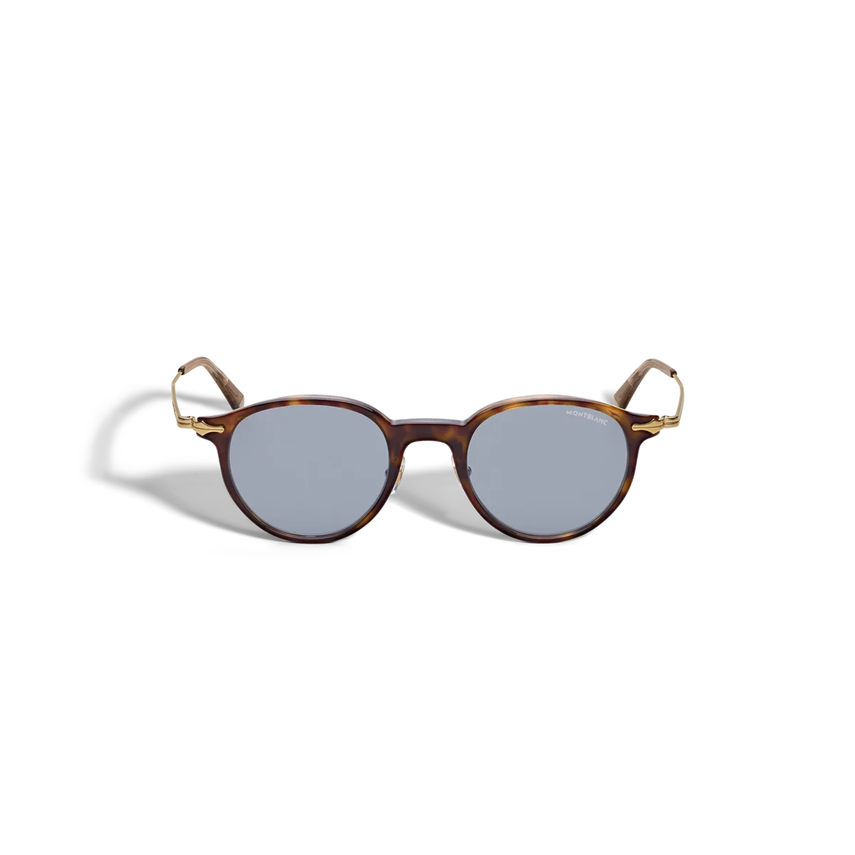 Diese Sonnenbrille im runden Stil hat einen havannafarbenen Acetatrahmen und hellblaue Gläser. Inspiriert vom Federkiel-Design der Schreibgeräte ziert ein dekoratives Federkiel-Detail das Metallbügel-Design. Das Montblanc Logo ist auf das linke Glas gelasert, und die Innenseite der Bügelenden ist mit einem rutschfesten Muster versehen, um den Tragekomfort zu erhöhen.