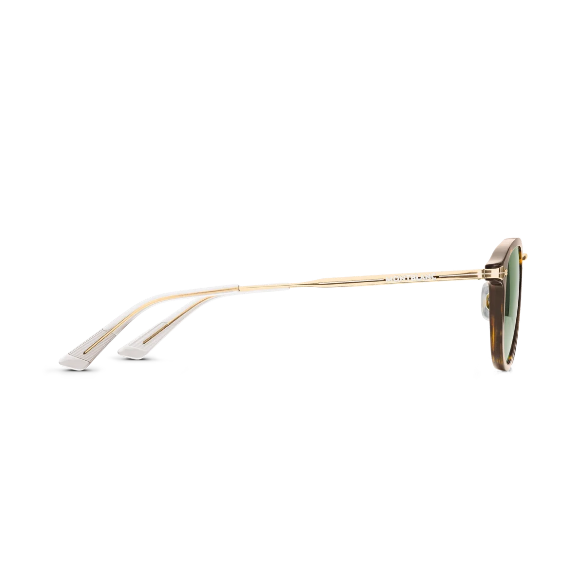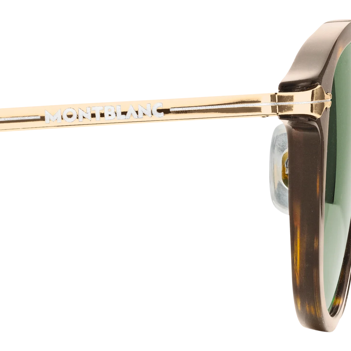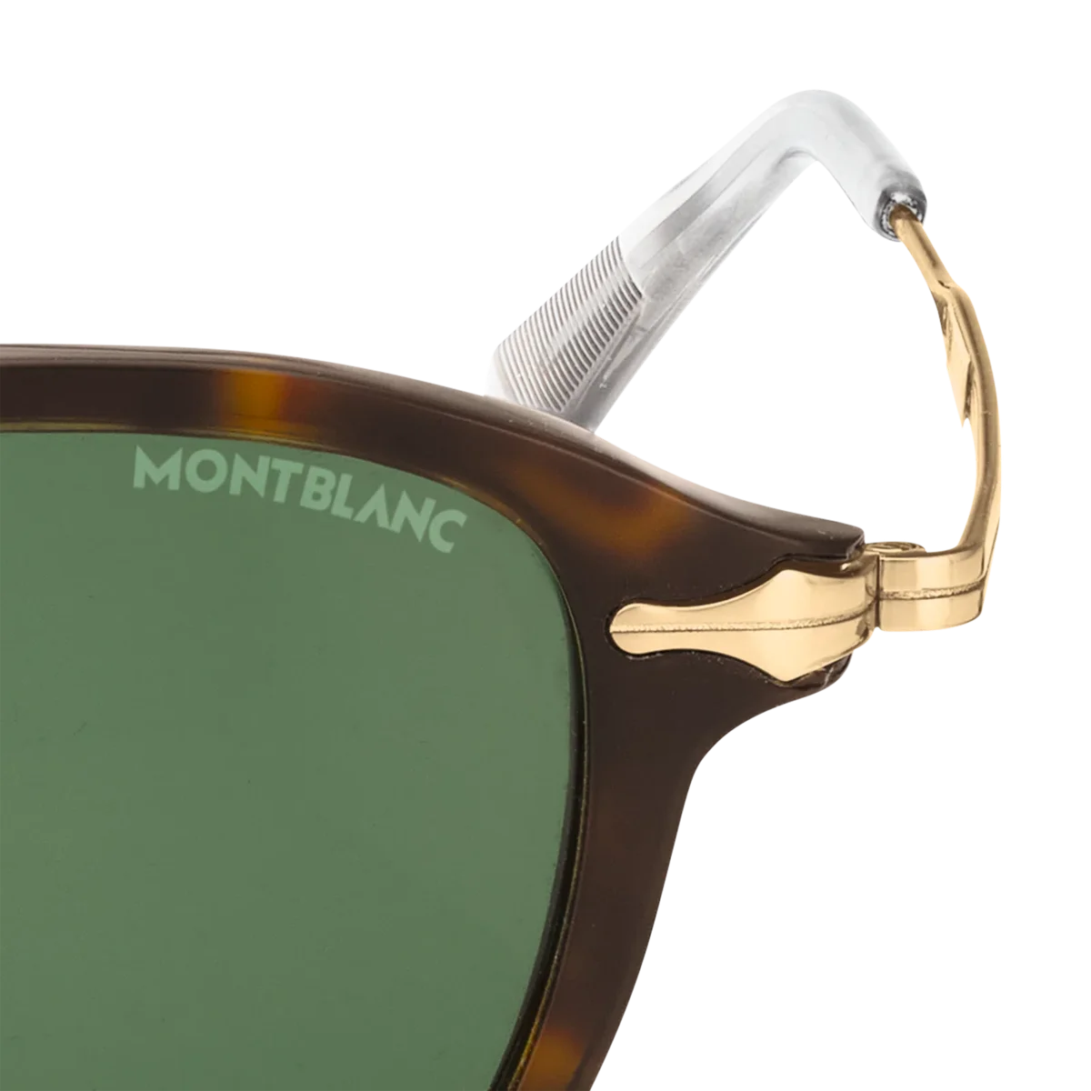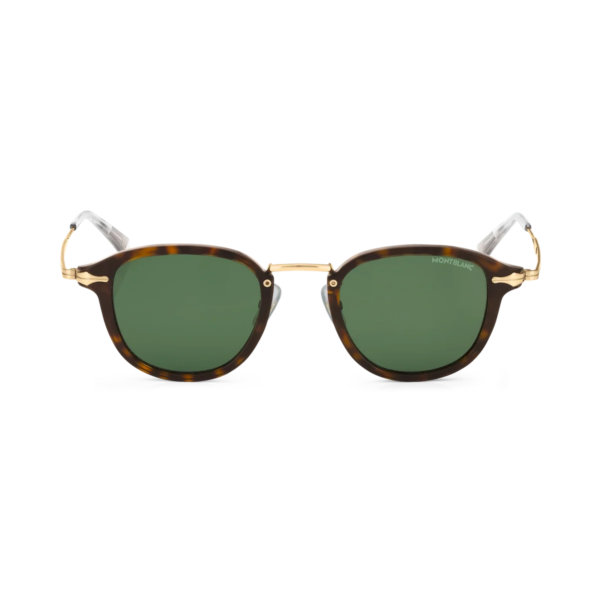 Diese runde Sonnenbrille verfügt über einen havannafarbenen Spritzgussrahmen und grüne Gläser. Inspiriert vom Federkiel-Design der Schreibgeräte ziert ein dekoratives Federkiel-Detail das Metallbügel-Design. Das Montblanc Logo ist auf das linke Glas gelasert, und die Innenseite der Bügelenden ist mit einem rutschfesten Muster versehen, um den Tragekomfort zu erhöhen.