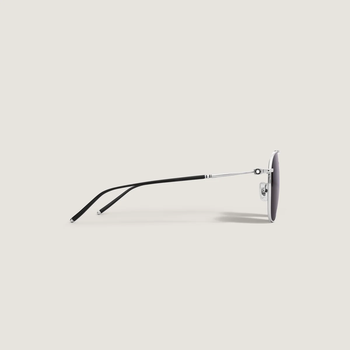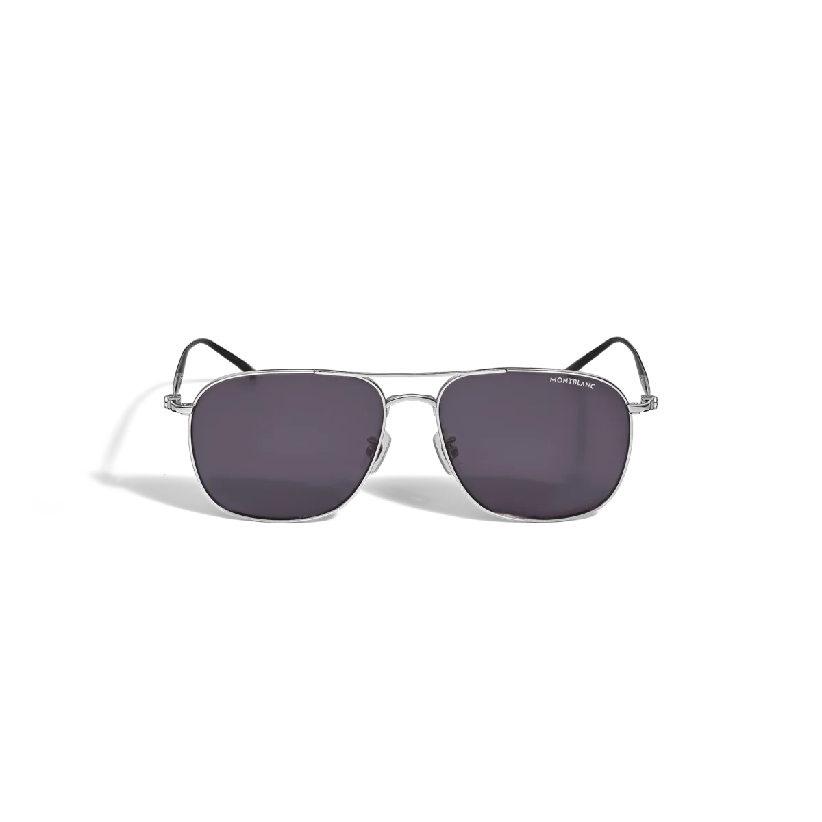 Diese Sonnenbrille im eckigen Stil hat einen silberfarbenen Metallrahmen und blaue Gläser. Sie verfügt über einen doppelten Metallsteg auf der Vorderseite. Die von den Meisterstück-Schreibgeräten inspirierten Bügel sind mit einem 3-Ringe-Detail verziert. Das Montblanc Logo ist auf das linke Glas gelasert und die Bügelenden sind mit einem schwarzen Emaille-Detail verziert.