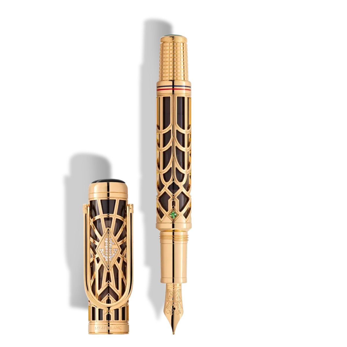 Bestimmte Romane gehen in die Literaturgeschichte ein und werden gleichzeitig zum Symbol einer ganzen Epoche. F. Scott Fitzgeralds „Der große Gatsby“ ist ein solches Juwel der modernen amerikanischen Literatur. Der 1925 veröffentlichte Roman zeichnet ein faszinierendes Bild des Jazz-Zeitalters und der „Roaring Twenties“, einer Zeit beispiellosen Wohlstands und maßloser Selbstverherrlichung. Das pulsierende New York City, die opulenten Villen von Long Island und die schillernden Partys der High Society bilden den Hintergrund für die Geschichte von Jay Gatsby, einem mysteriösen Millionär, der vor nichts zurückschreckt, um die Zuneigung seiner verlorenen Jugendliebe Daisy Buchanan zurückzugewinnen. Montblanc ehrt dieses vielfach verfilmte literarische Meisterwerk, das gleichermaßen ein Synonym für die glamouröse Welt des Art déco ist, mit der Great Characters Homage to The Great Gatsby Limited Edition 100. Der Art déco verlieh allem einen glamourösen Glanz. Die Architektur brach buchstäblich aus der Zweidimensionalität aus und ragte in den Himmel, als Symbol für Fortschritt und Emanzipation. Ihre dekorativen Bögen, Stufen, Winkel und gezackten Linien verliehen den Gebäuden eine unverwechselbare Dynamik und Ästhetik – und inspirierten ganz offensichtlich auch diese limitierte Auflage. Die skelettierten symmetrischen Bögen und Linien aus massivem 750er Gelbgold lassen die schwarze, durchscheinende Oberfläche darunter erkennen. Leuchtend grüne Tsavorite auf der Kappe und dem Gehäuse erinnern an das grüne Licht am Steg von Daisys Haus, Symbol der Hoffnung für den verliebten Millionär Jay Gatsby, besser bekannt als Der große Gatsby. Produktbilder können vom tatsächlichen Produkt abweichen. Jay Gatsby ist die Verkörperung eines universellen Ideals, des amerikanischen Selfmademan. Doch hinter Gatsbys wohlhabender Fassade beginnt sich der Traum aufzulösen. Sein Reichtum stammt aus Geschäften mit Alkohol während der Prohibition, als die verbotene Flüssigkeit häufig in kleine Flaschen mit Schraubverschluss abgefüllt wurde, die leicht zu verstecken waren. Jeder Tropfen war kostbar. Dementsprechend wurde nicht nur der Inhalt, sondern auch das Design der Flachmänner verehrt. Bei der Great Characters Homage to The Great Gatsby Limited Edition 100 imitiert der Kegel den gravierten Schraubverschluss eines Art-Déco-Flachmanns. Der Mythos des amerikanischen Traums wird durch die feinen Ringe in den Farben der amerikanischen Flagge aufgegriffen, die den Kegel zieren. Wie die Skelettüberlagerung sind auch die Beschläge der Edition aus massivem 750er Gelbgold gefertigt, da Gold das Symbol für Reichtum, Macht und Status ist und die Farbe Gelb in dem Roman am häufigsten erwähnt wird. Im Gegensatz dazu stehen die tiefschwarze, durchscheinende Kappe und der Schaft für die Korruption und den moralischen Verfall, die hinter der glitzernden Fassade der wohlhabenden Gesellschaft liegen. Das strahlende grüne Licht, das jeden Abend auf dem Steg vor Daisys Haus leuchtet, ist der einzige Hoffnungsschimmer und wird hier neben dem Tsavorit auf der skelettierten Kappe und dem Schaft durch eine grüne Malachit-Einlage im Konus dargestellt. Es steht für die Sehnsucht nach einer besseren Zukunft und für Gatsbys Wunsch, Daisy zurückzugewinnen. Seine Liebe bleibt jedoch unerfüllt – trotz seines ganzen Reichtums unerreichbar. Die berauschende, aber scheinbar illusorische Macht des Geldes wird durch den goldbeschichteten Clip in Form einer Geldklammer symbolisiert. Seine abgerundete Öffnung ist mit den diamantbesetzten Initialen von Jay Gatsby als rhombusförmiges Art-Déco-Monogramm verziert. Das krönende Montblanc-Emblem besteht aus Perlmutt, umgeben von schwarzem Onyx, einer Materialkombination, die einige der elegantesten Kreationen der Schmuckdesigner der Art-Déco-Zeit inspirierte. Die Eleganz seiner Linien ist das Hauptmotiv des Art Déco, auffällig und gleichzeitig raffiniert.Eine rein lineare Gravur ziert auch die handgefertigte Feder aus massivem 750er Gold. Die Zahl 100 ist in mehrfacher Hinsicht von Bedeutung. Sie steht für die limitierte Stückzahl der Great Characters Homage to The Great Gatsby Limited Edition 100 und spielt auf den 100. Geburtstag der fiktiven Figur an – also den 100. Jahrestag der Veröffentlichung des Romans. Darüber hinaus verweist sie auf die Welt des Geldes und die damals höchste im Umlauf befindliche Dollarnote. Ident-Nr. MB130686 Physisches Gewicht 103,6 g Abmessungen 145 mm * 21 mm * 21 mm