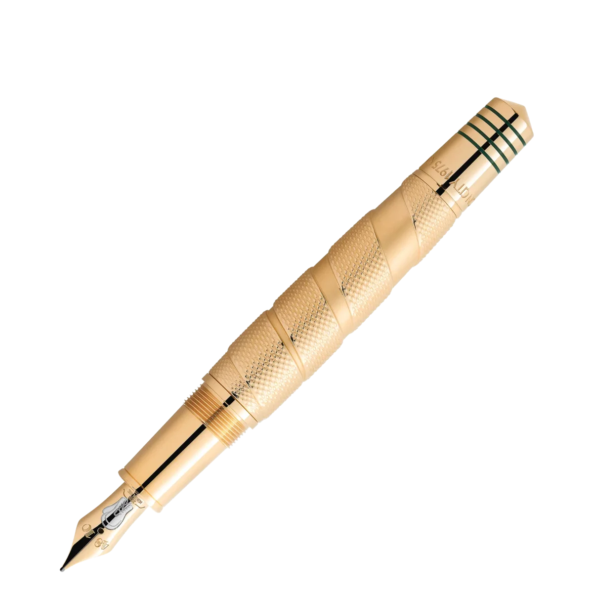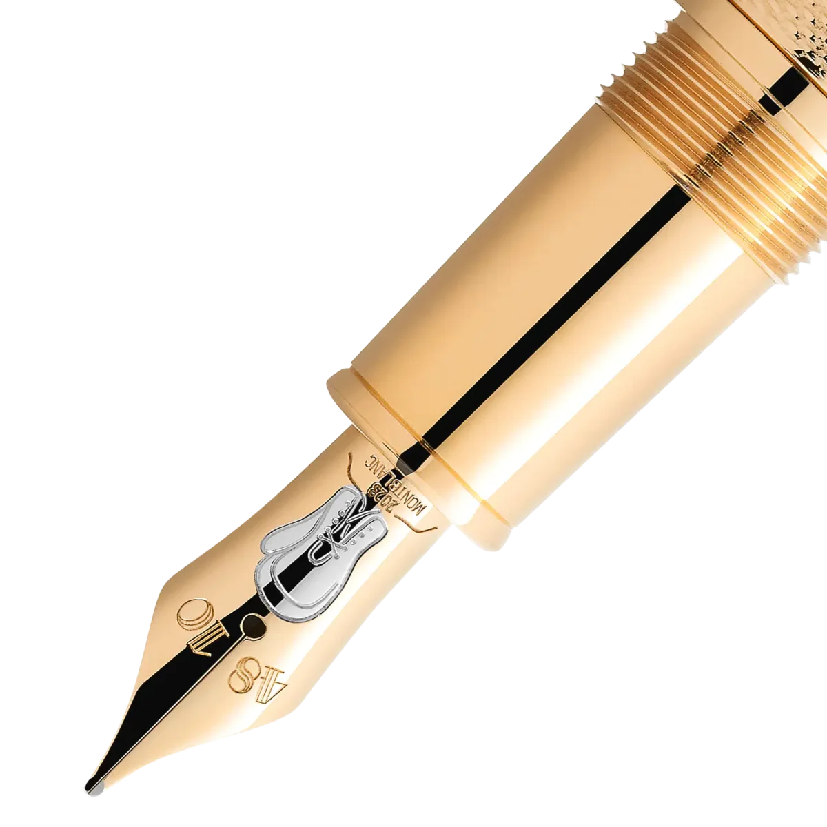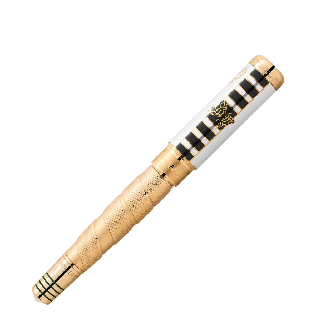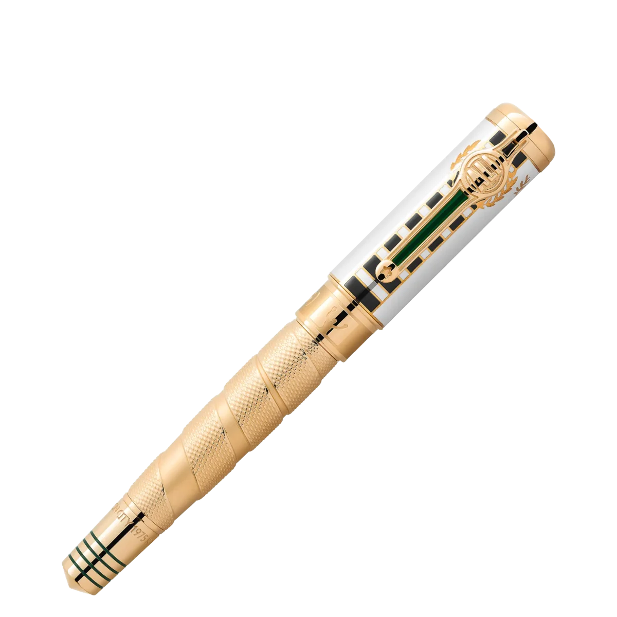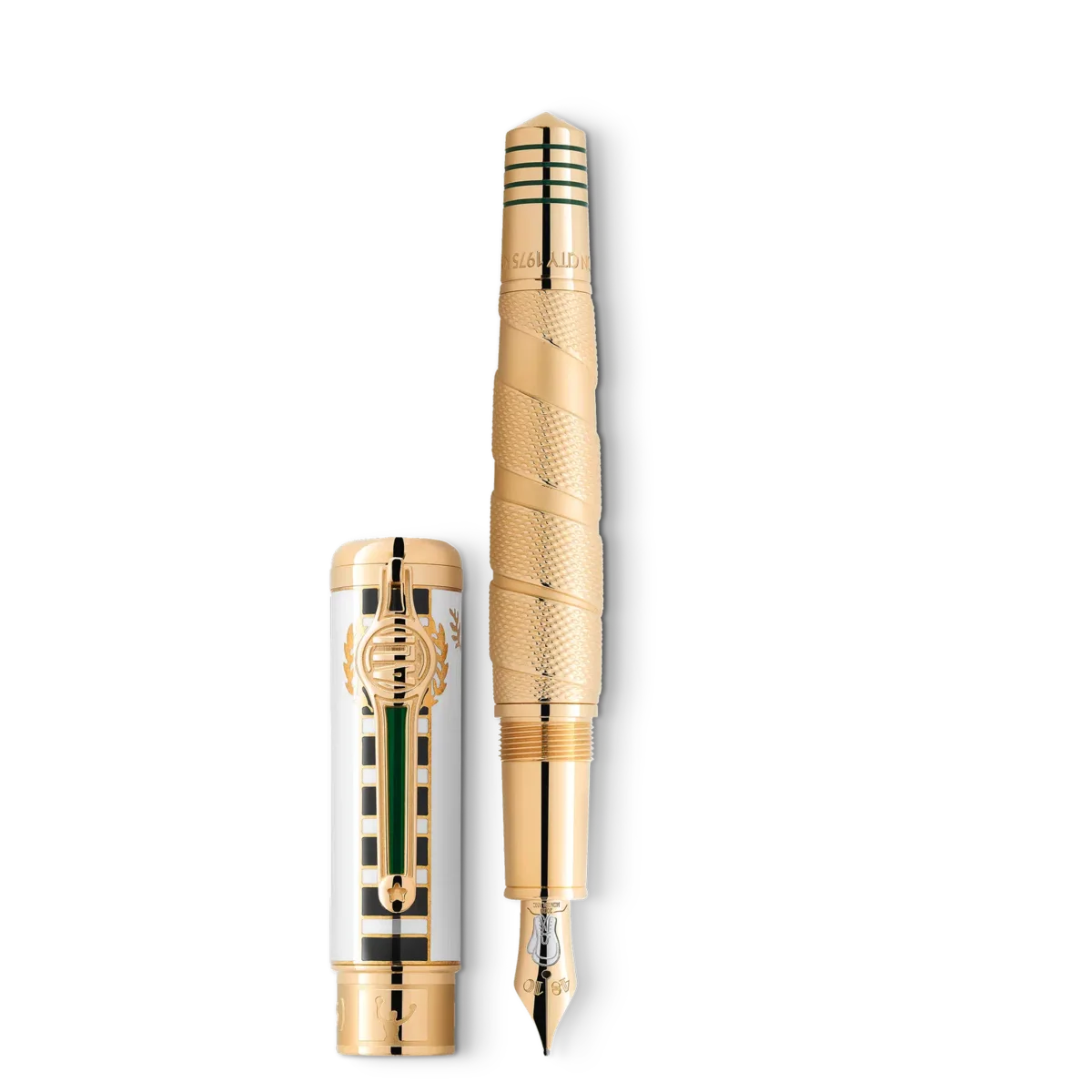 Nur wenige Sportler werden so gefeiert und geehrt wie der dreimalige Weltmeister im Schwergewicht Muhammad Ali, dessen legendäre Momente im Sport und im Kampf für Bürgerrechte ihn zu einem der einflussreichsten Sportler und Menschenfreunde des 20. Jahrhunderts machten. Als Sportler erschütterte Ali die Welt mit seiner Kraft, seinem Können und seiner Persönlichkeit und wurde mit nur 22 Jahren Weltmeister im Schwergewicht. Sein größter Triumph war jedoch das Ergebnis seines humanitären Engagements. Inspiriert von dem Gewand, das Ali 1974 bei seinem legendären Kampf in Kinshasa, Zaire, trug, repräsentiert der kostbare Lack auf der Kappe dieses unverwechselbare Muster, während das Muster auf dem goldbeschichteten Schaft an die Boxbänder erinnert, mit denen Sportler ihre Hände umwickeln. Der goldbeschichtete Schmetterling auf der Kappe ist von seinem typischen Kampfstil inspiriert: „Float like a Butterfly, sting like a bee” (Schwebe wie ein Schmetterling, steche wie eine Biene). Der spitze Kegel greift dieses Konzept auf, und die vier lackierten Linien ähneln den Seilen eines Boxrings. Die Inschriften auf dem Kegel beziehen sich auf Alis Sieg im Kampf von 1974 mit dem Spitznamen „Rumble in the Jungle”, als Ali seinen zweiten Weltmeistertitel im Schwergewicht gewann. Die Details seines Sieges, nämlich der Sieg durch technischen K.o. in der achten Runde, sind auf dem Kappenring zu finden. Der Kegel weist auch auf einen berühmten Kampf Alis im Jahr 1975 hin, der den Spitznamen „Thrilla in Manila“ trug.Zur Feier seines zweiten Titels ist das Montblanc-Emblem aus weißem Edelharz mit einer „2“ verziert. Um diesen Erfolg zu unterstreichen, hat der Clip die Form eines Box-Meisterschaftsgürtels und trägt seinen Namen. Die handgefertigte, zweifarbige Feder aus massivem 750er Gold zeigt einen Boxhandschuh. Ident-Nr. MB129336 Physikalisches Gewicht 95,76 g Abmessungen 147,3 mm * 17,3 mm