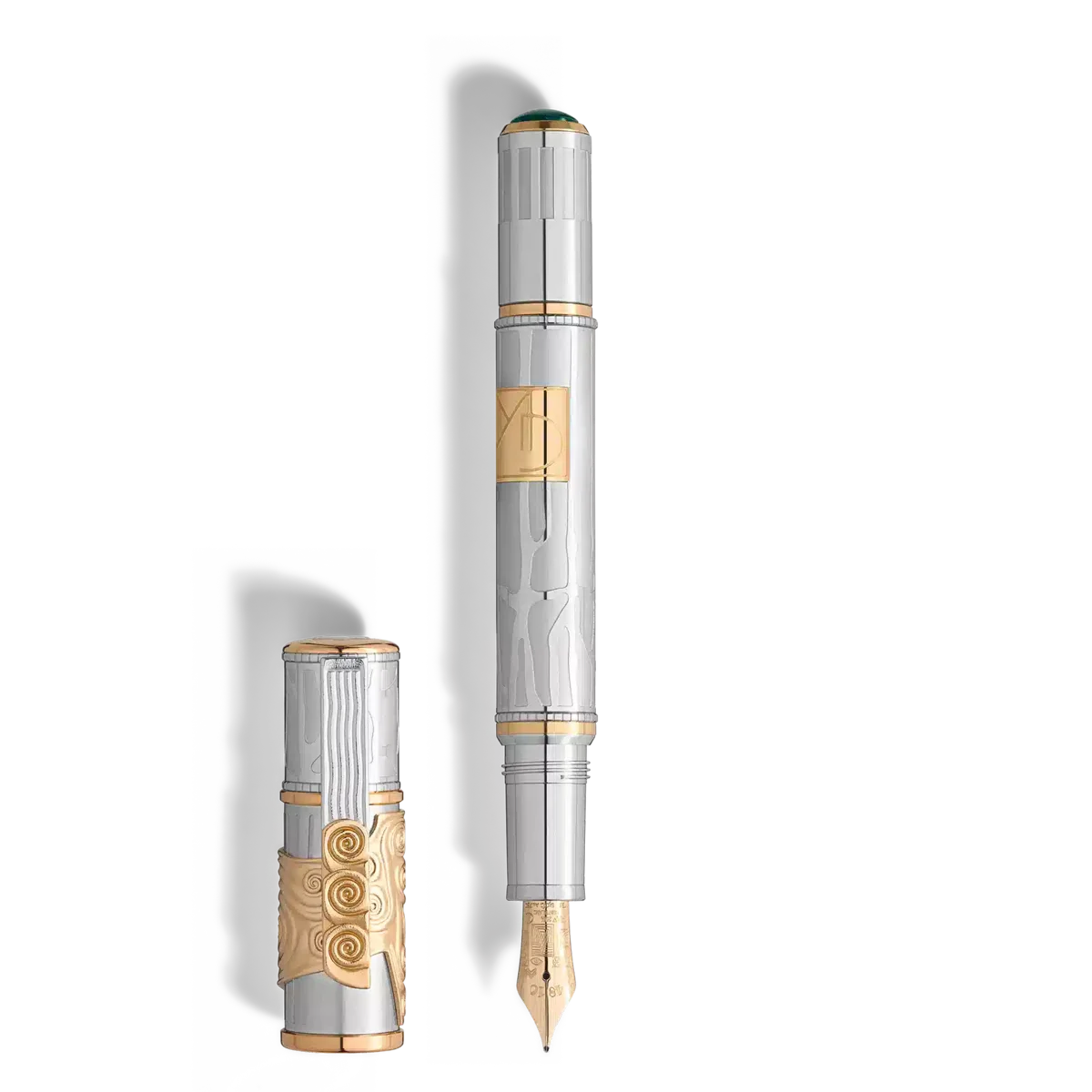 Große Künstler haben im Laufe der Geschichte die menschliche Erfahrung in einer universellen Sprache der Form und Schönheit zum Ausdruck gebracht. Die Montblanc Masters of Art Collection würdigt ihren unvergänglichen Beitrag zum Streben nach Perfektion in der Kunst – ein Streben, das Montblanc sowohl feiert als auch selbst verfolgt. Ein Künstler, dessen Vision die Wiener Jugendstil-Bewegung und das Goldene Zeitalter geprägt hat, ist Gustav Klimt. Die Montblanc Masters of Art Homage to Gustav Klimt Limited Edition 888 würdigt sein aktives Engagement für die Wiener Secession und zeigt Design-Highlights aus seinem Beethoven-Fries – dem großformatigen Meisterwerk seiner „Goldenen Phase“, das er für das Secessionsgebäude schuf. Die reliefartige Beschichtung aus massivem 750er Gelbgold auf der platinbeschichteten Kappe mit ihren Spiralen und vertikalen Linien, die die Saiten einer Leier symbolisieren, ist eine Anspielung auf die goldenen Verzierungen des Beethovenfrieses sowie auf die Leierspielerin, deren Klänge die Sehnsucht der Menschheit nach Glück stillen sollen. Zweidimensionale Linien, inspiriert von den Fassadenreliefs des Secessionsgebäudes, leuchten vor dem matten Hintergrund der platinbeschichteten Kappe und des Schafts. Die Kombination aus massivem 750er Gelbgold und platinbeschichteten Elementen auf Kappe und Schaft spiegelt die für Gustav Klimt typischen experimentellen und luxuriösen Materialien wider. Das Zusammenspiel wird durch einen Malachit-Cabochon im Konus bereichert. Die grüne Farbe des Malachits erinnert an den Frühling, die Jahreszeit des Neuanfangs. In Anerkennung von Klimts Verdiensten um die Wiener Secession trägt die massive Au 750 Gold-Einlage auf dem Schaft sein Secession-Monogramm mit den Initialen GK. Der Clip der Homage to Gustav Klimt Limited Edition 888 wurde speziell in Anlehnung an Gustav Klimts Pallas Athene entworfen. Da Athene sowohl die Göttin des Krieges als auch der Künste ist, wird sie dargestellt, wie sie den Kampf für die künstlerische Freiheit beginnt. Die leicht geschwungenen Linien, die in drei Spiralen auf dem teilweise platinierten, teilweise gelbgoldbeschichteten Clip der Limited Edition 888 enden, entsprechen der Verzierung auf dem geschmiedeten Metallrahmen. Die handgefertigte Feder aus massivem 750er Gelbgold der Homage to Gustav Klimt Limited Edition 888 ist mit fein gravierten grafischen Elementen verziert, die die typischen geometrischen Muster bilden, die in vielen Werken von Gustav Klimt zu finden sind.