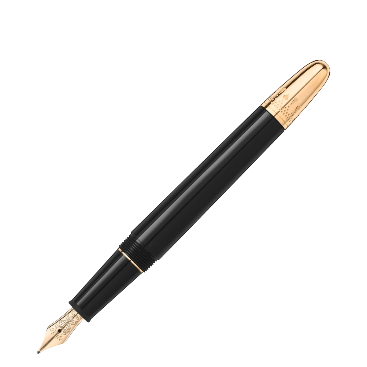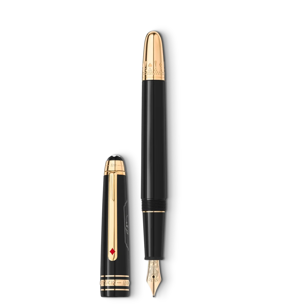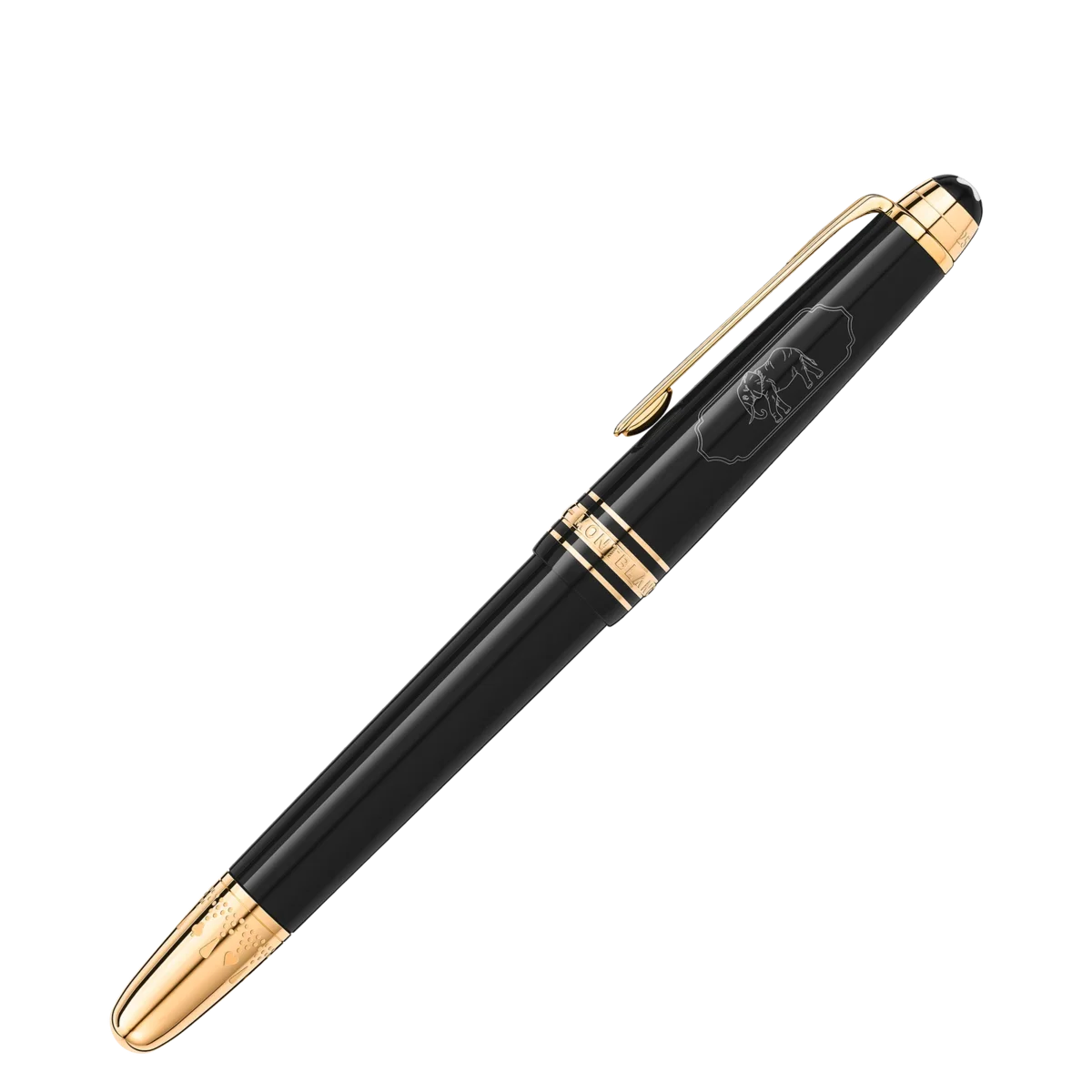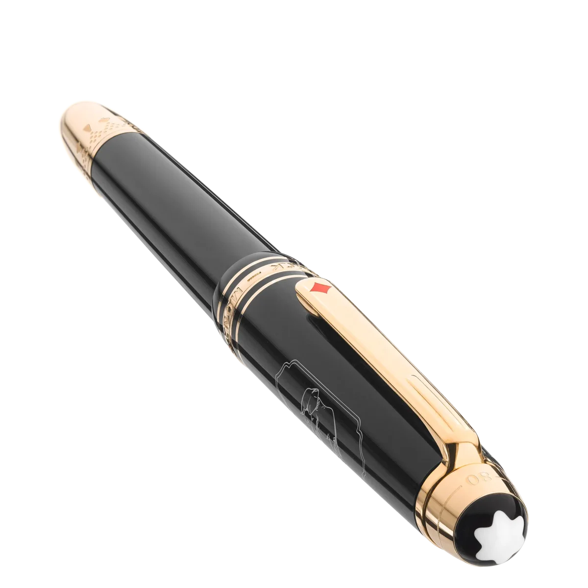 Die Kollektion Meisterstück Around the World in 80 Days ist vom berühmten Abenteuerroman von Jules Verne inspiriert. Der Classique Füllfederhalter aus anthrazitfarbenem Edelharz greift die zweite Etappe der Reise von Bombay nach Yokohama auf. Die Hauptfiguren reisen in diesem Teil des Abenteuers auf einem majestätischen Elefanten, der in einer Kartusche auf der Kappe abgebildet ist. Der Clip ist mit einem rot lackierten Diamanten-Kartensymbol verziert, einem Symbol für Glücksspiel und Spielkarten, und der Konus ist mit einem Muster graviert, das von Prinzessin Aoudas Schmuck und den Kartensymbolen inspiriert ist. Auf der Kappe ist die Länge der Reise eingeprägt: 25 Tage von Bombay nach Yokohama und insgesamt 80 Tage. Das Schreibgerät ist mit einer handgefertigten 18-Karat-Goldfeder versehen, die mit einem Heißluftballon mit den Zahlen 20/10 und 14/11 verziert ist: Mr. Fogg verlässt Bombay am 20. Oktober um 20:00 Uhr und Yokohama am 14. November um 18:00 Uhr.
