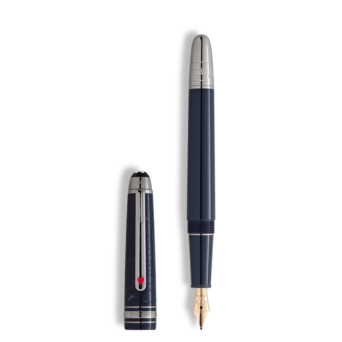 Die Meisterstück Around the World in 80 Days Kollektion ist von Jules Vernes berühmtem Abenteuerroman inspiriert. Der Classique Füllfederhalter aus dunkelblauem Edelharz erzählt die epische Reise von Mr. Fogg und Passepartout. Auf der letzten Etappe von Yokohama zurück nach London über die Vereinigten Staaten durchqueren die beiden den riesigen amerikanischen Kontinent mit dem Zug. Entdecken Sie die filigranen Details – einen elegant auf die Kappe gelaserten Zug, ein Sicherheitskettenmuster auf dem Konus, das an den entscheidenden Moment erinnert, als Passepartout den Zug von der Lokomotive abkoppelt, um die von den Sioux angegriffene Besatzung zu retten.Das Design der Kappe zeigt Druckventile und den aufsteigenden Rauch der Lokomotive, während der Clip mit einem rot lackierten Herzkarten-Symbol die Verbindung zwischen Phileas Fogg und Prinzessin Aouda symbolisiert. Darüber hinaus stehen die Kartensymbole für Foggs gewagte Wette, die Reise in nur 80 Tagen zu absolvieren. Auf der Oberseite der Kappe ist die Zeitachse der Reise eingeprägt – 36 Tage von Yokohama nach London, gipfelnd in insgesamt 80 Tagen um die Welt.Dieses Schreibgerät wird durch eine handgefertigte 14-Karat-Goldfeder mit den Markierungen 14/11 und 21/12 aufgewertet – eine Erinnerung an Mr. Foggs Abreise aus Yokohama am 14. November und seinen ehrgeizigen Plan, bis zum 21. Dezember in den Londoner Club zurückzukehren, um die Wette zu gewinnen. Sie ist außerdem mit der Darstellung eines Heißluftballons verziert, einer Anspielung auf Jules Vernes ersten Abenteuerroman. Ident-Nr. MB132879 Physisches Gewicht 23,177 g Abmessungen 139,2 mm * 16,1 mm