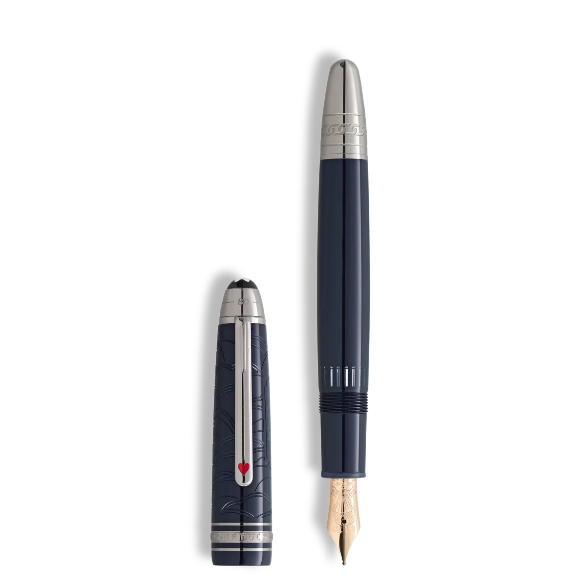 Die Kollektion Meisterstück Around the World in 80 Days ist von Jules Vernes berühmtem Abenteuerroman inspiriert. Der LeGrand Füllfederhalter aus dunkelblauem Edelharz erzählt die epische Reise von Mr. Fogg und Passepartout. Auf der letzten Etappe von Yokohama zurück nach London über die Vereinigten Staaten durchqueren die beiden den riesigen amerikanischen Kontinent mit dem Zug. Entdecken Sie die filigranen Details – einen elegant auf die Kappe gelaserten Zug, ein Sicherheitskettenmuster auf dem Konus, das an den entscheidenden Moment erinnert, als Passepartout den Zug von der Lokomotive abkoppelt, um die von den Sioux angegriffene Besatzung zu retten.Das Design der Kappe zeigt Druckventile und den aufsteigenden Rauch der Lokomotive, während der Clip mit einer rot lackierten Herzkarte verziert ist, die die Verbindung zwischen Phileas Fogg und Prinzessin Aouda symbolisiert. Darüber hinaus stehen die Kartenfarben für Foggs gewagte Wette, die Reise in nur 80 Tagen zu absolvieren. Auf der Oberseite der Kappe ist die Zeitachse der Reise eingeprägt – 36 Tage von Yokohama nach London, gipfelnd in insgesamt 80 Tagen um die Welt.Dieses Schreibgerät wird durch eine handgefertigte 14-Karat-Goldfeder mit den Markierungen 14/11 und 21/12 aufgewertet – eine Erinnerung an Mr. Foggs Abreise aus Yokohama am 14. November und seinen ehrgeizigen Plan, bis zum 21. Dezember in den Londoner Club zurückzukehren, um die Wette zu gewinnen. Zudem ist sie mit der Darstellung eines Heißluftballons verziert, einer Anspielung auf Jules Vernes ersten Abenteuerroman. Ident-Nr. MB132874 Physisches Gewicht 29,891 g Abmessungen 146,1 mm * 17,8 mm