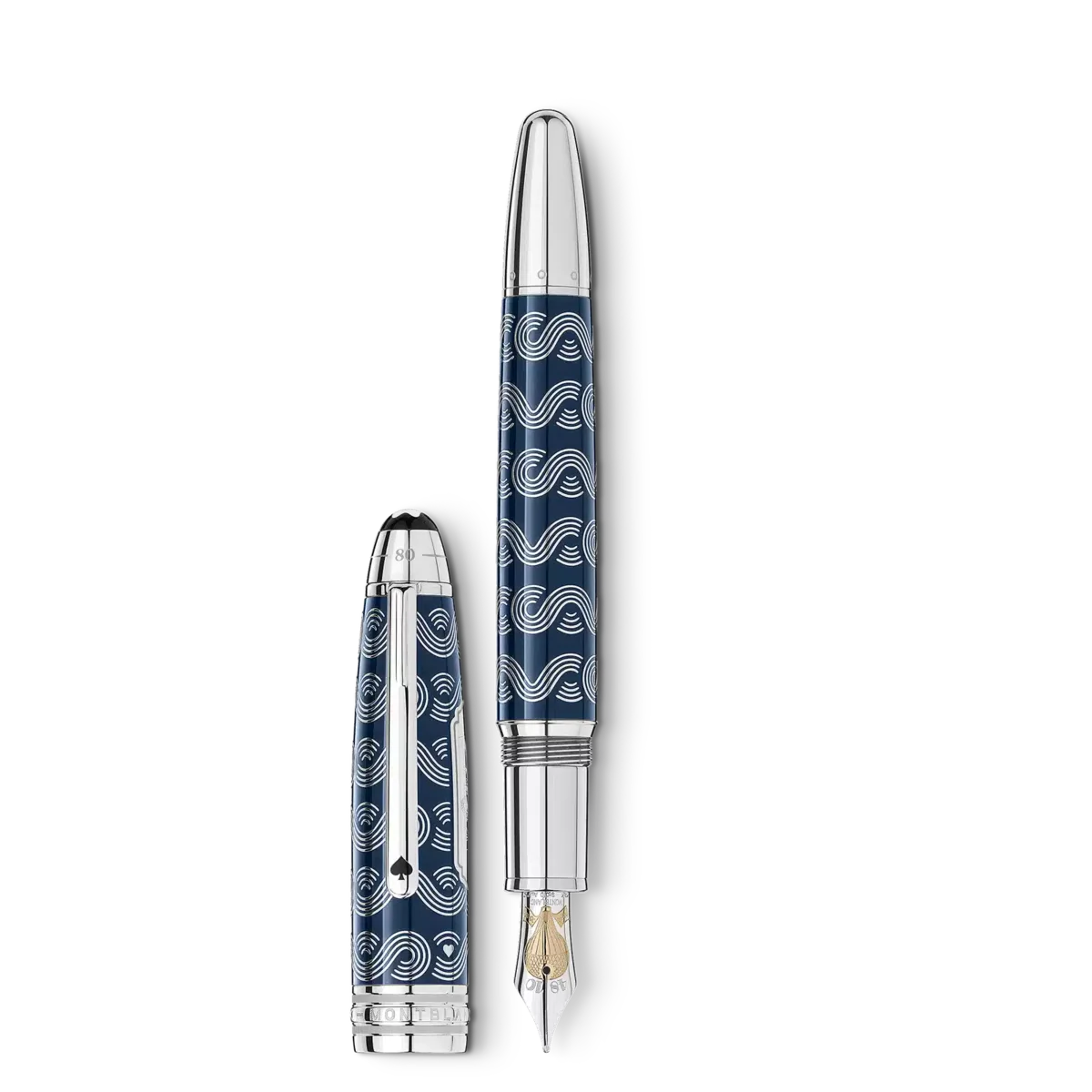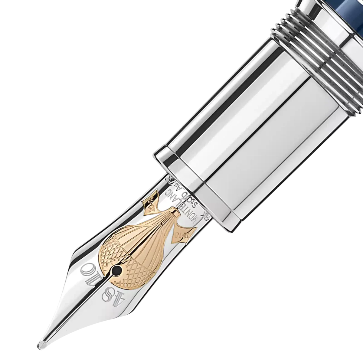 Die Kollektion Meisterstück Around the World in 80 Days ist vom berühmten Abenteuerroman von Jules Verne inspiriert. Der Füllfederhalter Solitaire Le Grand in blauem, transluzentem Lack mit Farbverlauf greift den ersten Teil der Reise auf. Die Hauptfigur reist hauptsächlich mit dem Dampfschiff von London nach Bombay, überquert dabei das Mittelmeer und durchquert den Suezkanal. Die Kappe und der Schaft sind mit einem gefrästen Muster verziert, das die wichtigsten Elemente des Romans darstellt: Meereswellen, Kartensymbole und eine Kartusche mit einem lasergravierten Dampfschiff. Auf der Kappenoberseite ist die Länge der Reise eingeprägt: 18 Tage von London nach Bombay und insgesamt 80 Tage. Das Schreibgerät ist mit einer handgefertigten, zweifarbigen Feder aus 750er Gold mit Rhodium- und Champagnerbeschichtung versehen, die mit einem Heißluftballon und dem Start- und Enddatum der abenteuerlichen Reise verziert ist.