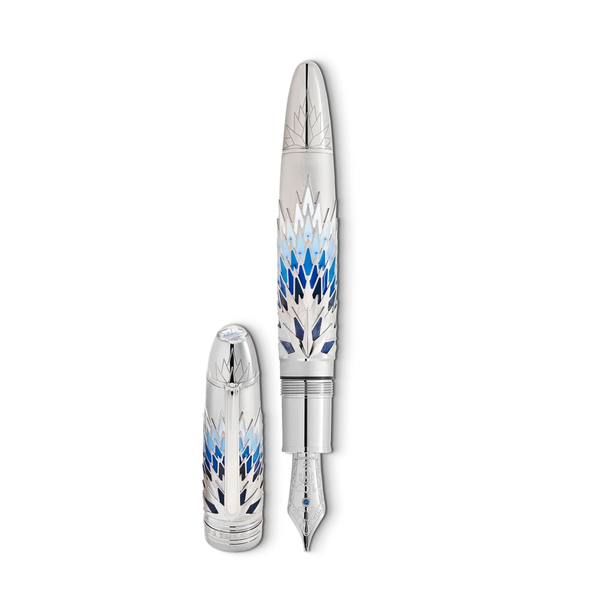 Seit seiner Einführung im Jahr 1924 gilt der Meisterstück von Montblanc weithin als das Nonplusultra unter den edlen Schreibgeräten, das für raffinierten Geschmack und eine kühne Selbstdarstellung steht. Anlässlich des 100-jährigen Jubiläums von Meisterstück erweitert Montblanc sein bestehendes Meisterstück Calligraphy-Programm um eine Limited Edition, die der „Inspire Calligraphy”, der künstlerischsten Form des Schreibens, gewidmet ist. Diese Limited Edition ist aus massivem 750er Weißgold gefertigt und verfügt über eine neue Kalligraphie-Feder und spezielle Handwerkstechniken. Die Italic-Feder ziert stolz die Zahl „100“ sowie die Jahreszahlen „1924“ und „2024“ und ist mit einem Saphir besetzt. Das Design der Kappe und des Schafts ist eine Hommage an die historische Verbindung zwischen Federkielen, Schrift und Ästhetik. Sie sind mit handgefertigten Lackintarsien in einer reichen Palette von Blautönen verziert, die durch Intarsien aus echten Federn, die kunstvoll von Hand eingesetzt wurden, noch verstärkt werden. Die hundertjährigen Kappenringe tragen ebenfalls die Jahreszahlen „1924“ und „2024“. Als Krönung des Schreibgeräts sind winzige Federbarben miteinander verflochten und zu einem Montblanc-Emblem geformt, das unter einer Kuppel aus Bergkristall platziert ist.