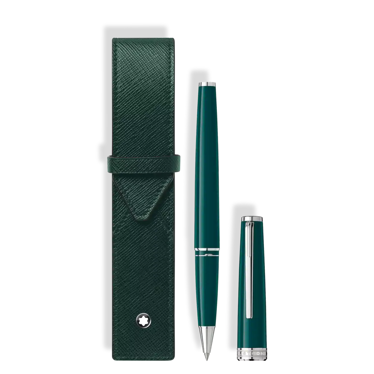 Das Set enthält einen PIX Rollerball Deep Green und eine Stifttasche Sartorial Deep Green. Der Rollerball ist aus edlem Harz gefertigt und mit platinbeschichteten Beschlägen versehen. Die Kappe ist mit einem weißen Montblanc Emblem gekrönt. Bewahren Sie Ihr Schreibgerät sicher und stilvoll in diesem speziellen Stiftetui auf. Vollnarbiges Leder sorgt für eine angenehme Haptik, während die überlappende Silhouette an die Form eines Briefumschlags erinnert und damit eine weitere Hommage an das geschriebene Wort darstellt.