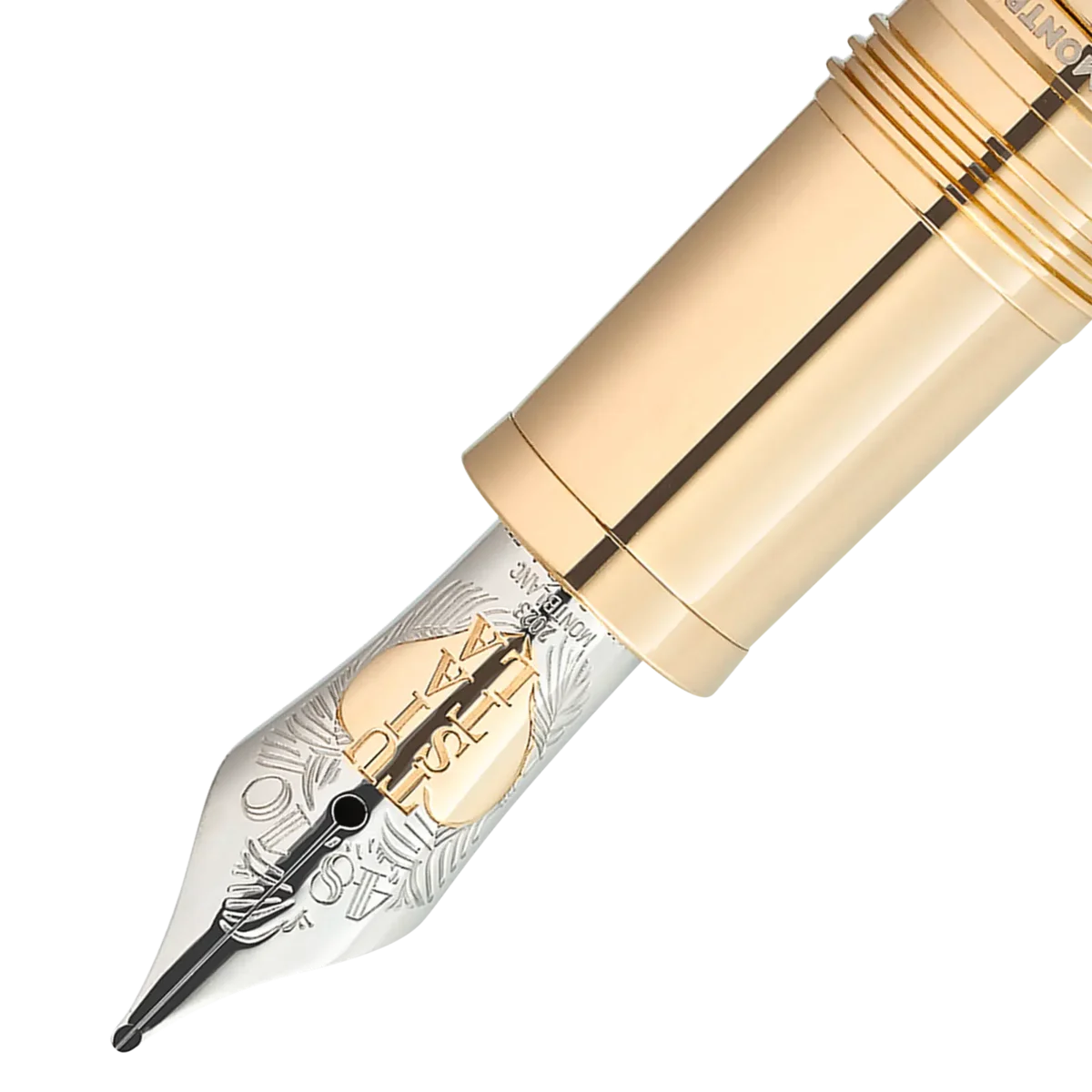 Robert Louis Stevenson, 1850 in Edinburgh, Schottland, geboren, hatte zwei große Wünsche: Freiheit und das Eintauchen in andere Welten. Er verfasste Essays und Reiseberichte sowie seine legendären Abenteuergeschichten, die von markanten Charakteren bevölkert sind, deren Namen den Lesern auf der ganzen Welt einen Schauer über den Rücken jagen: Long John Silver, Captain Flint, Jekyll und Hyde. Die Montblanc Writers Edition Homage to Robert Louis Stevenson ist diesem fantasievollen Geschichtenerzähler gewidmet. Der Roman „Die Schatzinsel“ inspirierte viele Designdetails der Edition. Die Gesamtform des Schreibgeräts und die Ringe auf dem Konus vermitteln den Eindruck eines historischen, ausziehbaren Fernrohrs. Eine der gefährlichsten Figuren an Bord der Hispaniola ist Long John Silver, der auf der Kappe als handgravierte, mit Lack ausgefüllte Figur verewigt ist. Long John Silvers treuer Papagei Captain Flint ist ebenfalls als handgravierte, mit Degradé-Lack überzogene Figur in das Gitter eingebettet. Um den oberen Ring der Kappe herum befindet sich die erste Zeile des Requiems, das Stevenson für sich selbst geschrieben hat: „UNDER THE WIDE AND STARRY SKY” (Unter dem weiten und sternenklaren Himmel). Die Schrift ist spiegelverkehrt und erinnert an das Thema der Dualität in Stevensons Roman „Der seltsame Fall des Dr. Jekyll und Mr. Hyde”. Der mit Gelbgold überzogene Clip imitiert die Form eines Belaying-Pins, an dem die Takelage auf einem Schiff wie der Hispaniola befestigt ist. Hinter dem Clip sowie auf dem Schaft dieser Edition ist eine stilisierte Kompassrose in das massive Au 750 Gelbgoldgitter eingearbeitet. Stevensons handgezeichnete Schatzkarte, die Ausgangspunkt und Mittelpunkt des gesamten Romans ist, ist in den Schaft aus 925er Sterlingsilber eingraviert. Die Feder besteht aus zwei Elementen: dem Wort „Tusitala“ – ein Name, den die Samoaner Stevenson gaben und der übersetzt „Geschichtenerzähler“ bedeutet – und Palmblättern, die Stevensons Ankunft auf Samoa, seiner geliebten Pazifikinsel, symbolisieren.