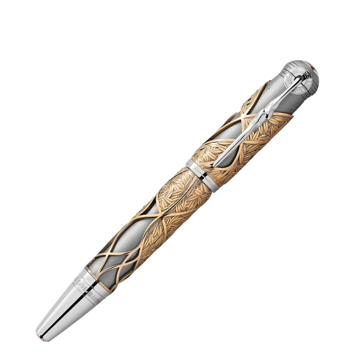 „Es war einmal …“ Die Montblanc Writers Edition Homage to the Brothers Grimm ist Jacob und Wilhelm Grimm gewidmet und würdigt ihre Arbeit an deutschen und europäischen Volksmärchen, darunter einige der berühmtesten Märchen wie „Schneewittchen“, „Aschenputtel“ und „Dornröschen“. Die Gesamtform des Schreibgeräts erinnert an einen alten Wanderstock. Diese Edition aus Metall mit einer speziellen Vintage-Beschichtung ist von der Geschichte „Dornröschen“ inspiriert, was sich in den ineinander verschlungenen Blättern und Dornen um die Kappe und den Schaft widerspiegelt. Die Kappe wird vom Montblanc Emblem aus kostbarem Perlmutt gekrönt. Der platinbeschichtete Clip, der an ein knorriges Stück Holz erinnert, offenbart überraschenderweise die Silhouette des Profils der Brüder Grimm, wenn man ihn dreht. Als Hommage an die Magie des Geschichtenerzählens trägt die handgefertigte Au 750 massive zweifarbige Goldfeder mit Rhodiumbeschichtung die Flammen eines Feuers, das oft der Schauplatz war, an dem Volksmärchen weitergegeben wurden.