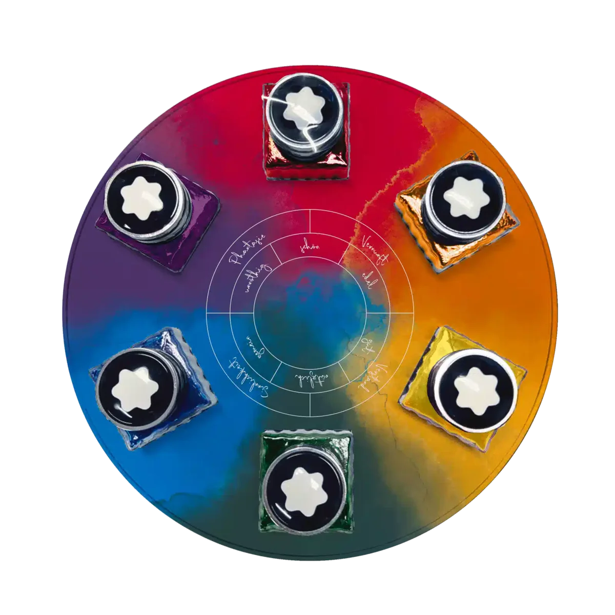 Tintenflaschen-Set, Writers Edition Hommage an Johann Wolfgang von Goethe – 6 x 30 ml Diese Edition ist eine Hommage an die Farbenlehre von Johann Wolfgang von Goethe. Das Farbrad bietet 6 verschiedene Tintenfarben: Amethystpurpur, Ägyptischblau, Modenarot, Manganorange, Goldgelb und Irischgrün. Jede Flasche enthält 30 ml.