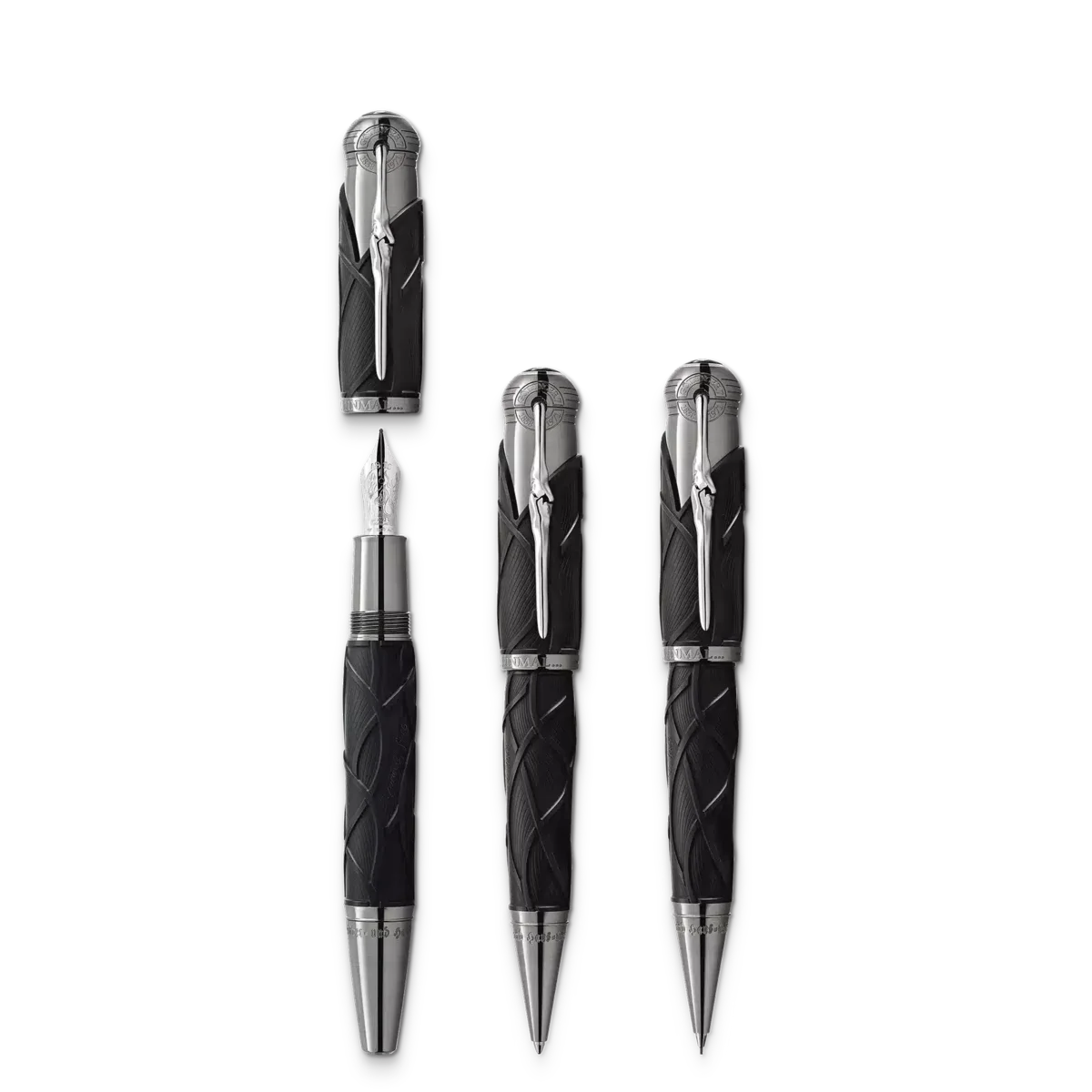 „Es war einmal …“ Die Montblanc Writers Edition Homage to the Brothers Grimm ist Jacob und Wilhelm Grimm gewidmet und würdigt ihre Arbeit an deutschen und europäischen Volksmärchen, darunter einige der berühmtesten Märchen wie „Schneewittchen“, „Aschenputtel“ und „Dornröschen“. Die Gesamtform des Schreibgeräts erinnert an einen alten Wanderstock, während die schwarze Farbe an die Dunkelheit der Wälder erinnert, die in den Märchen der Brüder Grimm oft als Schauplatz dienen. Das wellenförmige Muster auf Kappe und Schaft ist von Rapunzels Haaren inspiriert und erinnert gleichzeitig an Wurzeln, da die Brüder Grimm ihre sprachwissenschaftliche Arbeit als „Erforschung der Wurzeln” betrachteten. Die Kappe wird vom Montblanc Emblem aus kostbarem Harz gekrönt. Der platinbeschichtete Clip, der an ein knorriges Stück Holz erinnert, offenbart überraschenderweise die Silhouette des Profils der Brüder Grimm, wenn man ihn dreht. Ident-Nr. MB128368