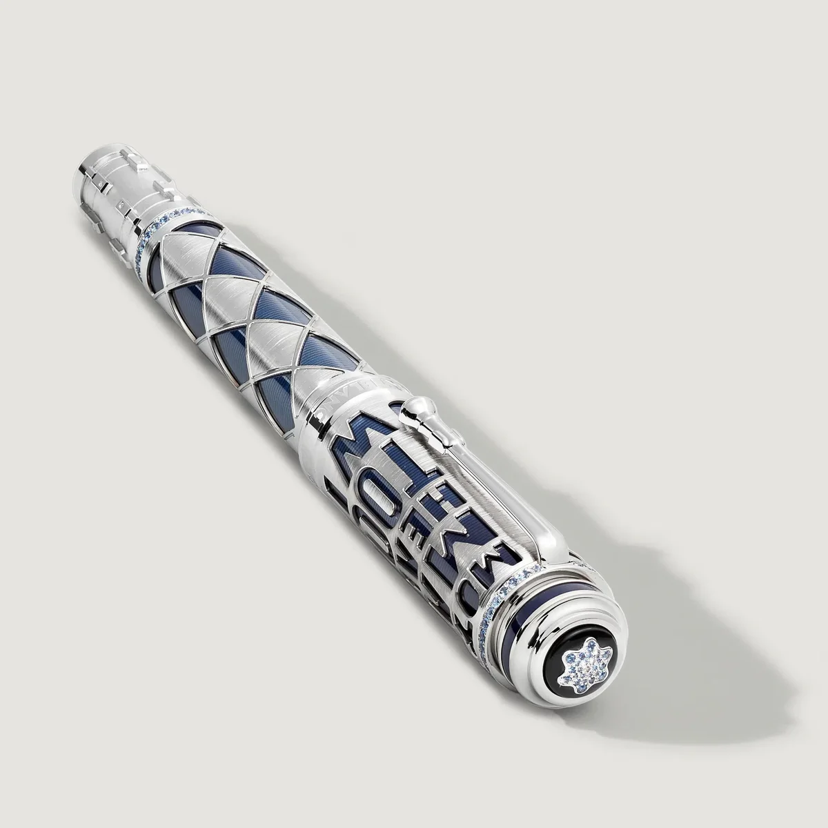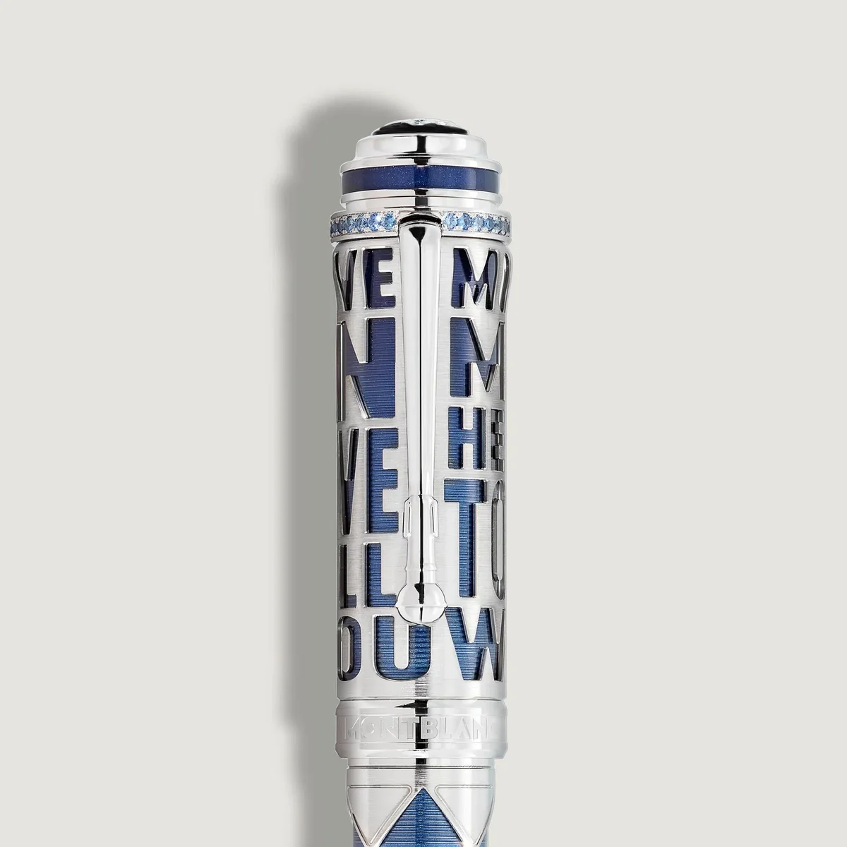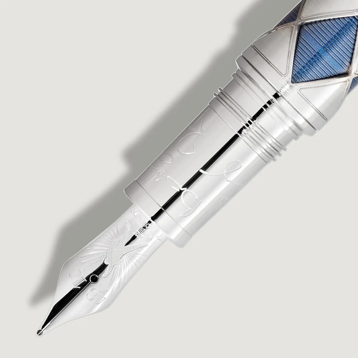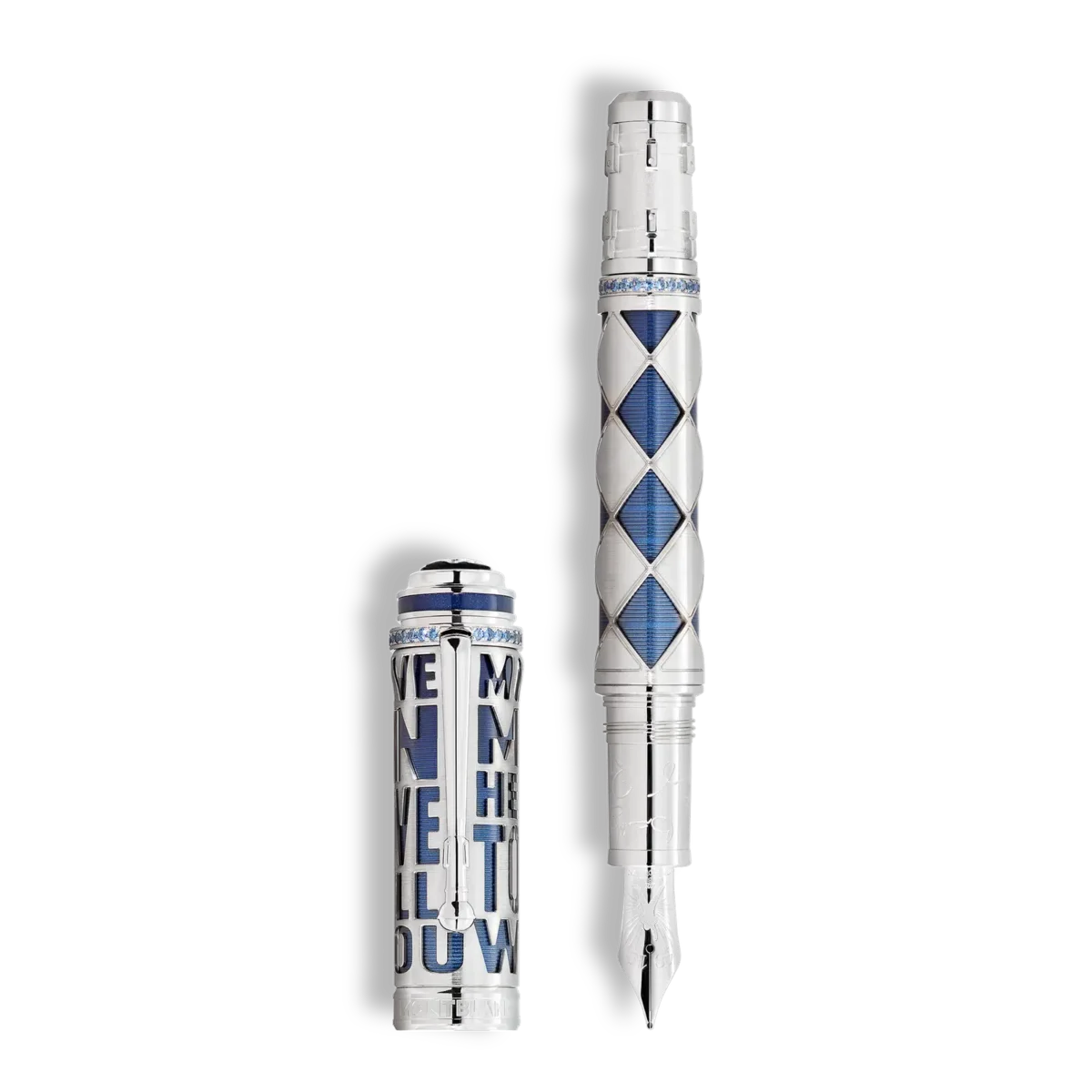 In der reichen Geschichte der Rockmusik gibt es nur wenige Namen, die so konstant glänzen wie der von Queen. Mit einer Karriere, die sich über fünf Jahrzehnte erstreckt, ist die Band eine der erfolgreichsten aller Zeiten. In dieser Zeit verkörperte Queen die Kraft musikalischer Kreativität, und die meisten ihrer Songs standen wochenlang an der Spitze der Charts. Sie schufen so etwas wie ihr eigenes musikalisches Universum, bestehend aus einer Kombination aus Hardrock, Glamrock, Pop, Funk und Oper, und sprengten damit die Grenzen zwischen den Genres. Zu Ehren des allerletzten Queen-Albums zieren die Titel von drei seiner Songs die massive Au 750 Weißgold-Skelettüberlagerung auf der Kappe: Mother Love, Made In Heaven und Too Much Love Will Kill You. Die Rillen auf dem kontrastierenden blauen Lack darunter spiegeln genau die gleichen Rillen des Albums Made in Heaven wider. Der Farbverlauf von Dunkelblau über Hellblau zurück zu Dunkelblau erinnert an die Farbgebung des Albumcovers. Bei der Zusammenstellung ihrer Alben gingen die vier Bandmitglieder bis an die Grenzen der künstlerischen und technischen Möglichkeiten des Aufnahmestudios. Aber die Band live zu sehen, war etwas ganz anderes. Ihre sensationellen Live-Shows – von 1970 bis 1986 spielten sie mehr als 700 Konzerte – waren ein Spektakel für sich, das Legendenstatus erlangte. Mercury selbst, bekannt für seine extravaganten Bühnenkostüme, schlüpfte oft in die Rolle einer Figur aus der Commedia dell’Arte, dem Harlekin. Sein berühmter, eng anliegender Ganzkörperanzug mit schwarz-weißem Rautenmuster unterstrich seine unkonventionelle Bühnenpräsenz. Die Great Characters Homage to Queen Limited Edition 30 greift dieses rautenförmige Design für den Schaft auf, kunstvoll interpretiert in Form von massiven Diamantformen aus 750er Weißgold auf blauem Lack. Ein Band aus blauen Saphiren markiert den Übergang vom Korpus zum mit Weißgold überzogenen Konus, dessen Form an die Lautstärke- und Tonregler einer E-Gitarre erinnert, dem Instrument, das ein Schlüsselelement des unverwechselbaren Sounds von Queen war. In die Spitze des Konus ist eine einzigartige Einlage aus Holz von Roger Taylors originalen Drumsticks eingelassen, die aufwendig mit Gitarrensaiten verwoben ist, die Brian May selbst einst gespielt hat. Als Hommage an das Album „Made In Heaven“ und zum 30-jährigen Jubiläum seiner Veröffentlichung ist die Auflage auf nur 30 Stück limitiert. In Anlehnung an das Cover zeigt die handgefertigte, rhodinierte Feder aus massivem 750er Gold die Silhouette von Freddie Mercury in einer seiner ikonischsten, triumphalen Bühnenposen. In Anerkennung der wichtigen Rolle, die jedes einzelne Bandmitglied gespielt hat, zieren ihre Unterschriften die Vorderseite des Schreibschmucks. Ein Ring aus kostbaren blauen Saphiren windet sich um die Kappe aus massivem 750er Weißgold, über der sich das Montblanc-Emblem aus blauen Saphiren in Pavé-Fassung befindet. In Erinnerung an die mitreißende Bühnenpräsenz der Band ist der Clip einem Mikrofonständer nachempfunden – einem einfachen Requisit, das bei Live-Auftritten für spektakuläre Effekte sorgt.