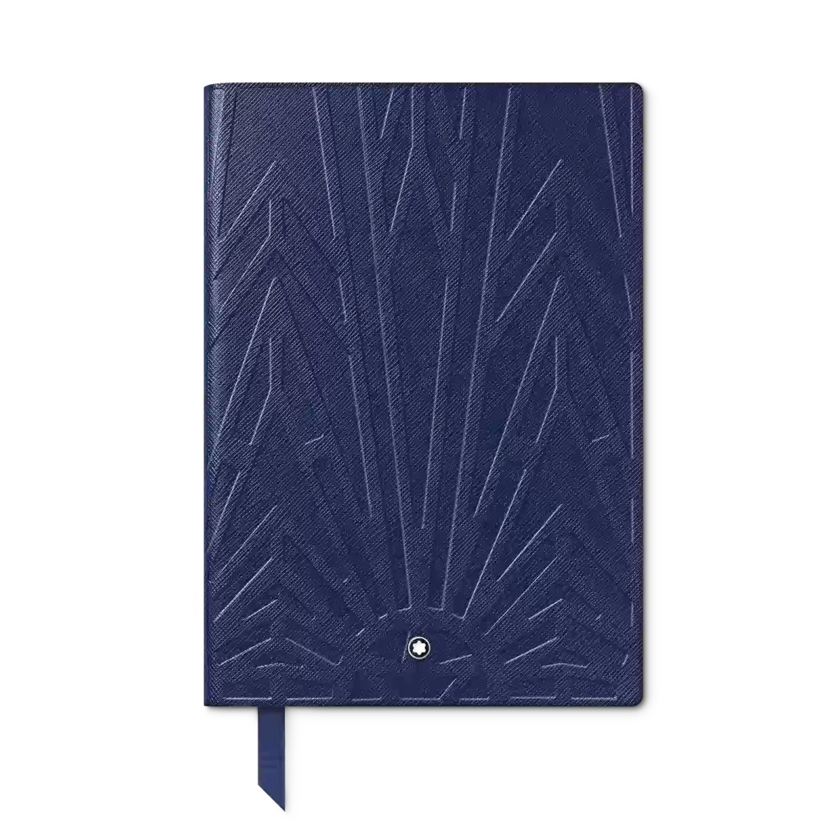 Notizbuch Nr. 163 mittel, Meisterstück The Origin Collection, blau – liniert. Das Art-Déco-Muster der Schreibgeräte ist auf dem Einband geprägt. Hergestellt in Italien. 120 Blatt/240 Seiten. Maße 170 x 240 mm.
