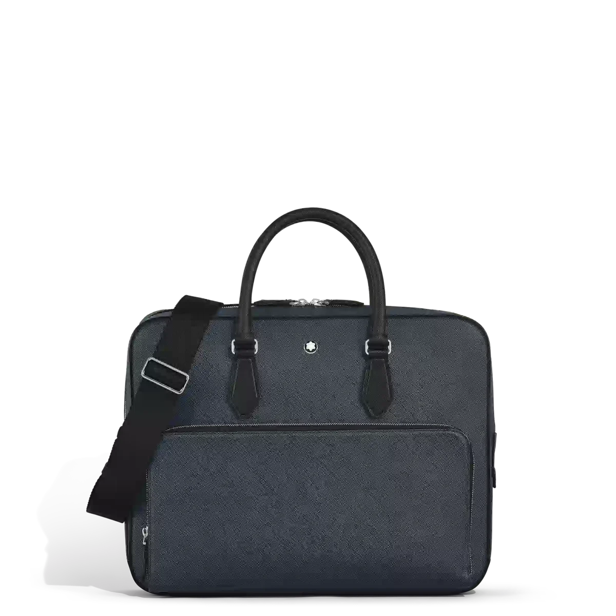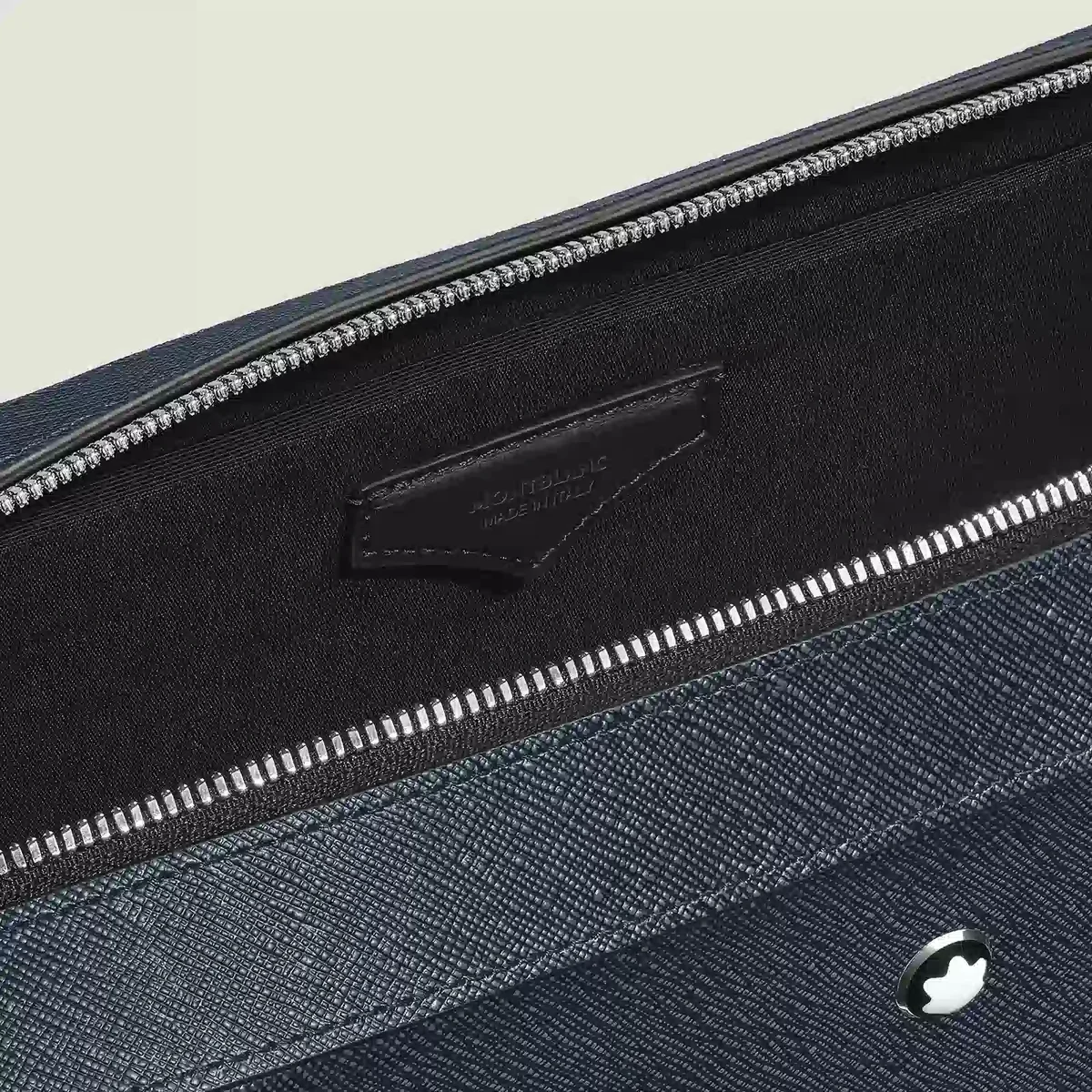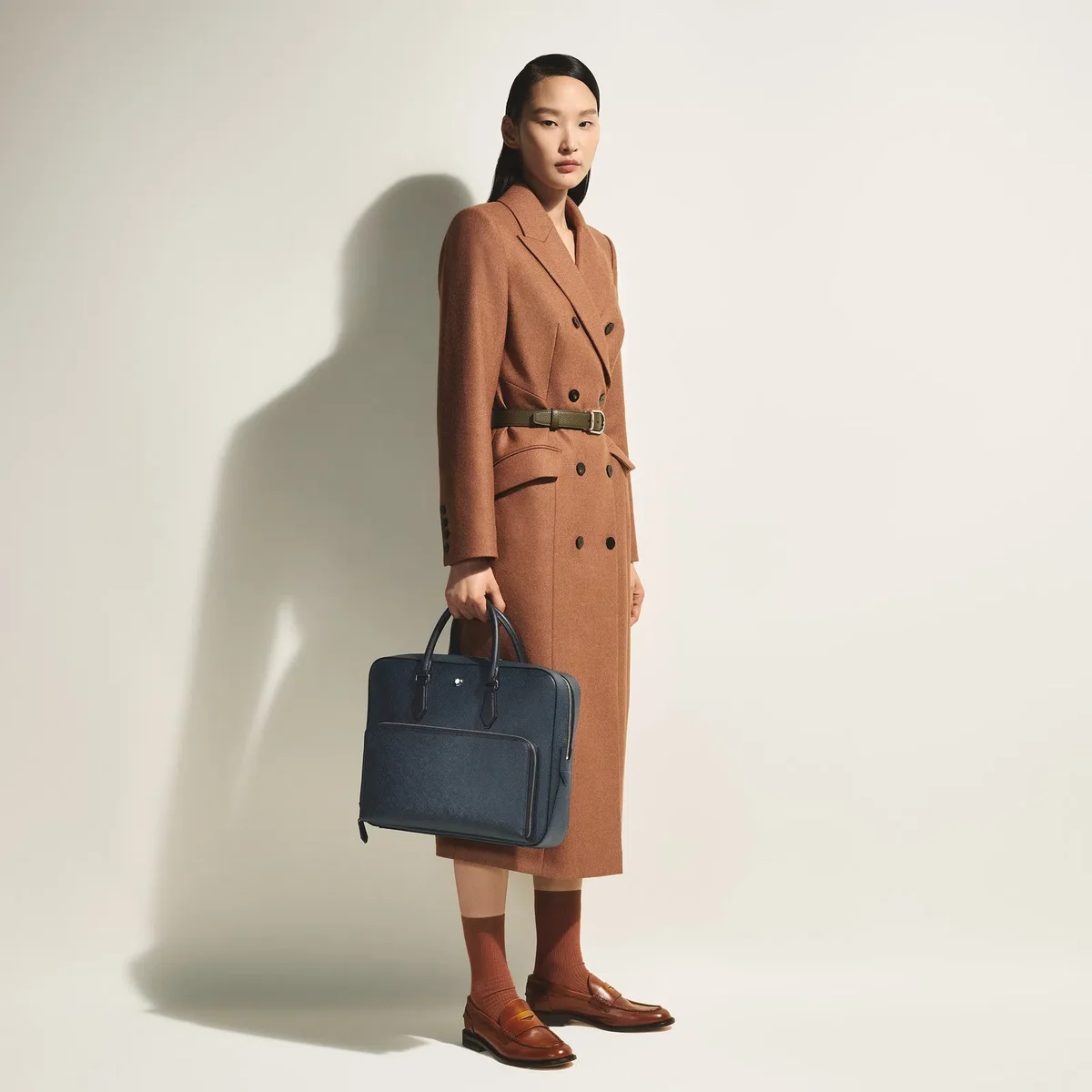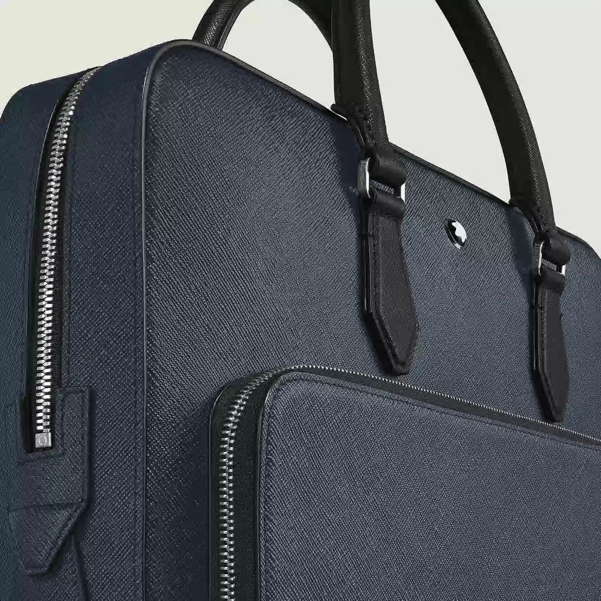 Diese elegante Tasche verfügt über ein geräumiges Hauptfach für den Transport von A4-Dokumenten, Laptops bis zu 13 Zoll, elektronischen Geräten und anderen beruflichen Utensilien. Sie ist aus zweifarbig geprägtem Sartorial-Leder in Schwarz und Blau gefertigt und wurde speziell für geschäftliche Anforderungen entwickelt. Ihre Schreibutensilien können in speziellen Schlaufen verstaut werden, während andere Gegenstände sicher in einer Reißverschlusstasche oder in den beiden zusätzlichen offenen Fächern untergebracht werden können.