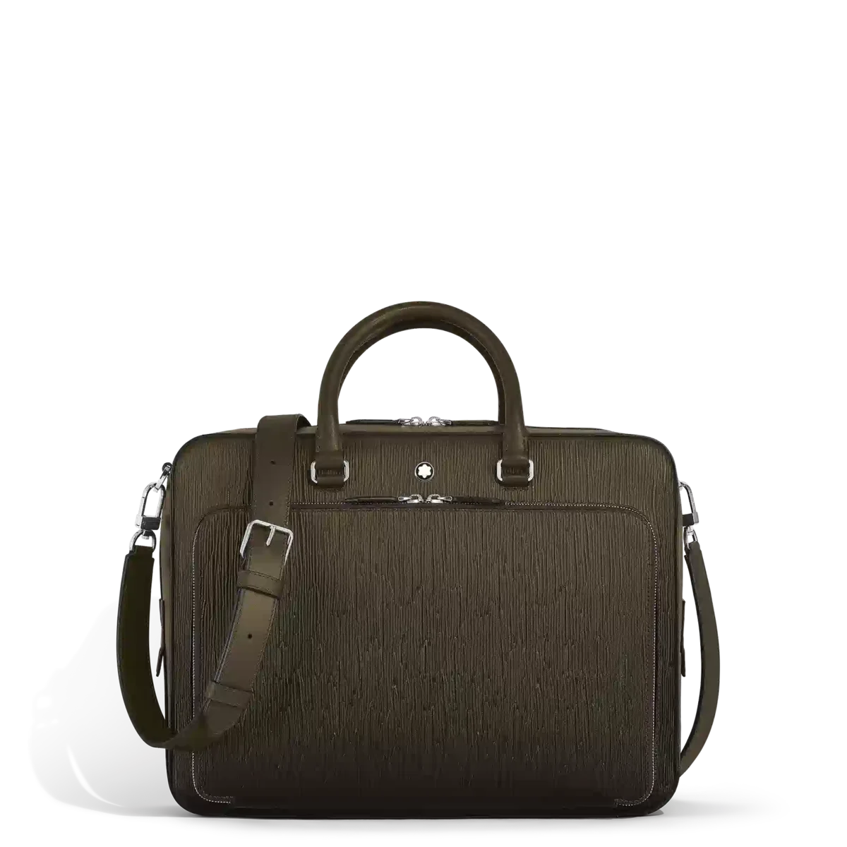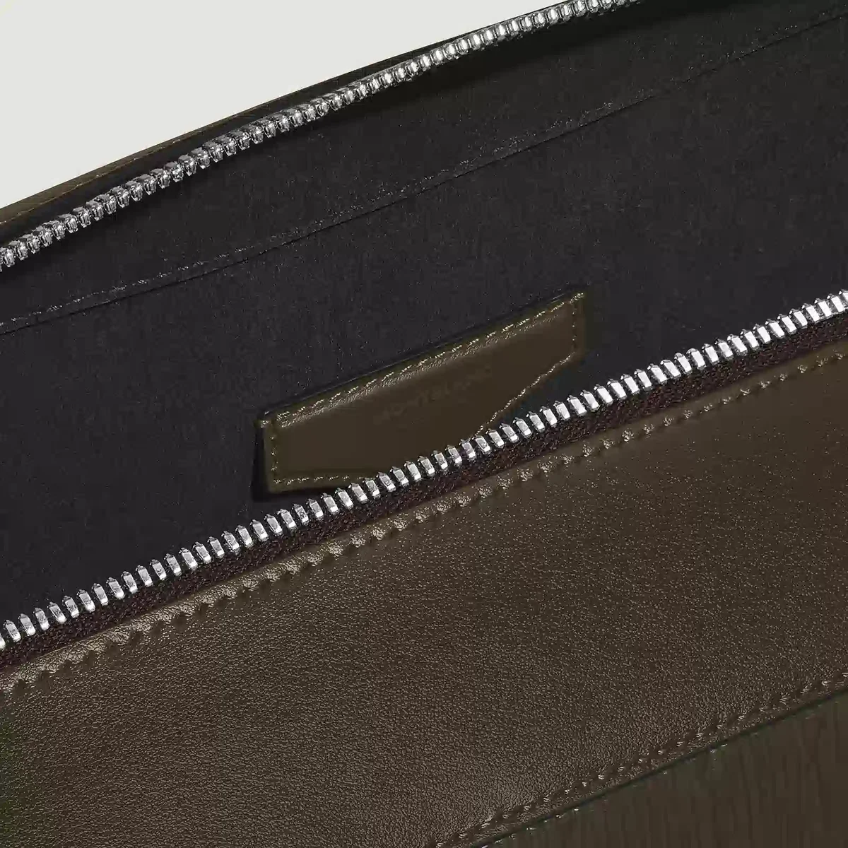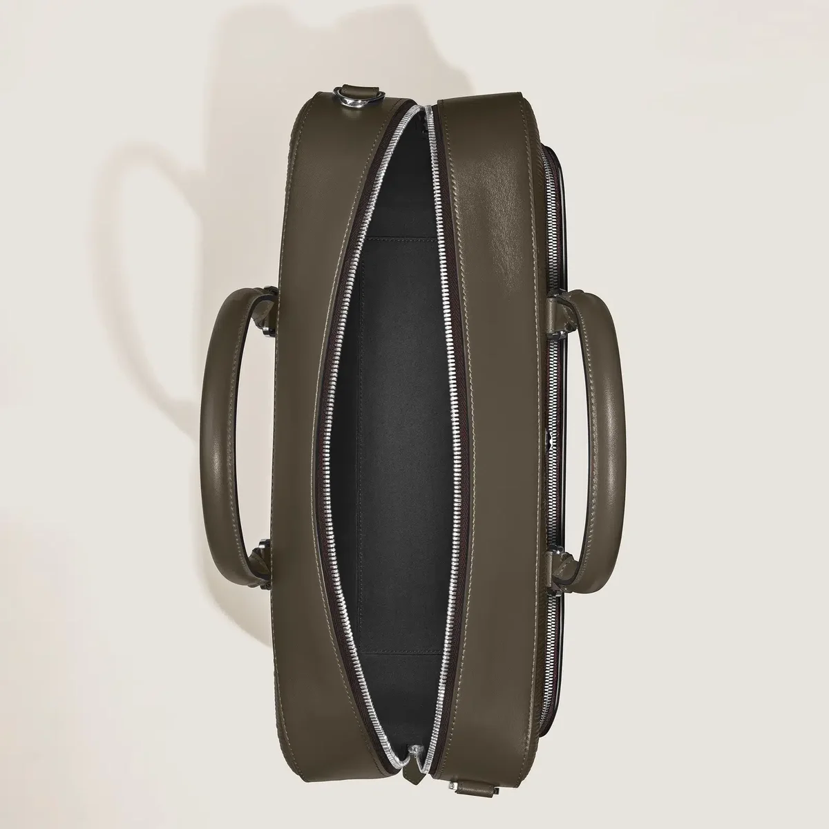 Diese Aktentasche aus khakifarbenem Corteccia-Leder wurde entwickelt, um unterwegs die Kreativität anzuregen. Ihr einzigartiges vertikales Rindenmotiv, das durch den von Hand aufgetragenen Sfumato-Effekt verstärkt wird, spiegelt die natürliche Schönheit von Baumrinde in einer raffinierten, erdigen Farbpalette wider. Wie ein Kuriositätenkabinett lässt sich die große Fronttasche mit Reißverschluss öffnen und verwandelt die Aktentasche in einen tragbaren Schreibtisch mit drei Schlaufen für Schreibgeräte, einem Uhrenhalter, einer offenen Tasche und Lederriemen zur Befestigung eines Notizbuchs. Im Inneren der Aktentasche befindet sich ein geräumiges Hauptfach mit einem gepolsterten Laptopfach für Geräte bis zu 13 Zoll. Mit einem abnehmbaren Schultergurt und einem Satellitensystem zur Befestigung an einem Trolley ausgestattet, verwandelt dieses einzigartige Objekt Reisen und Geschäfte in Gelegenheiten für Inspiration und Kreativität. Ident-Nr. MB220267 Abmessungen 360 mm * 100 mm * 300 mm