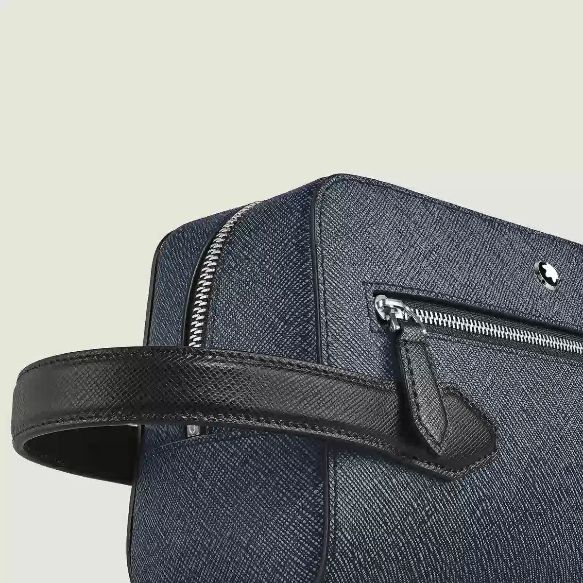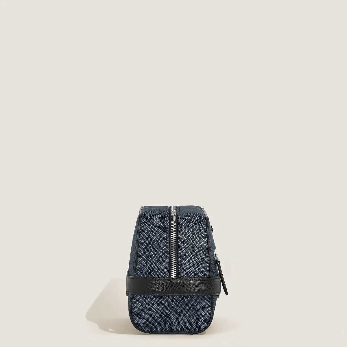 Ob auf Geschäftsreisen oder im Urlaub, diese Clutch ist ein unverzichtbarer Reisebegleiter. Sie ist aus geprägtem Sartorial-Leder in einer raffinierten zweifarbigen Kombination aus edlem Blau und Schwarz gefertigt und verfügt über einen geräumigen Innenraum und eine Außentasche mit Reißverschluss für Ihre wichtigsten Utensilien. Dank der Ledergriffe können Sie sie in der Hand tragen oder in einer Reisetasche verstauen.