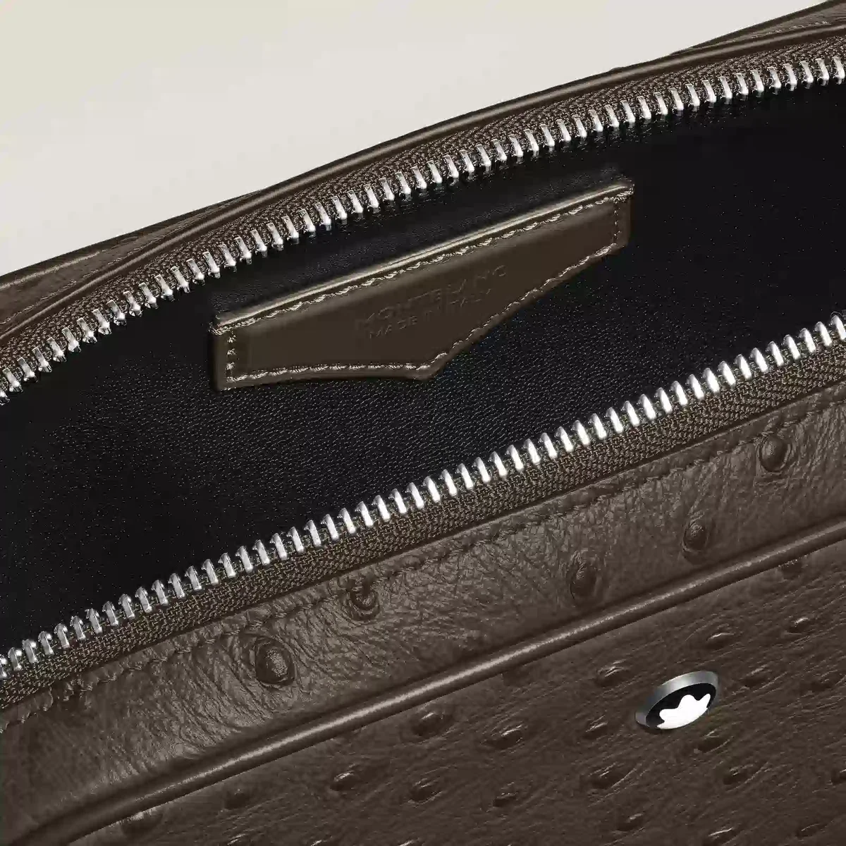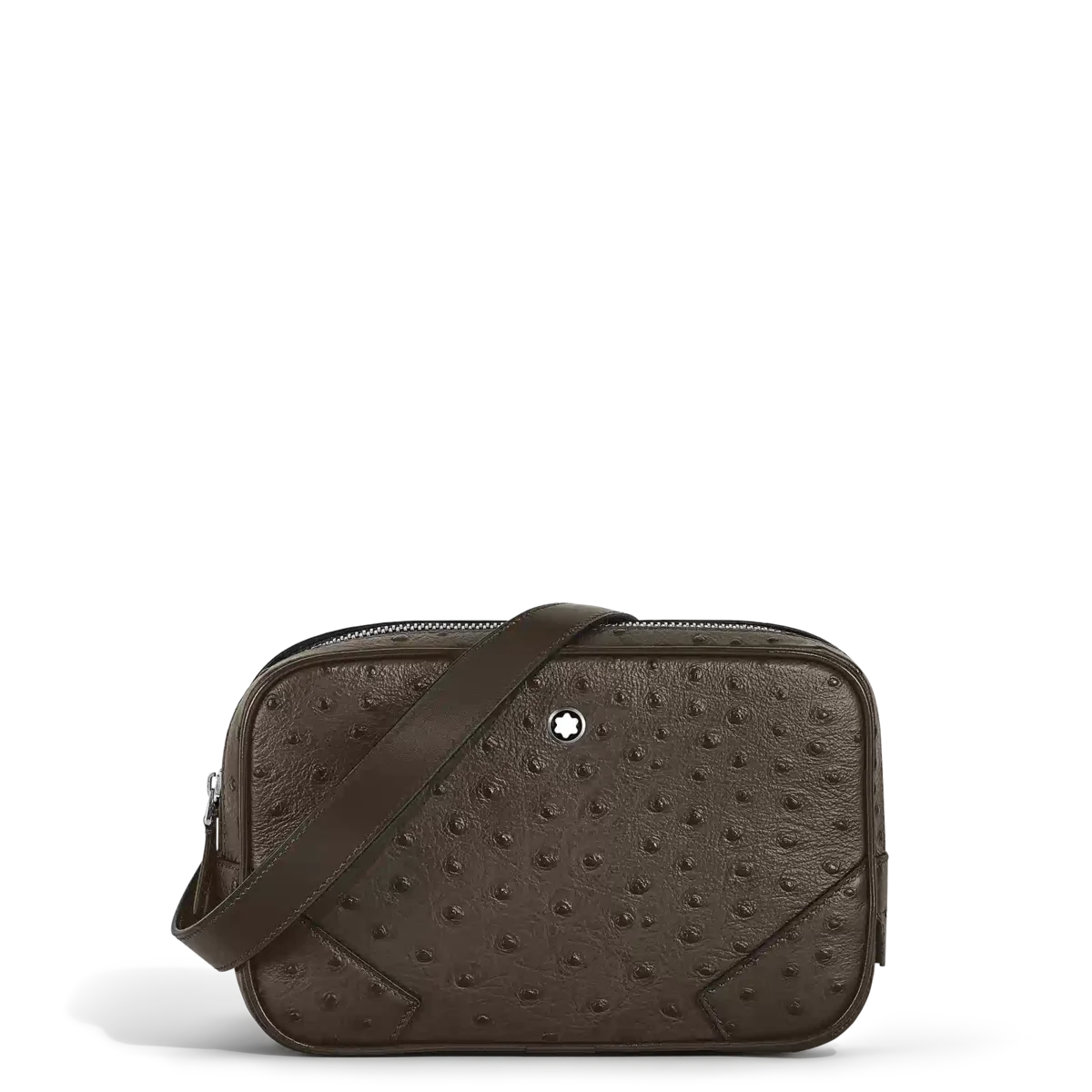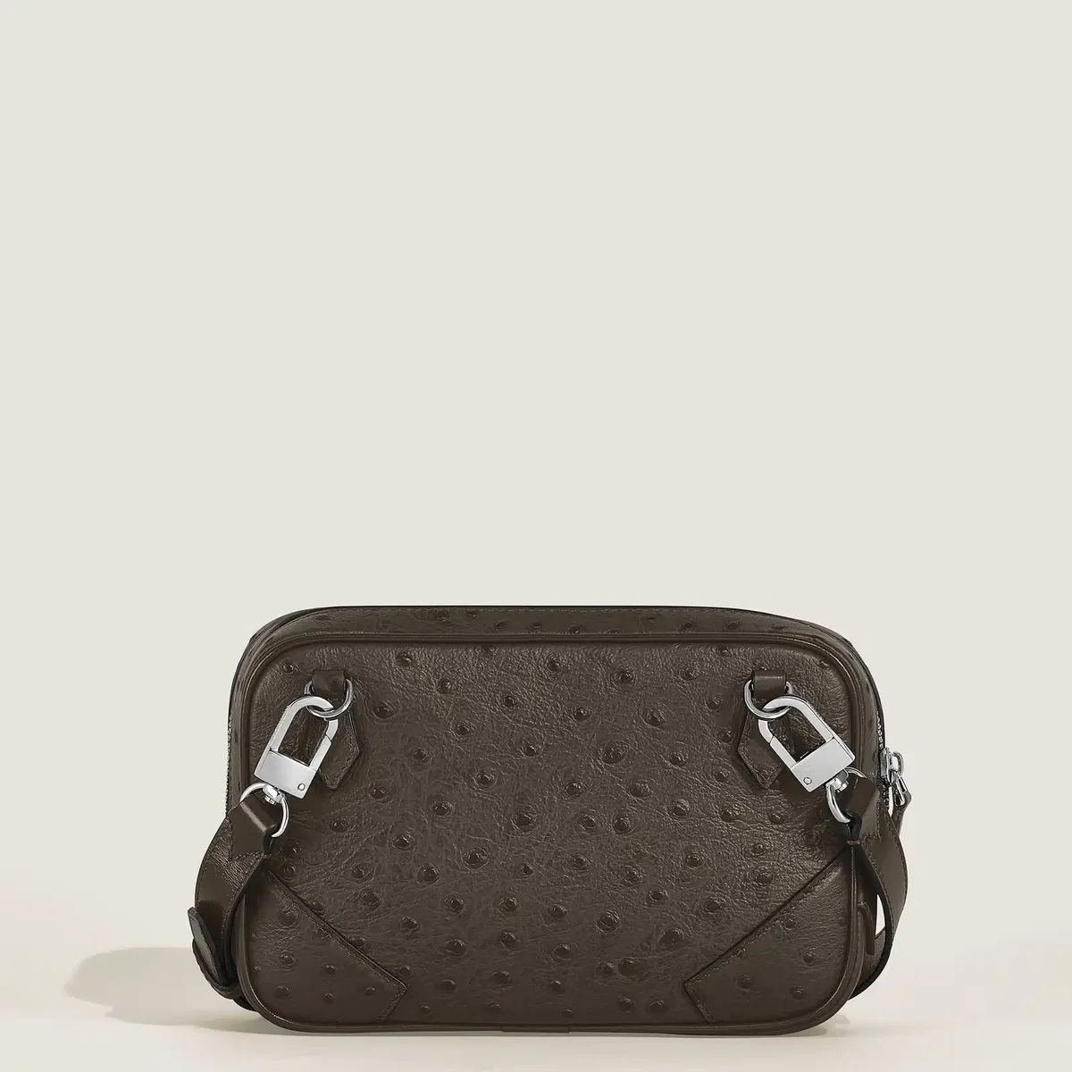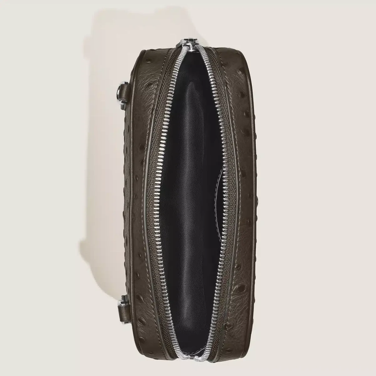 Die neue Mini-Umhängetasche aus stilvollem khakifarbenem Leder mit Straußenprägung ist eine elegante Hommage an die Kultur des Schreibens. Ihre markanten Eckdetails verleihen dem kompakten und dennoch funktionalen Design eine einzigartige Note. Mit ihrem abnehmbaren, verstellbaren Schulterriemen und einer offenen Tasche im Hauptfach ist sie ein raffinierter und vielseitiger Begleiter für den täglichen Gebrauch.