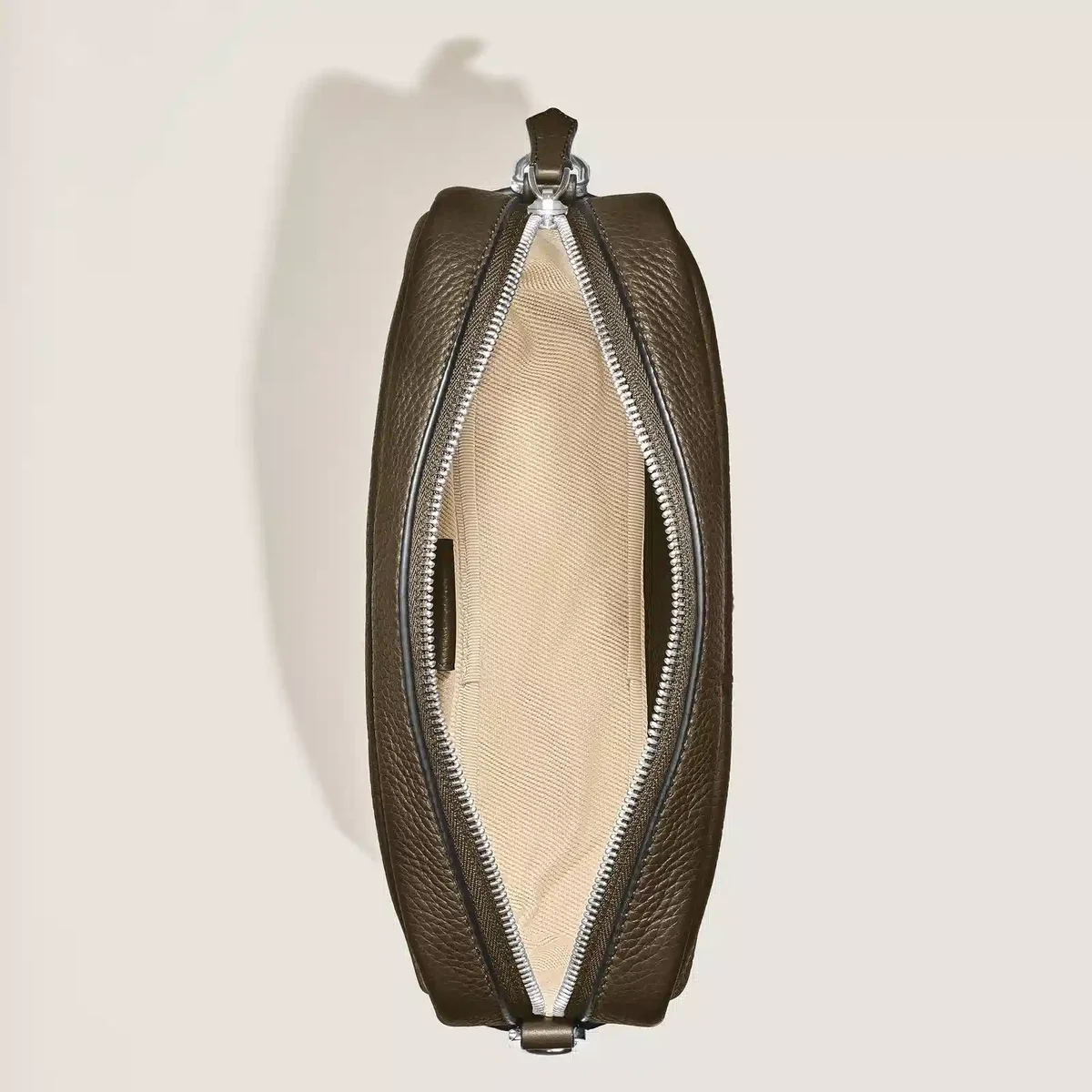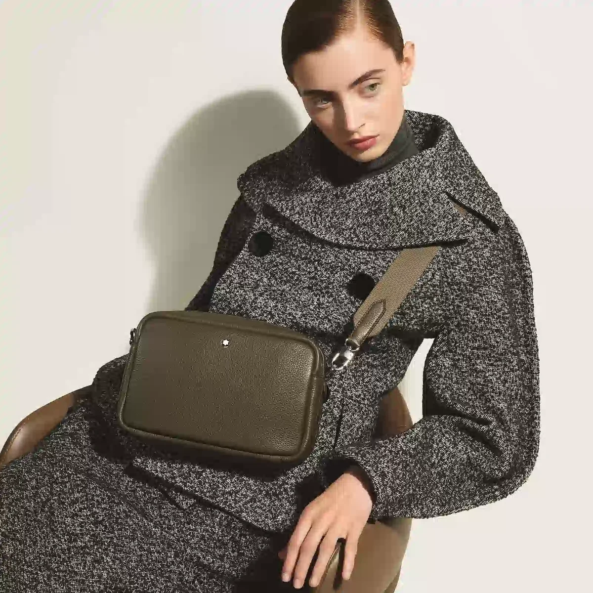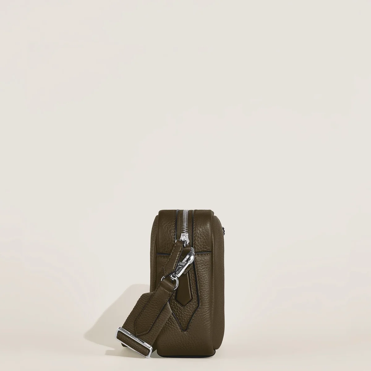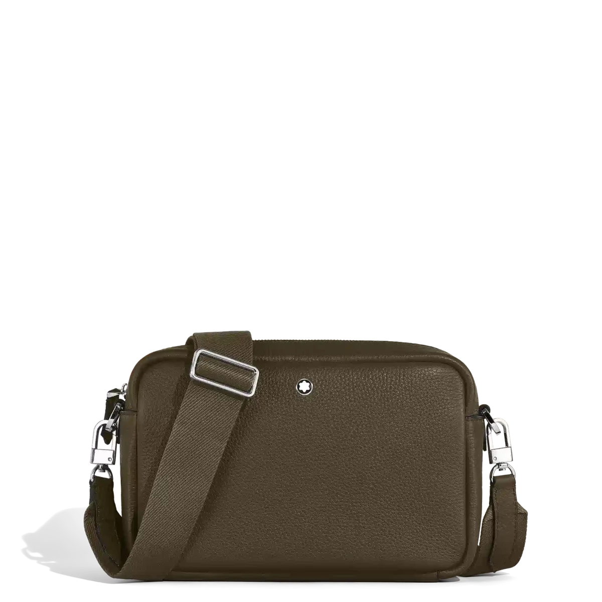Diese kleine Umhängetasche aus weichem, khakifarbenem Kalbsleder mit Narbung hat eine rechteckige Silhouette, die durch Meisterstück-Lederdetails wie einen auffälligen Reißverschlusszieher in Form einer Feder und raffinierte Sattelnaht, die an die Spur eines Füllfederhalters erinnert, ergänzt wird. Die Tasche ist auf Praktikabilität ausgelegt und verfügt über ein Hauptfach mit einer offenen Tasche und zwei Stifthaltern, während ein abnehmbarer, verstellbarer Schulterriemen vielseitige Trageoptionen mit mühelosem Stil bietet.
