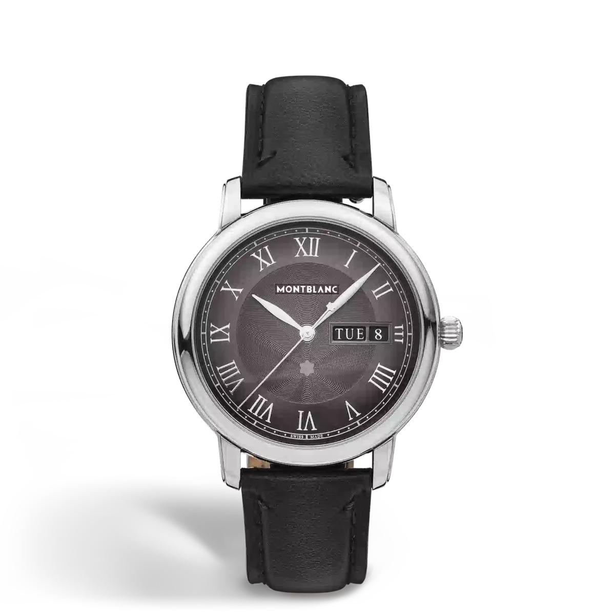 Die Montblanc Star Legacy Automatic Day & Date hebt die edelsten Designcodes des Hauses auf ein neues Niveau der Eleganz. Der Zeitmesser präsentiert sich mit einem anthrazitfarbenen Sfumato-Zifferblatt mit explodierendem Stern-Guilloché-Motiv, einem Filet Sauté, rhodinierten römischen Ziffern, blattförmigen Zeigern und zeigt auf einfache, elegante Weise die Stunden, Minuten, Sekunden, den Tag in französischer oder englischer Sprache und das Datum an. Dieses Modell wird vom Automatikwerk MB 24.28 angetrieben und befindet sich in einem 39 mm großen, kieselsteinförmigen Edelstahlgehäuse mit offenem Gehäuseboden, der den Blick auf die mit dem Montblanc Emblem verzierte Schwungmasse freigibt. Das austauschbare Armband aus anthrazitfarbenem Kalbsleder wurde speziell von Marco Tomasetta, dem künstlerischen Leiter von Montblanc, entworfen, der sich von den Federn der Schreibgeräte des Hauses inspirieren ließ, die sich durch ihre spitze Form auszeichnen und durch einen vertikalen Sfumato-Effekt veredelt sind. Ident-Nr. MB134296 Bandanstoßbreite 19 mm