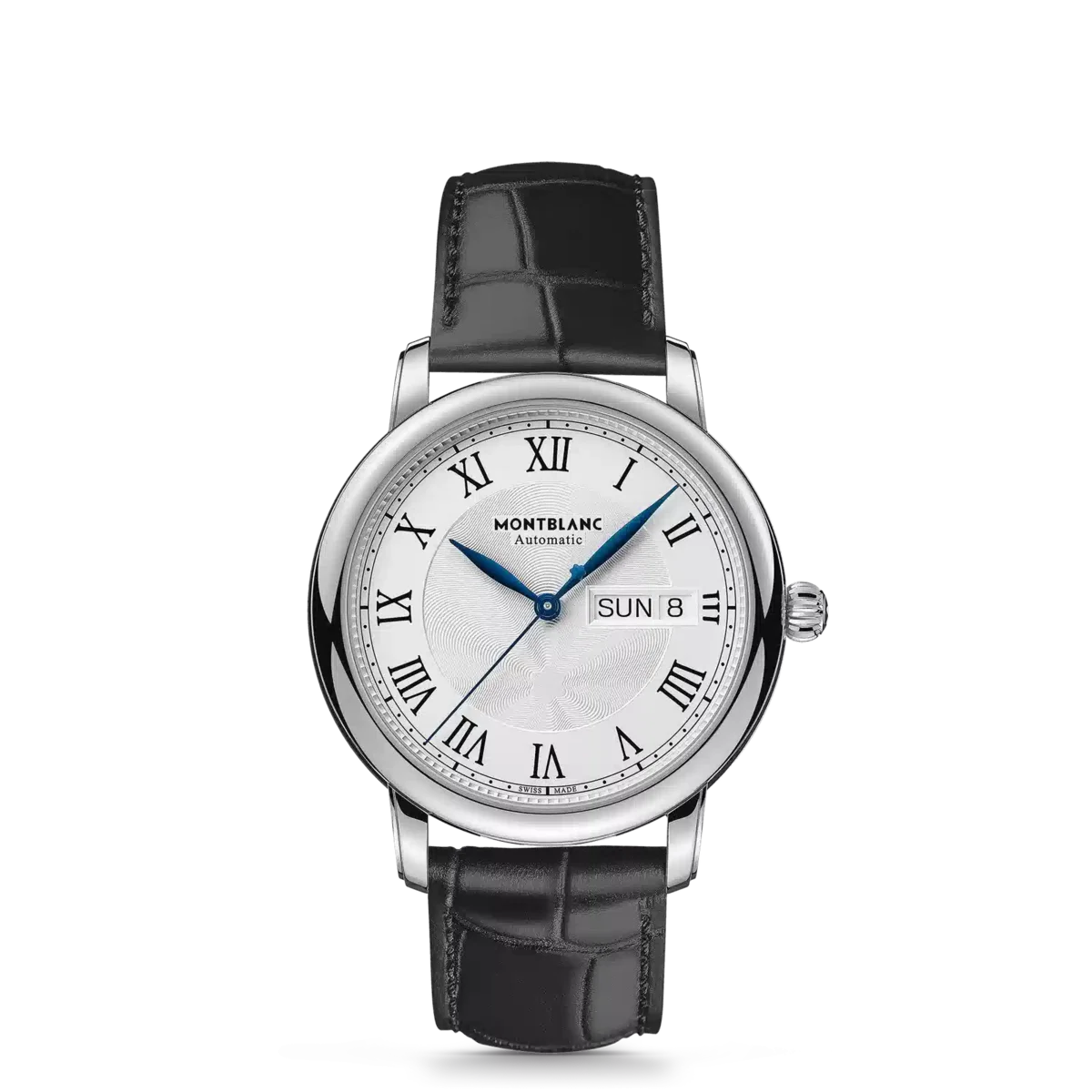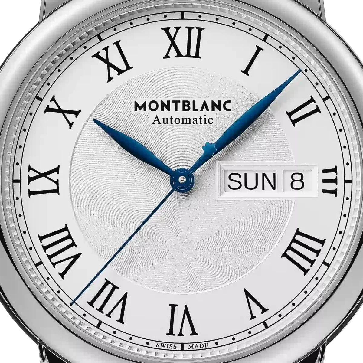 Die Montblanc Star Legacy Kollektion ist inspiriert vom Erbe von Minerva und den Taschenuhren des Unternehmens, die im späten 19. und frühen 20. Jahrhundert hergestellt wurden.Entsprechend den Designvorgaben der Produktlinie verfügt die Montblanc Star Legacy Automatic Day & Date über ein raffiniertes silberweißes Zifferblatt mit dem Montblanc-Guilloché-Muster „Exploding Star“, arabischen Ziffern, blattförmigen Zeigern, einem „Filet Sauté“-Guilloché-Motiv und einer Eisenbahnminuterie. Die Uhr ist mit dem Automatikwerk MB 24.28 ausgestattet und verfügt über eine Stunden-, Minuten- und Sekundenanzeige in der Mitte sowie eine Tages- und Datumsanzeige in einem Fenster bei 3 Uhr. Sie wird in einem 39-mm-Edelstahlgehäuse geliefert und ist mit einem schwarzen Kalbslederarmband mit Alligatorprägung ausgestattet. Ident-Nr. MB128686