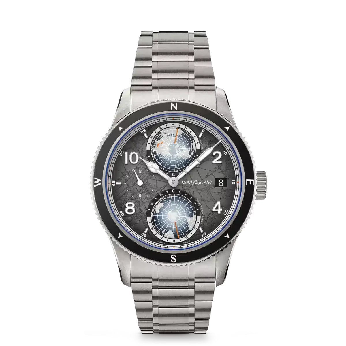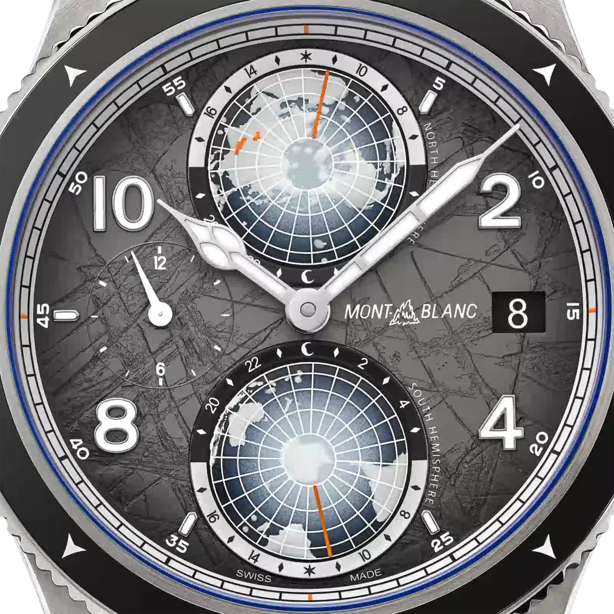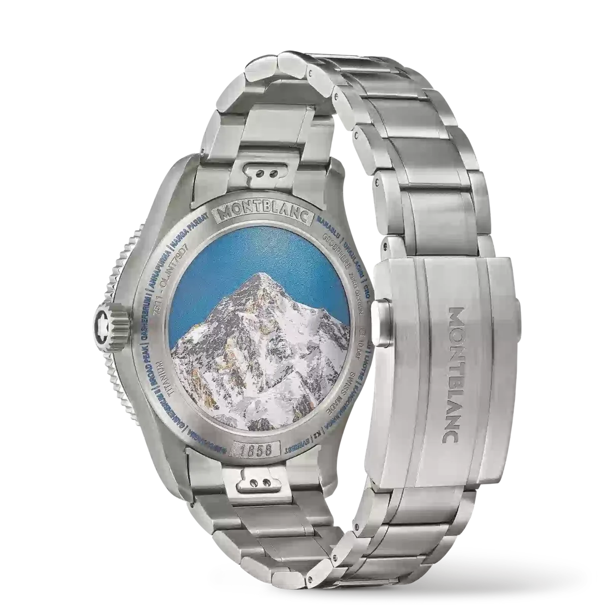 Als Hommage an die höchsten Gipfel der Welt und die Alpinisten, die es wagen, sie unter extremen Bedingungen zu besteigen, ist diese Montblanc 1858 Geosphere 0 Oxygen The 8000 in einem 42-mm-Titangehäuse untergebracht, das völlig sauerstofffrei ist. Dies hat für Entdecker mehrere Vorteile, da es Beschlagen verhindert und Oxidation verhindert, wodurch das Uhrwerk länger hält und eine höhere Präzision gewährleistet ist. Der Zeitmesser wird vom Automatikwerk MB 29.25 mit Manufaktur-Weltzeitkomplikation angetrieben, das die Zeit der 24-Stunden-Zonen auf den leuchtenden Kontinenten der drehbaren 3D-Globen der nördlichen und südlichen Hemisphäre, Tag- und Nachtanzeigen, eine Dualzeitanzeige und ein Datum anzeigt. Die Uhr verfügt außerdem über eine geriffelte, bidirektionale schwarze Keramiklünette mit lumineszierenden Himmelsrichtungen, ein sfumato-dunkelgraues Zifferblatt mit Gletschermuster und orangefarbenen Akzenten sowie ein austauschbares Titanarmband mit einem Verjüngungs- und Feineinstellungssystem. Der Gehäuseboden dieses Modells ist mit einer 3D-Lasergravur des K2 versehen, die mit unglaublicher Farbgebung, Tiefe und Realismus dargestellt ist. Ident-Nr. MB130982
